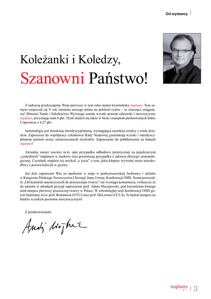 Od wydawcy Koleżanki i Koledzy, Szanowni Państwo! Z radością przekazujemy Wam pierwszy w tym roku numer kwartalnika implants. Tym samym rozpoczął się 9. rok istnienia naszego pisma na polskim rynku – to znaczące osiągnięcie! Minister Nauki i Szkolnictwa Wyższego uznała wysoki poziom edytorski i merytoryczny implants, przyznając nam 6 pkt. Tytuł znalazł się także w bazie czasopism punktowanych Index Copernicus z 4,27 pkt. Imlantologia jest dziedziną interdyscyplinarną, wymagającą szerokiej wiedzy z wielu dziedzin. Zaproszeni do współpracy członkowie Rady Naukowej gwarantują wysoki i interdyscyplinarny poziom oceny zamieszczanych artykułów. Zapraszamy do publikowania na łamach implants! Aktualny numer zawiera m.in. opis przypadku odbudowy protetycznej na pojedynczym „centralnym” implancie w żuchwie oraz prezentację przypadku z zakresu chirurgii stomatologicznej. Czytelnik znajdzie też artykuł „z życia” o tym, jakie kłopoty wywołać może nieszkodliwy z pozoru kolczyk w języku. Już dziś zapraszam Was na spotkanie w maju w podwarszawskiej Jachrance i udziału w Kongresie Polskiego Towarzystwa Chirurgii Jamy Ustnej, Konferencji OSIS. Temat przewodni „Od komórek macierzystych do przeszczepu twarzy” nie wymaga komentarza, zwłaszcza że do udziału w obradach przyjął zaproszenie prof. Adam Maciejewski, pod kierunkiem którego miał miejsce pierwszy przeszczep twarzy w Polsce. W równloległej sesji Konferencji OSIS gościć będziemy m.in. prof. Romanosa (NYU) oraz prof. McLarena (UCLA). To będzie kongres na bardzo wysokim poziomie merytorycznym! Z pozdrowieniami implants 1_2014 3