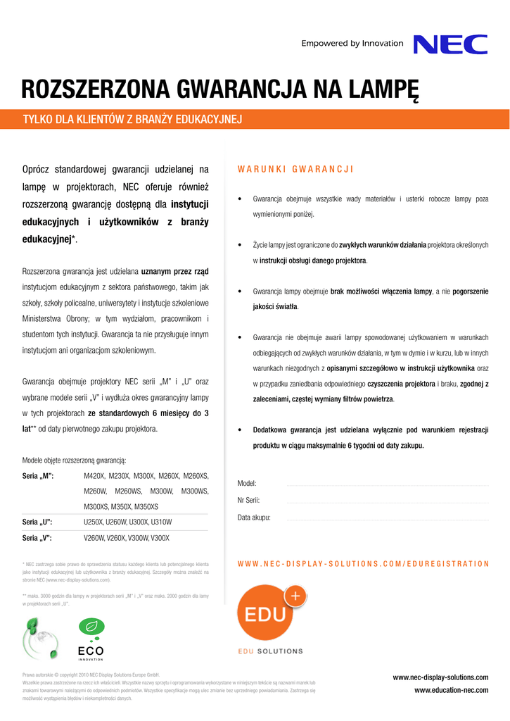 ROZSZERZONA GWARANCJA NA LAMPĘ tylko dla klientów z branży edukacyjnej Oprócz standardowej gwarancji udzielanej na WARUNKI GWARANCJI lampę w projektorach, NEC oferuje również rozszerzoną gwarancję dostępną dla instytucji • wymienionymi poniżej. edukacyjnych i użytkowników z branży edukacyjnej*. Gwarancja obejmuje wszystkie wady materiałów i usterki robocze lampy poza • instytucjom edukacyjnym z sektora państwowego, takim jak Życie lampy jest ograniczone do zwykłych warunków działania projektora określonych • Gwarancja lampy obejmuje brak możliwości włączenia lampy, a nie pogorszenie szkoły, szkoły policealne, uniwersytety i instytucje szkoleniowe jakości światła. Ministerstwa Obrony; w tym wydziałom, pracownikom i studentom tych instytucji. Gwarancja ta nie przysługuje innym w instrukcji obsługi danego projektora. Rozszerzona gwarancja jest udzielana uznanym przez rząd • instytucjom ani organizacjom szkoleniowym. Gwarancja nie obejmuje awarii lampy spowodowanej użytkowaniem w warunkach odbiegających od zwykłych warunków działania, w tym w dymie i w kurzu, lub w innych warunkach niezgodnych z opisanymi szczegółowo w instrukcji użytkownika oraz Gwarancja obejmuje projektory NEC serii „M” i „U” oraz w przypadku zaniedbania odpowiedniego czyszczenia projektora i braku, zgodnej z wybrane modele serii „V” i wydłuża okres gwarancyjny lampy zaleceniami, częstej wymiany filtrów powietrza. w tych projektorach ze standardowych 6 miesięcy do 3 lat** od daty pierwotnego zakupu projektora. • Dodatkowa gwarancja jest udzielana wyłącznie pod warunkiem rejestracji produktu w ciągu maksymalnie 6 tygodni od daty zakupu. Modele objęte rozszerzoną gwarancją: Seria „M”: M420X, M230X, M300X, M260X, M260XS, M260W, M300XS, M350X, M350XS Seria „U”: U250X, U260W, U300X, U310W Seria „V”: V260W, V260X, V300W, V300X M260WS, M300W, M300WS, * NEC zastrzega sobie prawo do sprawdzenia statusu każdego klienta lub potencjalnego klienta Model: Nr Serii: Data akupu: WWW.NEC-DISPLAY-SOLUTIONS.COM/EDUREGISTRATION jako instytucji edukacyjnej lub użytkownika z branży edukacyjnej. Szczegóły można znaleźć na stronie NEC (www.nec-display-solutions.com). ** maks. 3000 godzin dla lampy w projektorach serii „M” i „V” oraz maks. 2000 godzin dla lamy w projektorach serii „U”. ECO INNOVATION Prawa autorskie © copyright 2010 NEC Display Solutions Europe GmbH. Wszelkie prawa zastrzeżone na rzecz ich właścicieli. Wszystkie nazwy sprzętu i oprogramowania wykorzystane w niniejszym tekście są nazwami marek lub znakami towarowymi należącymi do odpowiednich podmiotów. Wszystkie specyfikacje mogą ulec zmianie bez uprzedniego powiadamiania. Zastrzega się możliwość wystąpienia błędów i niekompletności danych. www.nec-display-solutions.com www.education-nec.com
