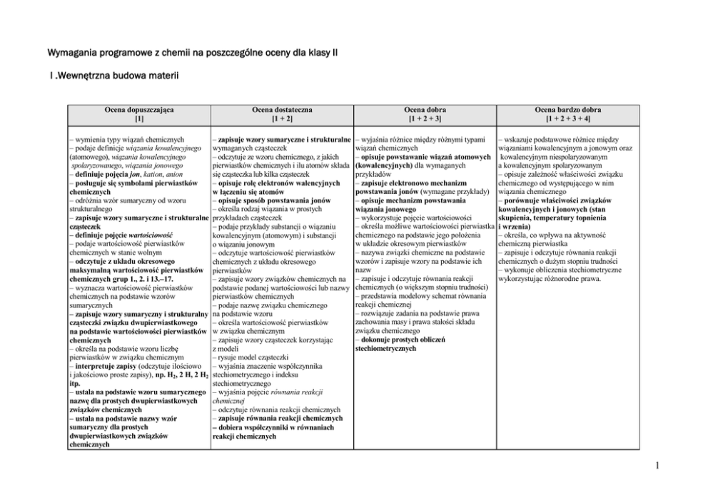 1 Wymagania programowe z chemii na poszczególne oceny dla