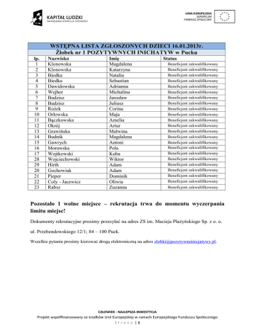 WSTĘPNA LISTA ZGŁOSZONYCH DZIECI 16.01.2013r. Żłobek nr 1 POZYTYWNYCH INICHATYW w Pucku lp. 1 2 3 4 5 6 7 8 9 10 11 12 13 14 15 16 17 28 29 20 21 22 23 Nazwisko Klonowska Klonowska Biedka Biedka Dawidowska Wejher Budzisz Budzisz Rożek Orłowska Bączkowska Okrój Grawińska Budnik Gawrych Morawska Wojtkowski Wojciechowski Hirth Gochowiak Pieper Coly - Jacewicz Rabsz Imię Magdalena Katarzyna Natalia Sebastian Adrianna Michalina Jarosław Juliusz Corina Maja Amelia Artur Malwina Magdalena Antoni Pola Kuba Wiktor Adam Adam Dominik Oliwia Zuzanna Status Beneficjent zakwalifikowany Beneficjent zakwalifikowany Beneficjent zakwalifikowany Beneficjent zakwalifikowany Beneficjent zakwalifikowany Beneficjent zakwalifikowany Beneficjent zakwalifikowany Beneficjent zakwalifikowany Beneficjent zakwalifikowany Beneficjent zakwalifikowany Beneficjent zakwalifikowany Beneficjent zakwalifikowany Beneficjent zakwalifikowany Beneficjent zakwalifikowany Beneficjent zakwalifikowany Beneficjent zakwalifikowany Beneficjent zakwalifikowany Beneficjent zakwalifikowany Beneficjent zakwalifikowany Beneficjent zakwalifikowany Beneficjent zakwalifikowany Beneficjent zakwalifikowany Beneficjent zakwalifikowany Pozostało 1 wolne miejsce – rekrutacja trwa do momentu wyczerpania limitu miejsc! Dokumenty rekrutacyjne prosimy przesyłać na adres ZS im. Macieja Płażyńskiego Sp. z o. o. ul. Przebendowskiego 12/1; 84 – 100 Puck. Wszelkie pytania prosimy kierować drogą elektroniczną na adres [email protected]. CZŁOWIEK - NAJLEPSZA INWESTYCJA Projekt współfinansowany ze środków Unii Europejskiej w ramach Europejskiego Funduszu Społecznego S t r o n a |1 CZŁOWIEK - NAJLEPSZA INWESTYCJA Projekt współfinansowany ze środków Unii Europejskiej w ramach Europejskiego Funduszu Społecznego S t r o n a |2