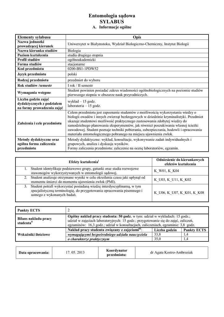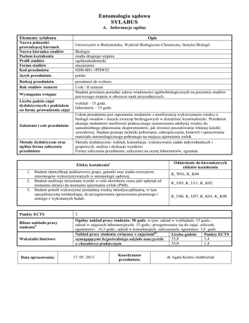 Entomologia sądowa SYLABUS A. Informacje ogólne Elementy sylabusu Nazwa jednostki prowadzącej kierunek Nazwa kierunku studiów Poziom kształcenia Profil studiów Forma studiów Kod przedmiotu Język przedmiotu Rodzaj przedmiotu Rok studiów /semestr Wymagania wstępne Liczba godzin zajęć dydaktycznych z podziałem na formy prowadzenia zajęć Założenia i cele przedmiotu Metody dydaktyczne oraz ogólna forma zaliczenia przedmiotu Opis Uniwersytet w Białymstoku, Wydział Biologiczno-Chemiczny, Instytut Biologii Biologia studia drugiego stopnia ogólnoakademicki stacjonarne 0200-BS1-1PDW52 polski przedmiot do wyboru I rok / II semestr Student powinien posiadać zakres wiadomości ogólnobiologicznych na poziomie studiów pierwszego stopnia w obszarze nauk przyrodniczych. wykład – 15 godz. laboratoria – 15 godz. Celem przedmiotu jest zapoznanie studentów z możliwością wykorzystania wiedzy o biologii owadów i innych zwierząt bezkręgowych w dziedzinie kryminalistyki. Przedmiot ukazuje studentowi możliwość praktycznego zastosowania zdobytej wiedzy do samodzielnego planowania eksperymentów, jak również poszukiwania własnej ścieżki zawodowej. Student poznaje techniki pobierania, zabezpieczania, hodowli i opracowania materiału entomologicznego pobranego na miejscu ujawnienia zwłok. Metody dydaktyczne: wykład, konsultacje, wykonywanie zadań indywidualnych i grupowych, analiza i dyskusja wyników. Formy zaliczenia przedmiotu: zaliczenie na ocenę laboratoriów, egzamin. Odniesienie do kierunkowych efektów kształcenia Efekty kształceniai 1. Student identyfikuje podstawowe grupy, gatunki oraz stadia rozwojowe stawonogów wykorzystywanych w entomologii sądowej. 2. Student analizuje otrzymane wyniki w celu określenia czasu jaki upłynął od momentu śmierci do momentu ujawnienia zwłok (PMI). 3. Student potrafi wykorzystać posiadaną wiedzę interdyscyplinarną, w tym specjalistyczną terminologię, do przygotowania opracowania pisemnego i ustnego z wykonanych badań. Punkty ECTS Bilans nakładu pracy studentaii Wskaźniki ilościowe Data opracowania: K_W01, K_K04 K_U03, K_U11, K_K02 K_U06, K_U07, K_K01, K_K08 2 Ogólny nakład pracy studenta: 50 godz. w tym: udział w wykładach: 15 godz.; udział w zajęciach laboratoryjnych: 15 godz.; przygotowanie się do zajęć, zaliczeń, egzaminów: 16,3 godz.; udział w konsultacjach, zaliczeniach, egzaminie: 3,8 godz. Nakład pracy studenta związany z zajęciamiiii: Liczba godzin Punkty ECTS 33,8 1,4 wymagającymi bezpośredniego udziału nauczyciela 35,0 1,4 o charakterze praktycznym 17. 05. 2013 Koordynator przedmiotu: dr Agata Kostro-Ambroziak SYLABUS B. Informacje szczegółowe Elementy składowe sylabusu Nazwa przedmiotu Entomologia sądowa Kod przedmiotu Nazwa kierunku Nazwa jednostki prowadzącej kierunek Język przedmiotu 0200-BS1-1PDW52 Biologia, studia II stopnia Wydział Biologiczno-Chemiczny UwB, Instytut Biologii polski Rok studiów/ semestr I rok / II semestr Liczba godzin zajęć dydaktycznych oraz forma prowadzenia zajęć Prowadzący 15 godz., wykład Treści merytoryczne przedmiotu: Efekty kształcenia wraz ze sposobem ich weryfikacji Opis dr Agata Kostro-Ambroziak 1. Zarys historyczny entomologii sądowej oraz jej współczesne wykorzystanie w Polsce i na świecie. 2. Etapy sukcesji różnego typu zwłok 3. Czynniki wpływające na faunę zwłok. 4. Cykle życiowe gatunków nekrofagicznych. 5. Wykorzystywanie analiz DNA w entomologii sadowej. 6. Entomotoksykologia. Efekty kształcenia: 1. Student zna procesy i etapy rozkładu zwłok oraz związaną z nimi faunę nekrofagiczną 2. Student dostrzega potrzebę badań interdyscyplinarnych oraz aktualizacji wiedzy Sposoby weryfikacji: 1. Egzamin pisemny podsumowujący przedmiot (test zamknięty, pytania otwarte opisowe). Forma i warunki zaliczenia przedmiotu 1. Pozytywna ocena zaliczenia laboratoriów. 2. Pozytywna ocena egzaminu. Wykaz literatury podstawowej i uzupełniającej Literatura podstawowa: 1. Kaczorowska E., Draber-Mońko A. 2010. Wprowadzenie do entomologii sądowej. Wydawnictwo Uniwersytetu Gdańskiego. 2. Skowronek R., Chowaniec Cz. 2010. Polska entomologia sądowa – rys historyczny, stan obecny i perspektywy na przyszłość. Arch. Med. Sąd. Krym., ARCH. MED. SĄD., 55-58. 3. Błaszak Cz. 2011. Zoologia. Stawonogi. Tom 2(1). PWN Wydawnictwo Naukowe. 4. Literatura uzupełniająca: 1. Amendt J. i in. 2009. Current conceptions in Forensic Entomology. Springer. 2. Byrd J. H., Castner J/ L. 2009. Forensic entomology. The utility of arthropods in legal investigations. Second edition, CRC Press, Boca Raton, Londyn. SYLABUS C. Informacje szczegółowe Elementy składowe sylabusu Nazwa przedmiotu Entomologia sądowa Kod przedmiotu Nazwa kierunku Nazwa jednostki prowadzącej kierunek Język przedmiotu 0200-BS1-1PDW52 Biologia, studia II stopni Wydział Biologiczno-Chemiczny UwB, Instytut Biologii polski Rok studiów/ semestr I rok / II semestr Liczba godzin zajęć dydaktycznych oraz forma prowadzenia zajęć Prowadzący 15 godz., zajęcia terenowo-laboratoryjne Treści merytoryczne przedmiotu: 1. Opis dr Agata Kostro-Ambroziak 2. 3. Efekty kształcenia wraz ze sposobem ich weryfikacji Procedury postepowania w miejscu znalezienia zwłok (opis zwłok; dokumentacja fotograficzna; sposoby zbioru i etykietowania stawonogów znajdujących się na zwłokach i w siedlisku, zabezpieczanie materiału biologicznego do hodowli laboratoryjnej, charakterystyka ekologiczna siedliska; pozyskanie danych meteorologicznych). Analiza rozwoju stawonogów na zwłokach „świeżych” (określenie wieku stadiów preimaginalnych zabezpieczonych na zwłokach i w ich pobliżu; ustalenie wskaźników rozwojowych zabezpieczonych okazów; przyrównanie otrzymanych wskaźników do prawidłowości rozwoju ujętych w odpowiednim modelu rozwoju, m. in. do wykresów izomegalenicznych, izomorfenicznych) Analiza sukcesji stawonogów na zwłokach „starych” (identyfikacja takson
