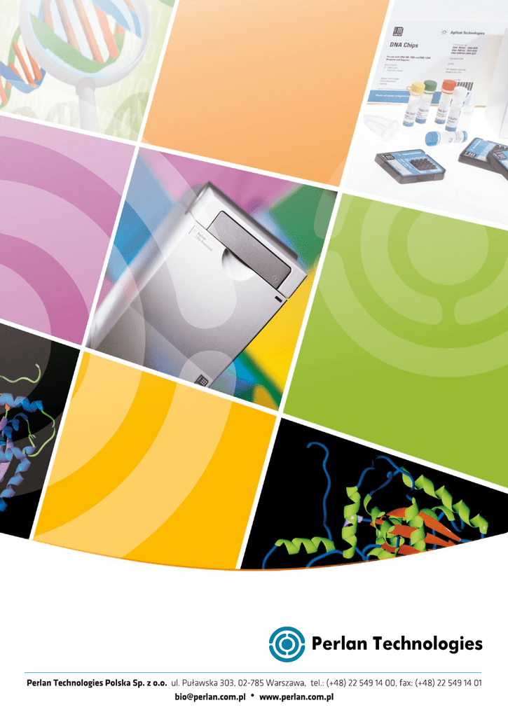 www.bio.perlan.com.pl Elektroforeza Bioanalizator 2100 – jedna platforma, wiele możliwości Bioanalyzer 2100 firmy Agilent jest pierwszym urządzeniem wykorzystującym technikę mikroprzepływów do analizy ilościowej oraz jakościowej DNA, RNA i białek, będącym doskonałą alternatywą dla brudnej i uciążliwej elektroforezy żelowej. Laboratoriom nie posiadającym aparatów do cytometrii przepływowej, umożliwia przeprowadzenie analizy komórek za pomocą modułu do wykonywania cytometrii, na tym samym urządzeniu. Wszechstronność ta czyni Bioanalyzer 2100 firmy Agilent niezastąpionym narzędziem dla biologów molekularnych i biochemików, a jego zastosowanie pozwala szybko uzyskać powtarzalne, wysokiej jakości dane w formie cyfrowej. Aplikacje na Bioanalizatorze: • Proste funkcje cytometrii przepływowej – liczenie komórek wyznakowanych fluorescencyjnie (wymagane min. 2500 komórek). • Analizy elektroforetyczne DNA, totalnego RNA, mRNA i mikroRNA z czułością 0,1ng/ µl, a białek 1pg/µl. • Czas analizy 30 minut. • Określenie jakości RNA – wyznaczanie współczynnika RIN. • Wymagany tylko 1 µl próby. TapeStation 2200. Elektroforeza żelowa. Nowe rozwiązanie do analizy ilości i jakości DNA, RNA i białek. TapeStation 2200 umożliwia całkowicie automatyczną elektroforezę żelową DNA, RNA i białek. Analiza jednej próbki trwa tylko 1 minutę. Aparat TapeStation 2200 sam nakłada, rozdziela, obrazuje i analizuje próbki. Gotowe zestawy odczynników oraz pełna automatyzacja elektroforezy zapewniają bezpieczeństwo, łatwość obsługi i powtarzalność wyników. Aparat TapeStation 2200 jest kompatybilny z tradycyjnymi 96-cio dołkowymi płytkami oraz pojedynczymi probówkami o objętości 0,2ml. Instrument automatycznie pobierze 1 lub 2µl próby wymagany do analizy. Każda próbka jest pobierana inną końcówką, co zabezpiecza przed fałszywymi wynikami i zanieczyszczeniem. Specjalnie zaprojektowane paski z żelem umożliwiają analizę dowolnej ilości próbek bez utraty niewykorzystanych odczynników. www.mikromacierze.com.pl Termocyklery SureCycler 8800 Nowy termocykler SureCycler 8800 umożliwia wykonywanie nawet najbardziej złożonych reakcji PCR. Dzięki modułowej budowie można w zależności od potrzeb zmienić blok grzejny. Proste i intuicyjne oprogramowanie ułatwia ustawienie projektu reakcji PCR. SureCycler zawiera fabrycznie wgrane protokoły wykorzystujące najpopularniejsze enzymy do PCR. Termocykler SureCycler 8800 jest dopasowany do Twoich potrzeb! Parametry techniczne czynią go liderem rynku termocyklerów. • Szybka zmiana temperatur – aż 6°C/s • Możliwość łatwej i szybkiej zmiany bloku na 96 lub 384 próbki. • Szeroki zakres objętości reakcji: 10-100μL dla bloku 96. dołkowego i 5-25μL dla 384. dołkowego • Jednorodność rozkładu temperatury na bloku grzejnym na poziomie ±0.4° przy 95°C • Dokładność nastawionej temperatury ±0.2° przy 95°C • Szeroki zakres gradientu 30°C bez utraty jednorodności temperatury • Wysokiej rozdzielczości ekran dotykowy • Intuicyjne i łatwe w użyciu oprogramowanie z inteligentnym kreatorem profili termicznych • Możliwość zapamiętania aż 10’000 programów • zdalny dostęp do urządzenia – możliwość sterowania w sieci lub telefonem komórkowym • 2 lata gwarancji i wsparcie aplikacyjne Real Time PCR Otwarte rozwiązania do Real Time PCR Termocyklery do Real Time PCR serii Mx umożliwiają przeprowadzanie wysokiej jakości reakcji QPCR dla wielu zastosowań. Użytkownik może planować eksperymenty wykorzystujące zarówno barwniki interkalujące, np. SYBR Green, jak i sondy hydrolizujące. Dzięki temu masz pewność, że uzyskane wyniki są wiarygodne. Termocyklery Mx cechuje: • wysoka czułość – możliwość wykrycia pojedynczych kopii DNA • szeroki zasięg dynamiczny – wykrywanie 10 rzędów wielkości ilości DNA • możliwość zastosowania dowolnych barwników • przyjazne dla użytkownika oprogramowanie dostarczające gotowe wyniki. Kompletne rozwiązanie do QPCR obejmuje również odczynniki z serii Brilliant II, które mogą być stosowane na urządzeniach wszystkich producentów. Dodatkowo dla szybkich termocyklerów są dedykowane odczynniki serii Brilliant III. Dobierz odpowiednie dla siebie odczynniki i otrzymaj wysokiej jakości wyniki. STRATAGENE www.bio.perlan.com.pl Mikromacierze Otwarte rozwiązanie do analizy mikromacierzy Skaner do mikromacierzy Agilent jest kluczowym elementem całego rozwiązania, zapewniającym wysokiej jakości wyniki. Wyposażony jest on w wysoko rozdzielczy system skanujący SureScan i podajnik na 48 slajdów. Dzięki zastosowaniu 60-merowych sond oligonukleotydowych syntetyzowanych in-situ, mikromacierze Agilent zapewniają nadzwyczajną czułość i powtarzalność wyników, jak również sześciokrotnie wyższy stosunek sygnału do szumu niż macierze innych producentów. Dzięki temu użytkownicy mogą badać nawet cały genom lub transkryptom w pojedynczej analizie. Potrzebujesz jedynie 10 ng RNA. Zaplanuj eksperymenty jedno- lub dwukolorowe w zależności od własnych potrzeb. Mikromacierze Agilent można stosować w wielu badaniach, m.in.: • analiza ekspresji genów – zbadaj transkrypcję całego genomu dowolnego organizmu • aCGH (Comparative Genomic Hybridization) – wykryj aberracje chromosomowe i określ ilość powtórzonych kopii genów na poziomie całego genomu • profilowanie miRNA – odkryj nowe szlaki regulacji ekspresji genów. Zidentyfikuj zmiany w profilu ekspresji miRNA w sposób pewny i jednoznaczny • chromatynoimmunoprecypitacja – poznaj nowe zależności w regulacji ekspresji genów, replikacji, naprawy DNA zależne od oddziaływań DNA-białko • badanie metylacji DNA – określ stopień metylacji rozmieszczonych w całym genomie wysp CpG i sekwencji promotorowych i odkryj ich wpływ na ekspresję genów. W pracy z wykorzystaniem mikromacierz