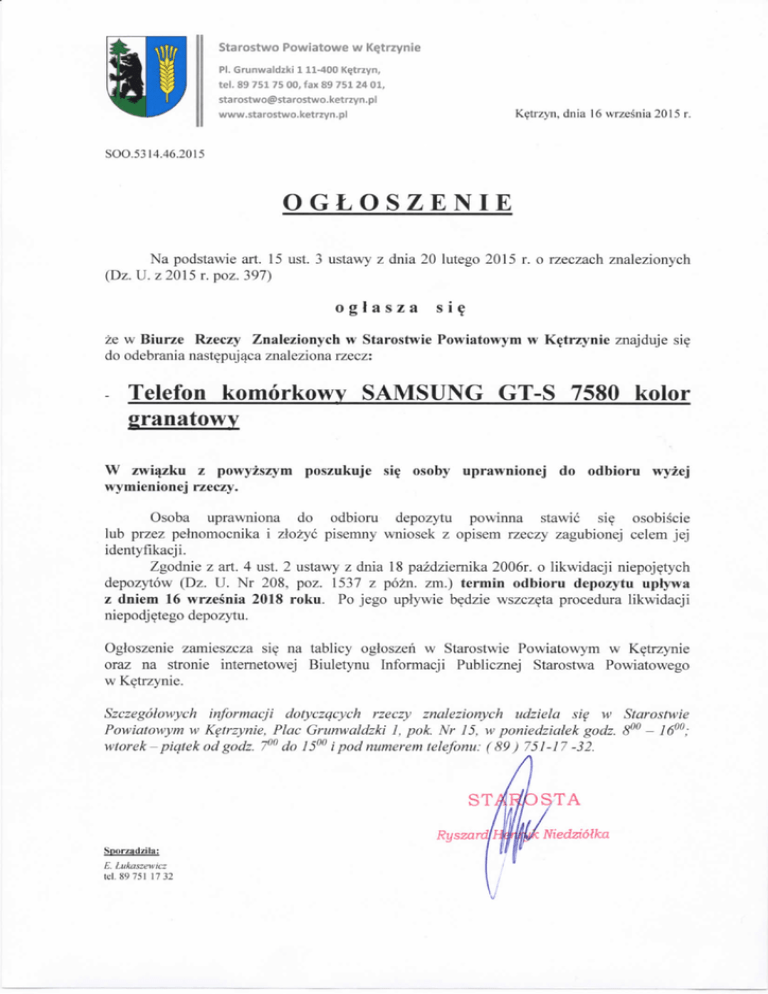 Starostwo Powiatowe w Ketrzynie PI. Grunwaldzki 111-400 K^trzyn, tel. 89 751 75 00, fax 89 751 24 01, sta rostwo@ sta rostwo. ketrzyn. pi www. sta rostwo. ketrzyn. pi Ketrzyn, dnia 16 wrzesnia 2015 r. SOO.5314.46.2015 OGLOSZENIE Na podstawie art. 15 ust. 3 ustawy z dnia 20 lutego 2015 r. o rzeczach znalezionych (Dz. U.z 2015 r.poz. 397) o gIa sz a si£ ze w Biurze Rzeczy Znalezionych w Starostwie Powiatowym w K^trzynie znajduje sie do odebrania nastepujaca znaleziona rzecz: Telefon komorkowy SAMSUNG GT-S 7580 kolor granatowy W / u i a / U u z powyzszym poszukuje si$ osoby uprawnionej do odbioru wyzej wymienionej rzeczy. Osoba uprawniona do odbioru depozytu powinna stawic sie osobiscie lub przez pelnomocnika i zlozyc pisemny wniosek z opisem rzeczy zagubionej celem jej identyfikacji. Zgodnie z art. 4 ust. 2 ustawy z dnia 18 pazdziernika 2006r. o likwidacji niepojetych depozytow (Dz. U. Nr 208, poz. 1537 z pozn. zm.) termin odbioru depozytu uplywa z dniem 16 wrzesnia 2018 roku. Po jego uplywie b^dzie wszcz^ta procedura likwidacji niepodj^tego depozytu. Ogloszenie zamieszcza sie na tablicy ogloszeh w Starostwie Powiatowym w Ketrzynie oraz na stronie internetowej Biuletynu Informacji Publicznej Starostwa Powiatowego w Ketrzynie. Szczegolowych Informacji dotyczqcych rzeczy znalezionych udziela si$ w Starostwie Powiatowym w Ketrzynie, Plac Grunwaldzki 1, pok. Nr 15, w poniedzialek godz. 8°° - 16°°; wtorek - piqtek od godz. 7°° do 15°° i pod numerem telefonu: (89) 751-17-32. Spotvad/itaj E. Lukaszewicz le!. 89751 1732