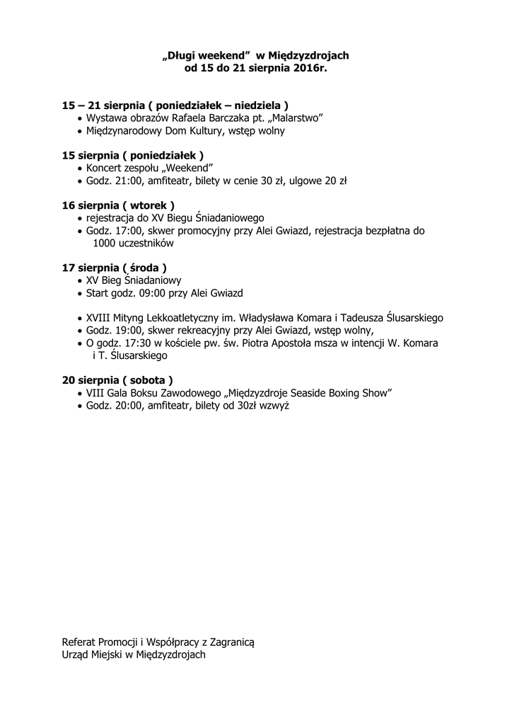 „Długi weekend” w Międzyzdrojach od 15 do 21 sierpnia 2016r. 15 – 21 sierpnia ( poniedziałek – niedziela ) Wystawa obrazów Rafaela Barczaka pt. „Malarstwo” Międzynarodowy Dom Kultury, wstęp wolny 15 sierpnia ( poniedziałek ) Koncert zespołu „Weekend” Godz. 21:00, amfiteatr, bilety w cenie 30 zł, ulgowe 20 zł 16 sierpnia ( wtorek ) rejestracja do XV Biegu Śniadaniowego Godz. 17:00, skwer promocyjny przy Alei Gwiazd, rejestracja bezpłatna do 1000 uczestników 17 sierpnia ( środa ) XV Bieg Śniadaniowy Start godz. 09:00 przy Alei Gwiazd XVIII Mityng Lekkoatletyczny im. Władysława Komara i Tadeusza Ślusarskiego Godz. 19:00, skwer rekreacyjny przy Alei Gwiazd, wstęp wolny, O godz. 17:30 w kościele pw. św. Piotra Apostoła msza w intencji W. Komara i T. Ślusarskiego 20 sierpnia ( sobota ) VIII Gala Boksu Zawodowego „Międzyzdroje Seaside Boxing Show” Godz. 20:00, amfiteatr, bilety od 30zł wzwyż Referat Promocji i Współpracy z Zagranicą Urząd Miejski w Międzyzdrojach