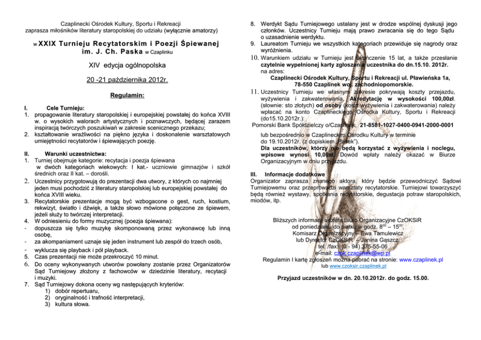 Czaplinecki Ośrodek Kultury, Sportu i Rekreacji zaprasza miłośników literatury staropolskiej do udziału (wyłącznie amatorzy) w XXIX Turnieju Recytatorskim i Poezji Śpiew anej im. J. Ch. Paska w Czaplinku XIV edycja ogólnopolska 20 -21 października 2012r. Regulamin: I. Cele Turnieju: 1. propagowanie literatury staropolskiej i europejskiej powstałej do końca XVIII w. o wysokich walorach artystycznych i poznawczych, będącej zarazem inspiracją twórczych poszukiwań w zakresie scenicznego przekazu; 2. kształtowanie wrażliwości na piękno języka i doskonalenie warsztatowych umiejętności recytatorów i śpiewających poezję. poezję. II. Warunki uczestnictwa: 1. Turniej obejmuje kategorie: recytacja i poezja śpiewana w dwóch kategoriach wiekowych: I kat.- uczniowie gimnazjów i szkół średnich oraz II kat. – dorośli. 2. Uczestnicy przygotowują do prezentacji dwa utwory, z których co najmniej jeden musi pochodzić z literatury staropolskiej lub europejskiej powstałej do końca XVIII wieku. 3. Recytatorskie prezentacje mogą być wzbogacone o gest, ruch, kostium, rekwizyt, światło i dźwięk, a także słowo mówione mówione połączone ze śpiewem, jeżeli służy to twórczej interpretacji. 4. W odniesieniu do formy muzycznej (poezja śpiewana): - dopuszcza się tylko muzykę skomponowaną przez wykonawcę lub inną osobę, - za akompaniament uznaje się jeden instrument lub zespół do trzech osób, - wyklucza wyklucza się playback i pół playback. 5. Czas prezentacji nie może przekroczyć 10 minut. 6. Do oceny wykonywanych utworów powołany zostanie przez Organizatorów Sąd Turniejowy złożony z fachowców w dziedzinie literatury, recytacji i muzyki. 7. Sąd Turniejowy dokona oceny wg następujących kryteriów: 1) dobór repertuaru, 2) oryginalność i trafność interpretacji, 3) kultura słowa. 8. Werdykt Sądu Turniejowego ustalany jest w drodze wspólnej dyskusji jego członków. Uczestnicy Turnieju mają prawo zwracania się do tego Sądu o uzasadnienie werdyktu. 9. Laureatom Turnieju we wszystkich kategoriach przewiduje się nagrody oraz wyróżnienia. 10. Warunkiem udziału w Turnieju jest ukończenie 15 lat, a także przesłanie czytelnie wypełnionej karty zgłoszenia uczestnika do dn.15.10. 2012r. na adres: Czaplinecki Ośrodek Kultury, Sportu i Rekreacji ul. Pławieńska 1a, 78-550 Czaplinek woj. zachodniopomorskie. 11. Uczestnicy Turnieju we własnym zakresie pokrywają koszty przejazdu, wyżywienia i zakwaterowania. Akredytację w wysokości 100,00zł. (słownie: sto złotych) od osoby (koszt wyżywienia i zakwaterowania) należy wpłacać na konto Czaplineckiego Ośrodka Kultury, Sportu i Rekreacji (do15.10.2012r.): Pomorski Bank Spółdzielczy o/Czaplinek, 21-8581-1027-0400-0941-2000-0001 lub bezpośrednio w Czaplineckim Ośrodku Kultury w terminie do 19.10.2012r. (z dopiskiem „Pasek”). Dla uczestników, którzy nie będą korzystać z wyżywienia i noclegu, wpisowe wynosi 10,00zł. Dowód wpłaty należy okazać w Biurze Organizacyjnym w dniu przyjazdu. III. Informacje dodatkowe Organizator zaprasza znanego aktora, który będzie przewodniczyć Sądowi Turniejowemu oraz przeprowadzi warsztaty recytatorskie. Turniejowi towarzyszyć będą również wystawy, spotkania recytatorskie, degustacja potraw staropolskich, miodów, itp. Bliższych informacji udziela Biuro Organizacyjne CzOKSiR od poniedziałku do piątku w godz. 800 – 1500, Komisarz Organizacyjny – Ewa Tamulewicz lub Dyrektor CzOKSiR – Janina Gąszcz. tel. /fax: (0 - 94) 375-55-06 e-mail: [email protected] Regulamin I kartę zgłoszeń można pobrać na stronie: www.czaplinek.pl lub www.czoksir.czaplinek.pl Przyjazd uczestników w dn. 20.10.2012r. do godz. 15.00. XXIX Turniej Recytatorski i Poezji Śpiewanej im. J. Ch. Paska XIV edycja ogólnopolska Organizator: Czaplinecki Ośrodek Kultury, Sportu i Rekreacji Współorganizator: Zamek Książąt Pomorskich w Szczecinie, Gmina Czaplinek. Czaplinek, 20 - 21 października 2012r.