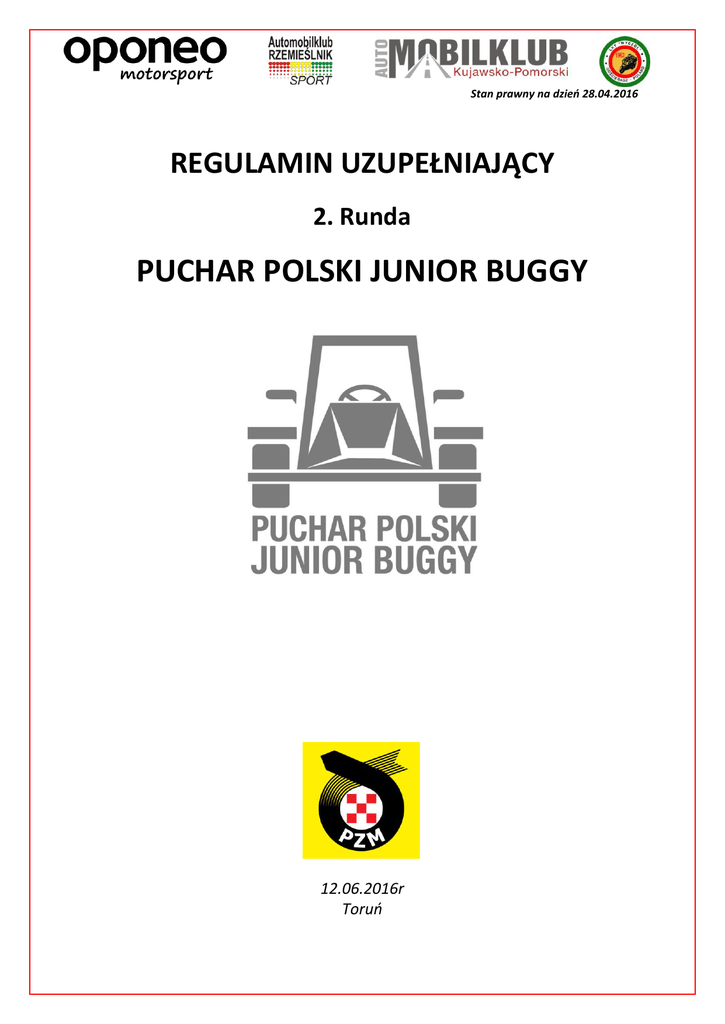 Stan prawny na dzień 28.04.2016 REGULAMIN UZUPEŁNIAJĄCY 2. Runda PUCHAR POLSKI JUNIOR BUGGY 12.06.2016r Toruń I. ZAWODY I ORGANIZATOR 1. Zawody stanowią 2. Rundę Pucharu Polski Junior Buggy 2016 (zwane dalej PPJB). 2. Niniejsze zawody organizowane są na podstawie: ZAWODY ZORGANIZOWANE ZGODNIE Z MIĘDZYNARODOWYM KODEKSEM SPORTOWYM FIA I JEGO ZAŁĄCZNIKAMI ORAZ REGULAMINEM KRAJOWYM SPORTU SAMOCHODOWEGO PZM - Międzynarodowy Kodeks Sportu Samochodowego FIA wraz z załącznikami; - Regulamin Pucharu Polski Junior Buggy 2016 zatwierdzonego przez GKSS ZO PZM Warszawa; - Komunikaty OKSS ZO PZM; - Regulamin Ochrony Środowiska w Sportach Motorowych; - Regulamin Medyczny PZM; - Niniejszy regulamin Uzupełniający. 3. Organizatorem zawodów jest: Stowarzyszenie OPONEO Motorsport ul. Łucka nr 7 85-185 Bydgoszcz Tel. +48 500 867 659 www.rallycross.com.pl Współorganizatorzy: Automobilklub Rzemieślnik ul. Żytnia nr 46 01-198 Warszawa Tel. +48 22 632 81 49 www.rallycross.pl Automobilklub Kujawsko-Pomorski ul. Chodkiewicza nr 30 85-064 Bydgoszcz Tel. +48 791 777 111 www.akkp.pl Przy współpracy z: LKT "Wyczół" Gościeradz 86-011 Wtelno Tel. +48 604 112 025 4. Termin zawodów 12 czerwiec 2016 roku. 5. Miejsce rozgrywania zawodów: OPONEO Moto-park Toruń ul. Bielańska 66. 6. Wiza OKSS PZM: S/188/2016 II. WŁADZE ZAWODÓW Zespół Sędziów Sportowych Przewodniczący Członek Krzysztof Studziński I-003/12 Marcin Bilski I-519/12 2 Członek Magdalena Bajerska I-484/12 Krzysztof Szeszko I-432/12 Dyrektor Zawodów Mirosław Urbaczewski I-560/13 Dyrektor Wyścigu Radosław Chrzanowski I-468/12 Lekarz Zawodów lek. med. Elżbieta Buszko-Sikora Delegat Techniczny GKSS PZM Kierownik zabezpieczenia i trasy tel. 606 911 003 Tomasz Błażejewski II-02014 Stanisław Ulandowski 16/2011/S/K/M Karol Marasek I-461/12 Przemysław Juszczyk II-02031 Kierownik Biura Zawodów Adam Jaros II-02048 Oficer ds. Kontaktu z Zawodnikami Marta Kobus II-02003 Miłosz Ostrowski CH 02/15 Komisarz Ochrony Środowiska Kierownik BK Sędzia Techniczny BK Kierownik Chronometrażu tel. 724 402 476 Pełna lista obsady sędziowskiej zostanie zweryfikowana i zatwierdzona przez OKSS PZM na 48 godzin przez badaniem kontrolnym i potwierdzona przez zespół sędziów sportowych po odbiorze administracyjnym. III. PROGRAM ZAWODÓW Niedziela (12.06.2016) : 7:00 Otwarcie Biura Zawodów 7:00-9:00 Odbiór Administracyjny 7:10-9:00 Badania Kontrolne 9:20 I posiedzenie Zespołu Sędziów Sportowych 9:50 Odprawa z zawodnikami, losowanie pozycji na liście startowej 10:15-10:40 Trening Wolny 10:30 II posiedzenie Zespołu Sędziów Sportowych 11:00 Biegi Kwalifikacyjne 14:45 III posiedzenie Zespołu Sędziów Sportowych 15:00 Półfinały A,B 15 min po Półfinałach – IV posiedzenie Zespołu Sędziów Sportowych 16:00 Finały 15 min po Finałach – V posiedzenie Zespołu Sędziów Sportowych 17:00 Wręczenie nagród 3 30 min po Wręczeniu nagród zamknięcie Biura Zawodów IV. POSTANOWIENIA OGÓLNE 1. Wszystkich zawodników/kierowców obowiązuje całkowity zakaz treningów na torze poza wyznaczonymi godzinami, jak również na terenie dróg dojazdowych i parku maszyn, pod rygorem kary (decyzja Dyrektora zawodów lub ZSS). 2. Treningi wolne zostaną zorganizowane wg harmonogramu zawodów. Będą miały formę wjazdu na 3 okrążenia toru – bez Joker Lap , z którym to kierowca zapoznaje się zjeżdżając z toru. W czasie przeznaczonym na trening wolny, ilość wyjazdów dowolna (pierwszeństwo mają kierowcy, którzy nie odbyli treningu). 3. Elektroniczny formularz zgłoszenia wypełnia zawodnik wyłącznie poprzez stronę internetową Inside PZM lub stronę internetową zawodów/organizatora (w przypadku zawodników posiadających licencję innego ASN-u). Po prawidłowym wypełnieniu, dołączeniu potwierdzenia wpłaty wpisowego i zatwierdzeniu zgłoszenie zostanie automatycznie wysłane pocztą elektroniczną do danego organizatora oraz do zawodnika na wskazany przez niego w formularzu adres e-mail. Zgłoszenie będzie przyjęte tylko i wyłącznie po opłaceniu pełnej kwoty wpisowego. 4. Zgłoszenia: https://inside.pzm.pl 5. Terminy zgłoszeń: - 1 termin zgłoszeń upływa z dniem: 02.06.2016 (Zgłoszenie dostarczone do organizatora i wpłata zaksięgowana na koncie wskazanym przez Organizatora) - 2 termin zgłoszeń upływa z dniem: 05.06.2016 6. Wysokość wpisowego z reklamą dodatkową organizatora wynosi: Junior Buggy I termin zgłoszeń 150,- PLN II termin zgłoszeń 225,- PLN Wpłaty wpisowego należy dokonać na rachunek: Bank Millennium S.A. 94 1160 2202 0000 0002 7467 7892 7. Podział na klasy: - Junior Buggy - zgodne z regulaminem technicznym PPJB 2016 (zał. nr 1) 8. Na polach startowych kierowcy zabrania się korzystania z pomocy osób nieuprawnionych, prób startu i grzania opon. 9. We wszystkich miejscach, w których sprzęt jest serwisowany oraz w miejscach, w których używane są płyny inne niż czysta woda, obowiązkowe jest używanie mat ekologicznych lub powierzchni składającej się z warstwy chłonnej i nieprzepuszczalnej, lub płachty płynoszczelnej, lub folii o minimalnej grubości 0,5 mm. 10. Odprawa z zawodnikami odbędzie się przed Biurem Zawodów. Obecność na odprawie jest obowiązkowa – brak podpisu na liście, będzie skutkować nałożeniem kary na zawodnika (do decyzji Zespołu Sędziów Sportowych). 11. Biegi kwalifikacyjne odbędą się na dystansie czterech okrążeń toru. Obowiązuje jednokrotny przejazd przez odcinek „Joker Lap” na dowolnym okrążeniu. 4 12. Odbędą się dwa biegi półfinałowe A, B oraz finał na dystansie sześciu okrążeń toru. „Joker lap“ należy przejechać obowiązkowo jeden raz. 13. Park Zamknięty jest obowiązkowy dla wszystkich uczestników biegu finałowego. 14. Nagrody wg. pkt. 17 regulaminu ramowego PPJB 2016. 15. Punktacja i klasyfikacje w rundzie prowadzone są wg. pkt. 16 regulaminu ramowego PPJB 2016. 16. Ubezpieczenie wg. pkt. 9 regulamin