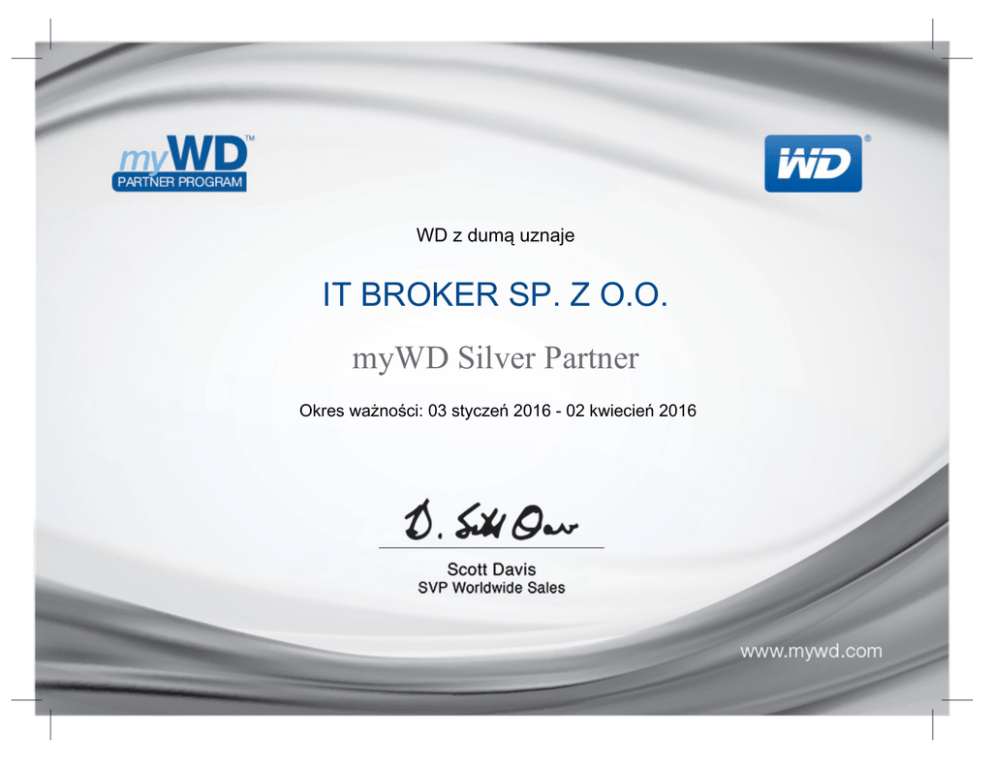 WD z dumą uznaje IT BROKER SP. Z O.O. myWD Silver Partner Okres ważności: 03 styczeń 2016 - 02 kwiecień 2016
