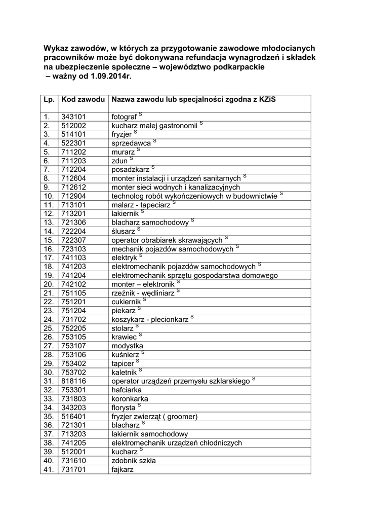 Wykaz zawodów, w których za przygotowanie zawodowe młodocianych pracowników może być dokonywana refundacja wynagrodzeń i składek na ubezpieczenie społeczne – województwo podkarpackie – ważny od 1.09.2014r. Lp. Kod zawodu Nazwa zawodu lub specjalności zgodna z KZiS 1. 2. 3. 4. 5. 6. 7. 8. 9. 10. 11. 12. 13. 14. 15. 16. 17. 18. 19. 20. 21. 22. 23. 24. 25. 26. 27. 28. 29. 30. 31. 32. 33. 34. 35. 36. 37. 38. 39. 40. 41. 343101 512002 514101 522301 711202 711203 712204 712604 712612 712904 713101 713201 721306 722204 722307 723103 741103 741203 741204 742102 751105 751201 751204 731702 752205 753105 753107 753106 753402 753702 818116 753301 731803 343203 516401 721301 713203 741205 512001 731610 731701 fotograf S kucharz małej gastronomii S fryzjer S sprzedawca S murarz S zdun S posadzkarz S monter instalacji i urządzeń sanitarnych S monter sieci wodnych i kanalizacyjnych technolog robót wykończeniowych w budownictwie S malarz - tapeciarz S lakiernik S blacharz samochodowy S ślusarz S operator obrabiarek skrawających S mechanik pojazdów samochodowych S elektryk S elektromechanik pojazdów samochodowych S elektromechanik sprzętu gospodarstwa domowego monter – elektronik S rzeźnik - wędliniarz S cukiernik S piekarz S koszykarz - plecionkarz S stolarz S krawiec S modystka kuśnierz S tapicer S kaletnik S operator urządzeń przemysłu szklarskiego S hafciarka koronkarka florysta S fryzjer zwierząt ( groomer) blacharz S lakiernik samochodowy elektromechanik urządzeń chłodniczych kucharz S zdobnik szkła fajkarz 42. 43. 44. 45. 46. 48. 49. 50. 51. 52. 53. 54. 55. 56. 57. 58. 59. 60. 61. 62. 63. 64. 65. 732301 732201 753604 711402 712401 712603 712611 711204 712616 712905 751107 834103 611303 731104 834201 816003 731305 712613 713303 731106 813134 741201 711501 introligator S drukarz S obuwnik ortopedyczny betoniarz zbrojarz S monter izolacji budowlanych S monter instalacji gazowych monter sieci komunalnych murarz-tynkarz monter sieci, instalacji i urządzeń sanitarnych monter zabudowy i robót wykończeniowych w budownictwie wędliniarz mechanik-operator pojazdów i maszyn rolniczych S ogrodnik S optyk-mechanik S mechanik maszyn i urządzeń drogowych S operator maszyn i urządzeń przemysłu spożywczego S złotnik-jubiler S monter systemów rurociągowych S kominiarz S zegarmistrz S operator urządzeń przemysłu chemicznego elektromechanik S cieśla S