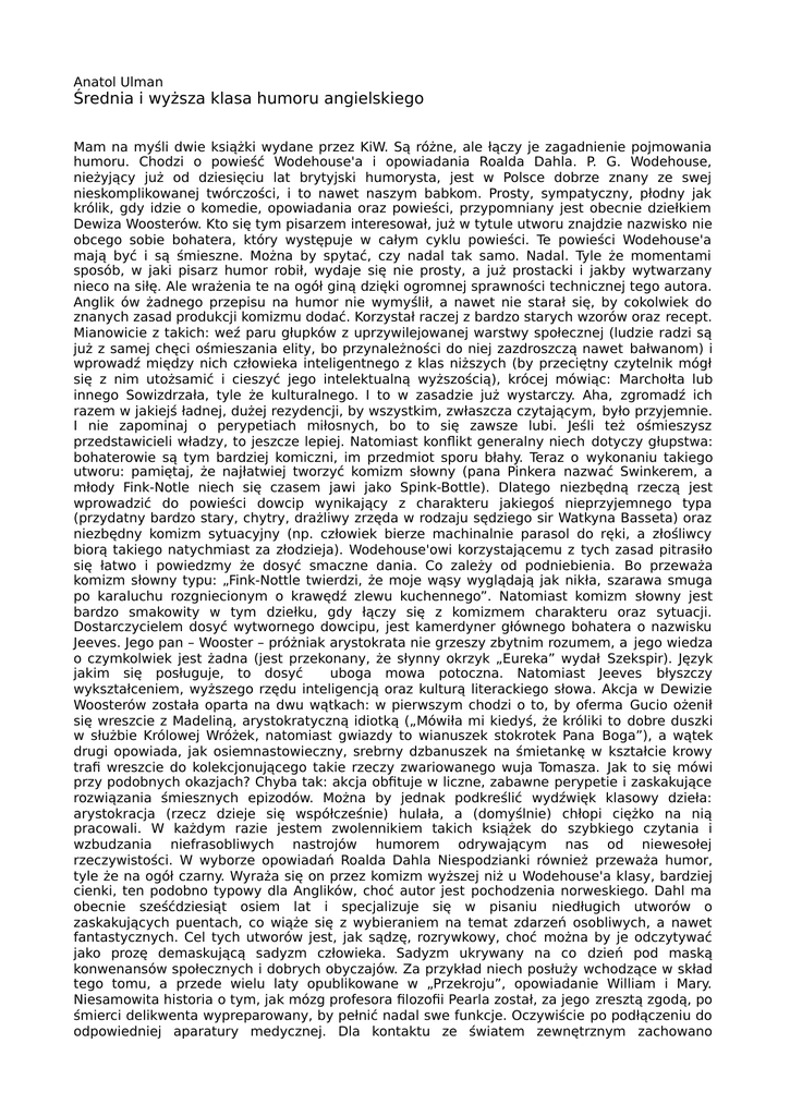 Anatol Ulman Średnia i wyższa klasa humoru angielskiego Mam na myśli dwie książki wydane przez KiW. Są różne, ale łączy je zagadnienie pojmowania humoru. Chodzi o powieść Wodehouse'a i opowiadania Roalda Dahla. P. G. Wodehouse, nieżyjący już od dziesięciu lat brytyjski humorysta, jest w Polsce dobrze znany ze swej nieskomplikowanej twórczości, i to nawet naszym babkom. Prosty, sympatyczny, płodny jak królik, gdy idzie o komedie, opowiadania oraz powieści, przypomniany jest obecnie dziełkiem Dewiza Woosterów. Kto się tym pisarzem interesował, już w tytule utworu znajdzie nazwisko nie obcego sobie bohatera, który występuje w całym cyklu powieści. Te powieści Wodehouse'a mają być i są śmieszne. Można by spytać, czy nadal tak samo. Nadal. Tyle że momentami sposób, w jaki pisarz humor robił, wydaje się nie prosty, a już prostacki i jakby wytwarzany nieco na siłę. Ale wrażenia te na ogół giną dzięki ogromnej sprawności technicznej tego autora. Anglik ów żadnego przepisu na humor nie wymyślił, a nawet nie starał się, by cokolwiek do znanych zasad produkcji komizmu dodać. Korzystał raczej z bardzo starych wzorów oraz recept. Mianowicie z takich: weź paru głupków z uprzywilejowanej warstwy społecznej (ludzie radzi są już z samej chęci ośmieszania elity, bo przynależności do niej zazdroszczą nawet bałwanom) i wprowadź między nich człowieka inteligentnego z klas niższych (by przeciętny czytelnik mógł się z nim utożsamić i cieszyć jego intelektualną wyższością), krócej mówiąc: Marchołta lub innego Sowizdrzała, tyle że kulturalnego. I to w zasadzie już wystarczy. Aha, zgromadź ich razem w jakiejś ładnej, dużej rezydencji, by wszystkim, zwłaszcza czytającym, było przyjemnie. I nie zapominaj o perypetiach miłosnych, bo to się zawsze lubi. Jeśli też ośmieszysz przedstawicieli władzy, to jeszcze lepiej. Natomiast konflikt generalny niech dotyczy głupstwa: bohaterowie są tym bardziej komiczni, im przedmiot sporu błahy. Teraz o wykonaniu takiego utworu: pamiętaj, że najłatwiej tworzyć komizm słowny (pana Pinkera nazwać Swinkerem, a młody Fink-Notle niech się czasem jawi jako Spink-Bottle). Dlatego niezbędną rzeczą jest wprowadzić do powieści dowcip wynikający z charakteru jakiegoś nieprzyjemnego typa (przydatny bardzo stary, chytry, drażliwy zrzęda w rodzaju sędziego sir Watkyna Basseta) oraz niezbędny komizm sytuacyjny (np. człowiek bierze machinalnie parasol do ręki, a złośliwcy biorą takiego natychmiast za złodzieja). Wodehouse'owi korzystającemu z tych zasad pitrasiło się łatwo i powiedzmy że dosyć smaczne dania. Co zależy od podniebienia. Bo przeważa komizm słowny typu: „Fink-Nottle twierdzi, że moje wąsy wyglądają jak nikła, szarawa smuga po karaluchu rozgniecionym o krawędź zlewu kuchennego”. Natomiast komizm słowny jest bardzo smakowity w tym dziełku, gdy łączy się z komizmem charakteru oraz sytuacji. Dostarczycielem dosyć wytwornego dowcipu, jest kamerdyner głównego bohatera o nazwisku Jeeves. Jego pan – Wooster – próżniak arystokrata nie grzeszy zbytnim rozumem, a jego wiedza o czymkolwiek jest żadna (jest przekonany, że słynny okrzyk „Eureka” wydał Szekspir). Język jakim się posługuje, to dosyć uboga mowa potoczna. Natomiast Jeeves błyszczy wykształceniem, wyższego rzędu inteligencją oraz kulturą literackiego słowa. Akcja w Dewizie Woosterów została oparta na dwu wątkach: w pierwszym chodzi o to, by oferma Gucio ożenił się wreszcie z Madeliną, arystokratyczną idiotką („Mówiła mi kiedyś, że króliki to dobre duszki w służbie Królowej Wróżek, natomiast gwiazdy to wianuszek stokrotek Pana Boga”), a wątek drugi opowiada, jak osiemnastowieczny, srebrny dzbanuszek na śmietankę w kształcie krowy trafi wreszcie do kolekcjonującego takie rzeczy zwariowanego wuja Tomasza. Jak to się mówi przy podobnych okazjach? Chyba tak: akcja obfituje w liczne, zabawne perypetie i zaskakujące rozwiązania śmiesznych epizodów. Można by jednak podkreślić wydźwięk klasowy dzieła: arystokracja (rzecz dzieje się współcześnie) hulała, a (domyślnie) chłopi ciężko na nią pracowali. W każdym razie jestem zwolennikiem takich książek do szybkiego czytania i wzbudzania niefrasobliwych nastrojów humorem odrywającym nas od niewesołej rzeczywistości. W wyborze opowiadań Roalda Dahla Niespodzianki również przeważa humor, tyle że na ogół czarny. Wyraża się on przez komizm wyższej niż u Wodehouse'a klasy, bardziej cienki, ten podobno typowy dla Anglików, choć autor jest pochodzenia norweskiego. Dahl ma obecnie sześćdziesiąt osiem lat i specjalizuje się w pisaniu niedługich utworów o zaskakujących puentach, co wiąże się z wybieraniem na temat zdarzeń osobliwych, a nawet fantastycznych. Cel tych utworów jest, jak sądzę, rozrywkowy, choć można by je odczytywać jako prozę demaskującą sadyzm człowieka. Sadyzm ukrywany na co dzień pod maską konwenansów społecznych i dobrych obyczajów. Za przykład niech posłuży wchodzące w skład tego tomu, a przede wielu laty opublikowane w „Przekroju”, opowiadanie William i Mary. Niesamowita historia o tym, jak mózg profesora filozofii Pearla został, za jego zresztą zgodą, po śmierci delikwenta wypreparowany, by pełnić nadal swe funkcje. Oczywiście po podłączeniu do odpowiedniej aparatury medycznej. Dla kontaktu ze światem zewnętrznym zachowano profesorowi jedno oko. Cichej dotąd żonie Williama Pearl brakowało „... pięknych, czułych słów podziękowania za tych trzydzieści lat życia, które jemu poświęciła, za tysiąckrotne słanie łóżka, prasowanie tysięcy koszul i gotowanie tysięcy posiłków”. Weźmie więc w pełni świadomy, lecz nie mogący w żaden sposób reagować (prócz błysku złości w źrenicy) mózg męża do siebie, by nad widzącym ją okiem wyczyniać wszystko, czego profeso