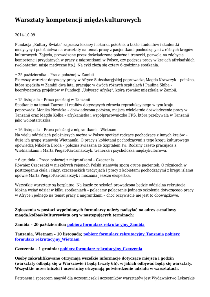 Warsztaty kompetencji międzykulturowych 2014-10-09 Fundacja „Kultury Świata” zaprasza lekarzy i lekarki, położne, a także studentów i studentki medycyny i położnictwa na warsztaty na temat pracy z pacjentkami pochodzącymi z różnych kręgów kulturowych. Zajęcia, prowadzone przez doświadczone położne i trenerki, pozwolą na zdobycie kompetencji przydatnych w pracy z migrantkami w Polsce, czy podczas pracy w krajach afrykańskich (wolontariat, misje medyczne itp.). Na cykl złożą się cztery 6-godzinne spotkania: • 25 października – Praca położnej w Zambii Pierwszy warsztat dotyczący pracy w Afryce Subsaharyjskiej poprowadzą Magda Krawczyk – położna, która spędziła w Zambii dwa lata, pracując w dwóch różnych szpitalach i Paulina Skiba – koordynatorka projektów w Fundacji „Usłyszeć Afrykę”, która również mieszkała w Zambii. • 15 listopada – Praca położnej w Tanzanii Spotkanie na temat Tanzanii i realiów dotyczących zdrowia reprodukcyjnego w tym kraju poprowadzi Monika Nowicka – doświadczona położna, mająca wieloletnie doświadczenie pracy w Tanzanii oraz Magda Kołba – afrykanistka i współpracowniczka FKŚ, która przebywała w Tanzanii jako wolontariuszka. • 16 listopada – Praca położnej z migrantkami – Wietnam Na wielu oddziałach położniczych można w Polsce spotkać rodzące pochodzące z innych krajów – dużą ich grupę stanowią Wietnamki. O pracy z kobietami pochodzącymi z tego kręgu kulturowego opowiedzą Nikoleta Broda – położna związana ze Szpitalem św. Rodziny często pracująca z Wietnamkami i Marta Piegat-Karczmarczyk, trenerka i psycholożka międzykulturowa. • 6 grudnia – Praca położnej z migrantkami – Czeczenia Również Czeczenki w niektórych rejonach Polski stanowią sporą grupę pacjentek. O różnicach w postrzeganiu ciała i ciąży, czeczeńskich tradycjach i pracy z kobietami pochodzącymi z kręgu islamu opowie Marta Piegat-Karczmarczyk i nieznana jeszcze ekspertka. Wszystkie warsztaty są bezpłatne. Na każde ze szkoleń prowadzona będzie oddzielna rekrutacja. Można wziąć udział w kilku spotkaniach – polecamy połączenie jednego szkolenia dotyczącego pracy w Afryce i jednego na temat pracy z migrantkami – choć oczywiście nie jest to obowiązkowe. Zgłoszenia w postaci wypełnionych formularzy należy nadsyłać na adres e-mailowy [email protected] w następujących terminach: Zambia – 20 października; pobierz formularz rekrutacyjny_Zambia Tanzania, Wietnam – 10 listopada; pobierz formularz rekrutacyjny_Tanzania pobierz formularz rekrutacyjny_Wietnam Czeczenia – 1 grudnia; pobierz formularz rekrutacyjny_Czeczenia Osoby zakwalifikowane otrzymają wszelkie informacje dotyczące miejsca i godzin (warsztaty odbędą się w Warszawie i będą trwały 6h), w jakich odbywać będą się warsztaty. Wszystkie uczestniczki i uczestnicy otrzymają potwierdzenie udziału w warsztatach. Patronem i sposorem nagród dla uczestniczek i uczestników warsztatów jest Wydawnictwo Lekarskie PZWL Warsztaty są organizowane w ramach projektu: Poprawa w dostępie do opieki zdrowotnej w mieście i dystrykcie Mwanga Projekt jest współfinansowany z programu polskiej współpracy rozwojowej Ministerstwa Spraw Zagranicznych RP w 2014 roku.