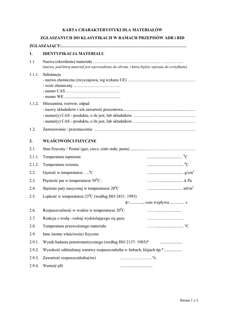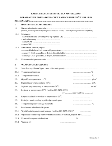 KARTA CHARAKTERYSTYKI DLA MATERIAŁÓW ZGŁASZANYCH DO KLASYFIKACJI W RAMACH PRZEPISÓW ADR i RID ZGŁASZAJĄCY:……………………………………………………………………………… 1. IDENTYFIKACJA MATERIAŁU 1.1 Nazwa (określenie) materiału ………………………………………..… …………… (nazwa, pod którą materiał jest wprowadzany do obrotu, i która będzie wpisana do certyfikatu) 1.1.1. Substancja - nazwa chemiczna (zwyczajowa, wg wykazu UE) …………………………………………. - wzór chemiczny ……………………………. - numer CAS ………………………………… - numer WE ...................................................... 1.1.2. Mieszanina, roztwór, odpad - nazwy składników i ich zawartość procentowa...................................................................... - numer(y) CAS - produktu, o ile jest, lub składników ……………………………………… - numer(y) CAS - produktu, o ile jest, lub składników ……………………………………… 1.2. Zastosowanie / przeznaczenie ……………………………………………………………….. 2. WŁAŚCIWOŚCI FIZYCZNE 2.1. Stan fizyczny / Postać (gaz, ciecz, ciało stałe, pasta) ...............……………………………… 2.1.1. Temperatura topnienia .................................. 0C 2.1.2. Temperatura wrzenia ................................... 0C 2.2. Gęstość w temperaturze ….0C ................................... g/cm3 2.3. Prężność par w temperaturze 500C: ………....................... k Pa 2.4. Stężenie pary nasyconej w temperaturze 200C .................................. ml/m3 2.5. Lepkość w temperaturze 230C (według ISO 2431: 1993) =............., czas wypływu .............. s 2.6. Rozpuszczalność w wodzie w temperaturze 200C ……......................... 2.7. Reakcja z wodą - rodzaj wydzielającego się gazu ……………………… 2.8. Temperatura przewożonego materiału ……........................... °C 2.9. Inne istotne właściwości fizyczne 2.9.1. Wynik badania penetrometrycznego (według ISO 2137: 1985)* ..................... 2.9.2. Wysokość oddzielonej warstwy rozpuszczalnika w farbach, klejach itp.*.................. 2.9.3. Zawartość rozpuszczalnika(ów) ………………….. % 2.9.4. Wartość pH ............................... Strona 1 z 3 3. WŁAŚCIWOŚCI PALNE 3.1. Materiał ciekły 3.1.1. Temperatura zapłonu (tygiel zamknięty)* ......................... 3.1.2. Wynik testu na podtrzymanie palenia* ........................ 3.2. Materiał stały 3.2.1. Wynik testu na zapalność i prędkość spalania metodą ścieżki* .................................... 3.2.2. Wynik testu zapalenia od źródła zapłonu (niskoenergetycznego) ……………………. 3.3. Materiał stały niestabilny 3.3.1. Temperatura samoprzyspieszającego się rozkładu - TSR 3.4. Materiał podatny na samozapalenie w kontakcie z powietrzem (piroforyczny) 3.4.1. Wynik testu na piroforyczność* 3.5. .......................................................... Materiał ulegający samonagrzewaniu (samozapaleniu) 3.5.1. Wynik testu na samonagrzewanie* 3.6. .......................................................... Materiał reagujący z wodą z wydzieleniem gazu palnego 3.6.1. Wynik testu na niebezpieczną reakcję z wodą* 3.7. ....................... ........................ Materiał utleniający 3.7.1. Ciało stałe - wynik testu na intensyfikację palenia* 3.7.2. Ciecz – wynik testu zdolności utleniających 3.8. ......................... Nadtlenek organiczny 3.8.1. Nazwa chemiczna, zawartość nadtlenku, typ formulacji ……………….. 3.8.2. Temperatura samoprzyspieszającego się rozkładu - TSR ......................... 4. 4.1. SZKODLIWE DZIAŁANIA BIOLOGICZNE Toksyczność ostra 4.1.1. Wartość LD50, doustnie...........mg/kg zwierzę doświadczalne......................... 4.1.2. Wartość LD50, dermalnie.........mg/kg zwierzę doświadczalne......................... 4.1.3. Wartość LC50, inhalacyjnie.........mg/l zwierzę doświadczalne......................... 4.2. Działanie żrące / drażniące 4.2.1. Efekt działania na skórę zwierzę doświadczalne ...................................... czas narażenia (godziny lub minuty) .......................... wynik badania ………………………………………. 4.3. Dane pochodzące z wypadków zatruć ludzi ................................................................................................................................................ ............................................................................................................................................... Strona 2 z 3 5. DZIAŁANIE KORODUJĄCE 5.1. Szybkość działania korodującego w temperaturze 550C: na stal ………….................... mm/rok na aluminium ......................... mm/rok 5.2. Działanie korodujące na inne tworzywa opakowaniowe ............................................ 6. ZAGROŻENIE DLA ŚRODOWISKA 6.1. Ekotoksyczność – środowisko wodne 6.1.1. Wartość LC50, dla ryb ....................... mg/l (96 godzin) gatunek ryb......................... 6.1.2. Wartość EC50, dla skorupiaków..........mg/l (48 godzin) gatunek skorupiaków.......... 6.1.3. Wartość IC50, dla glonów....................mg/l (72 godzin) gatunek glonów.................. 6.1.4. Podatność na biodegradację (stosunek BZT do ChZT) ......................... 6.1.5. Podatność na bioakumulację (współczynnik biostężenia BCF i wartość log Pow) ............................................ 7. Klasyfikacja materiału wg przepisów wydanych na podstawie ustawy o substancjach chemicznych i ich mieszaninach (kategoria(e), zwroty R / klasa(y), zwroty H) …………………………………………………………… Data opracowania karty: …………. Podpis opracowującego kartę ………….. UWAGA: Ka