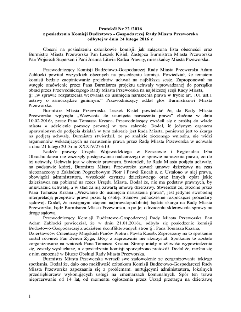 Protokół Nr 22 /2016 z posiedzenia Komisji Budżetowo - Gospodarczej Rady Miasta Przeworska odbytej w dniu 24 lutego 2016 r. Obecni na posiedzeniu członkowie komisji, jak załączona lista obecności oraz Burmistrz Miasta Przeworska Pan Leszek Kisiel, Zastępca Burmistrza Miasta Przeworska Pan Wojciech Superson i Pani Joanna Litwin Radca Prawny, mieszkańcy Miasta Przeworska. Przewodniczący Komisji Budżetowo-Gospodarczej Rady Miasta Przeworska Adam Zabłocki powitał wszystkich obecnych na posiedzeniu komisji. Powiedział, że tematem komisji będzie zaopiniowanie projektów uchwał na najbliższą sesję. Zaproponował na wstępie omówienie przez Pana Burmistrza projektu uchwały wprowadzanej do porządku obrad przez Przewodniczącego Rady Miasta Przeworska na najbliższej sesji Rady Miasta, tj: „w sprawie rozpatrzenia wezwania do usunięcia naruszenia prawa w trybie art. 101 ust.1 ustawy o samorządzie gminnym.” Przewodniczący oddał głos Burmistrzowi Miasta Przeworska. Burmistrz Miasta Przeworska Leszek Kisiel powiedział że, do Rady Miasta Przeworska wpłynęło „Wezwanie do usunięcia naruszenia prawa” złożone w dniu 10.02.2016r, przez Pana Tomasza Krzana. Przewodniczący zwrócił się z prośbą do władz miasta o udzielenie pomocy prawnej w tym zakresie. Dodał, iż jedynym organem uprawnionym do podjęcia działań w tym zakresie jest Rada Miasta, ponieważ jest to skarga na podjętą uchwałę. Burmistrz stwierdził, że po analizie złożonego wniosku, nie widzi argumentów wskazujących na naruszenie prawa przez Radę Miasta Przeworska w uchwale z dnia 21 lutego 2013r nr XXXIV/273/13. Nadzór prawny Urzędu Wojewódzkiego w Rzeszowie i Regionalna Izba Obrachunkowa nie wszczęły postępowania nadzorczego w sprawie naruszenia prawa, co do tej uchwały. Uchwała jest w obrocie prawnym. Stwierdził, że Rada Miasta podjęła uchwałę, na podstawie której, Burmistrz Miasta Przeworska zawarł umowę dzierżawy na czas nieoznaczony z Zakładem Pogrzebowym Piotr i Paweł Kucab s. c. Ustalono w niej prawa, obowiązki administratora, wysokość czynszu dzierżawnego oraz innych opłat jakie dzierżawca ma pobierać na rzecz Urzędu Miasta. Dodał że, nie ma podstaw prawnych, by unieważnić uchwałę, a w ślad za nią zawartą umowę dzierżawy. Stwierdził że, złożone przez Pana Tomasza Krzana „Wezwanie do usunięcia naruszenia prawa”, jest jedynie swobodną interpretacją przepisów prawa przez tą osobę. Stanowi jednocześnie rozpoczęcie procedury sądowej. Dodał, że następnym etapem najprawdopodobniej będzie skarga na Radę Miasta Przeworska, bądź Burmistrza Miasta Przeworska, a po jej odrzuceniu skierowanie sprawy na drogę sądową. Przewodniczący Komisji Budżetowo-Gospodarczej Rady Miasta Przeworska Pan Adam Zabłocki powiedział, że w dniu 21.01.2016r., odbyło się posiedzenie komisji Budżetowo-Gospodarczej z udziałem skonfliktowanych stron tj.: Pana Tomasza Krzana, Dzierżawców Cmentarzy Miejskich Panów Piotra i Pawła Kucab. Zaproszony na to spotkanie został również Pan Zenon Żyga, który z zaproszenia nie skorzystał. Spotkanie to zostało zorganizowane na wniosek Pana Tomasza Krzana. Strony miały możliwość wypowiedzenia się, zostały wysłuchane, a z posiedzenia komisji sporządzono protokół. Dodał że, można się z nim zapoznać w Biurze Obsługi Rady Miasta Przeworska. Burmistrz Miasta Przeworska wyraził swe zadowolenie ze zorganizowania takiego spotkania. Dodał że, dało ono możliwość członkom Komisji Budżetowo-Gospodarczej Rady Miasta Przeworska zapoznania się z problemami nurtującymi administratora, lokalnych przedsiębiorców wykonujących usługi na cmentarzach komunalnych. Spór ten trawa nieprzerwanie od 14 lat, od momentu ogłoszenia przez Urząd przetargu na dzierżawę 1 cmentarzy komunalnych w 2002r i podpisaniu umowy dzierżawy z konkurencją Pana Tomasza Krzana - panów Piotra i Pawła Kucab. Władze miasta stoją cały czas na tym samym stanowisku. Uchwała Rady Miasta Przeworska z dnia 21 lutego 2013r nr XXXIV/273/13, pozwoliła Burmistrzowi na przedłużenie umowy dzierżawy z dotychczasowym administratorem Cmentarzy. Przewodniczący Komisji Budżetowo-Gospodarczej Pan Adam Zabłocki zwrócił się do Burmistrza Miasta Przeworska, z prośbą o zajęcie stanowiska w kwestii składania ofert na dzierżawę cmentarzy przez inne podmioty, w okresie trwania ważnej umowy dzierżawy, zawartej w 2002r z administratorem. Burmistrz Miasta Pan Leszek Kisiel powiedział że, pomiędzy Burmistrzem Miasta Przeworska a aktualnym dzierżawcą była zawarta umowa dzierżawy na czas nieokreślony. Wyjaśnił że, w pragmatyce wypowiedzenie tego rodzaju umowy, musi być poprzedzone pewnymi zdarzeniami. Burmistrz powiedział, że w ostatnim okresie dogłębnie zapoznał się z tą sprawą. Spór pomiędzy Panem Tomaszem Krzanem, a administratorami cmentarzy toczy się od 2002r .Zaznaczył, że na przestrzeni 14 lat od osób prywatnych wpłynęło do Urzędu kilka pism które opisywały drobne nieporozumienia pomiędzy nimi a Panami Kucab. Były też pisma jednego przedsiębiorcy niezadowolonego ze współpracy z nimi. Przedsiębiorca ten jednak wycofał się z zarzutów stawianych w nich administratorom cmentarza. Burmistrz stwierdził, że nie było i nie ma podstaw, argumentów do wypowiedzenia umowy dzierżawy administratorowi. Dodał, że druga umowa została zawarta niedawno, bo w 2014r. Został też wtedy podniesiony czynsz dzierżawny z 800 zł, na 2000 zł. Administrator wywiązuje się z nałożonych nań umową obowiązków, dodatkowo wykonuje wiele prac mających na celu poprawę dostępności mieszkańców do grobów osób bliskich. Miasto we własnym zakresie będzie chciało poprawić wygląd starego cmentarza (remont muru cmentarnego) oraz nowego cmentarza ( poprawa ogrodzenia, remont kaplicy cmentarnej, montaż chłodni do przechowywania zwłok). Przewodniczący Komisji Budżetowo–Gospoda