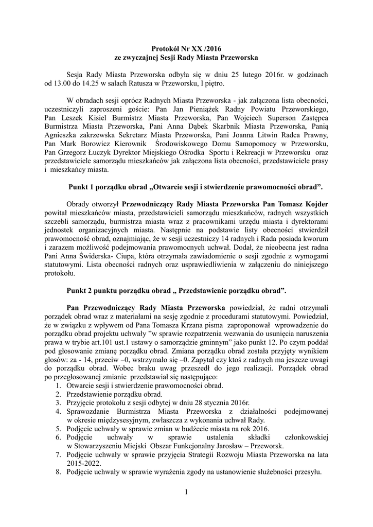 Protokół Nr XX /2016 ze zwyczajnej Sesji Rady Miasta Przeworska Sesja Rady Miasta Przeworska odbyła się w dniu 25 lutego 2016r. w godzinach od 13.00 do 14.25 w salach Ratusza w Przeworsku, I piętro. W obradach sesji oprócz Radnych Miasta Przeworska - jak załączona lista obecności, uczestniczyli zaproszeni goście: Pan Jan Pieniążek Radny Powiatu Przeworskiego, Pan Leszek Kisiel Burmistrz Miasta Przeworska, Pan Wojciech Superson Zastępca Burmistrza Miasta Przeworska, Pani Anna Dąbek Skarbnik Miasta Przeworska, Panią Agnieszka zakrzewska Sekretarz Miasta Przeworska, Pani Joanna Litwin Radca Prawny, Pan Mark Borowicz Kierownik Środowiskowego Domu Samopomocy w Przeworsku, Pan Grzegorz Łuczyk Dyrektor Miejskiego Ośrodka Sportu i Rekreacji w Przeworsku oraz przedstawiciele samorządu mieszkańców jak załączona lista obecności, przedstawiciele prasy i mieszkańcy miasta. Punkt 1 porządku obrad „Otwarcie sesji i stwierdzenie prawomocności obrad”. Obrady otworzył Przewodniczący Rady Miasta Przeworska Pan Tomasz Kojder powitał mieszkańców miasta, przedstawicieli samorządu mieszkańców, radnych wszystkich szczebli samorządu, burmistrza miasta wraz z pracownikami urzędu miasta i dyrektorami jednostek organizacyjnych miasta. Następnie na podstawie listy obecności stwierdził prawomocność obrad, oznajmiając, że w sesji uczestniczy 14 radnych i Rada posiada kworum i zarazem możliwość podejmowania prawomocnych uchwał. Dodał, że nieobecna jest radna Pani Anna Świderska- Ciupa, która otrzymała zawiadomienie o sesji zgodnie z wymogami statutowymi. Lista obecności radnych oraz usprawiedliwienia w załączeniu do niniejszego protokołu. Punkt 2 punktu porządku obrad „ Przedstawienie porządku obrad”. Pan Przewodniczący Rady Miasta Przeworska powiedział, że radni otrzymali porządek obrad wraz z materiałami na sesję zgodnie z procedurami statutowymi. Powiedział, że w związku z wpływem od Pana Tomasza Krzana pisma zaproponował wprowadzenie do porządku obrad projektu uchwały ”w sprawie rozpatrzenia wezwania do usunięcia naruszenia prawa w trybie art.101 ust.1 ustawy o samorządzie gminnym” jako punkt 12. Po czym poddał pod głosowanie zmianę porządku obrad. Zmiana porządku obrad została przyjęty wynikiem głosów: za - 14, przeciw –0, wstrzymało się –0. Zapytał czy ktoś z radnych ma jeszcze uwagi do porządku obrad. Wobec braku uwag przeszedł do jego realizacji. Porządek obrad po przegłosowanej zmianie przedstawiał się następująco: 1. Otwarcie sesji i stwierdzenie prawomocności obrad. 2. Przedstawienie porządku obrad. 3. Przyjęcie protokołu z sesji odbytej w dniu 28 stycznia 2016r. 4. Sprawozdanie Burmistrza Miasta Przeworska z działalności podejmowanej w okresie międzysesyjnym, zwłaszcza z wykonania uchwał Rady. 5. Podjęcie uchwały w sprawie zmian w budżecie miasta na rok 2016. 6. Podjęcie uchwały w sprawie ustalenia składki członkowskiej w Stowarzyszeniu Miejski Obszar Funkcjonalny Jarosław – Przeworsk. 7. Podjęcie uchwały w sprawie przyjęcia Strategii Rozwoju Miasta Przeworska na lata 2015-2022. 8. Podjęcie uchwały w sprawie wyrażenia zgody na ustanowienie służebności przesyłu. 1 9. Podjęcie uchwały w sprawie wyrażenia zgody na ustanowienie służebności przesyłu. 10. Podjęcie uchwały w sprawie wyrażenia zgody na zawarcie umowy nieodpłatnego użyczenia. 11. Podjęcie uchwały w sprawie wyrażenia zgody na wydzierżawienie nieruchomości na czas nieoznaczony. 12. Podjęcie uchwały ”w sprawie rozpatrzenia wezwania do usunięcia naruszenia prawa w trybie art.101 ust.1 ustawy o samorządzie gminnym”. 13. Interpelacje i zapytania radnych. 14. Odpowiedzi na interpelacje i wnioski zgłoszone na poprzednich sesjach i posiedzeniach Komisji Rady. 15. Wolne wnioski i informacje. 16. Zakończenie sesji. Punkt 3 porządku obrad „Przyjęcie protokołu z sesji odbytej w dniu 28 stycznia 2016r.” Pan Przewodniczący Rady Miasta poinformował, że protokół z sesji Rady Miasta odbytej w dniu 28 stycznia 2016 r. wyłożony był na posiedzeniach komisji oraz w Biurze Obsługi Rady Miasta. Zapytał radnych czy mają uwagi do sporządzonego protokołu. Wobec braku uwag do protokołu poddał przyjęcie protokołu pod głosowanie. Protokół z ww. sesji został przyjęty wynikiem głosów: za - 13, przeciw –0, wstrzymało się –1. Po stwierdzeniu, że protokół z sesji odbytej w dniu 28 stycznia 2016r. został przyjęty, Przewodniczący Rady przeszedł do kolejnego punktu porządku obrad. Punkt 4 porządku obrad „Sprawozdanie Burmistrza Miasta Przeworska z działalności podejmowanej w okresie międzysesyjnym, zwłaszcza z wykonania uchwał Rady”. Pan Przewodniczący Rady Miasta poprosił Pana Burmistrza o przedstawienie sprawozdania. Pan Leszek Kisiel Burmistrza powiedział, że uchwały podjęte na sesji w dniu 28 stycznia 2016r są zrealizowane, bądź są w trakcie realizacji. Następnie powiedział, że w okresie międzysesyjnym podejmował następujące działania: - trwały prace nad Strategią Miasta Przeworska na lata 2015-2022, - prowadzone są prace geodezyjne ws. przejęcia od PKP terenu za parowozownią, - odbyło się spotkanie z projektantami projektu odnawialnych źródeł energii ws. kolektorów słonecznych, dodał, że została skierowana informacja do mieszkańców, że będzie możliwość wejścia w projekt, - odbył spotkanie z mieszkańcami osiedla Marii Konopnickiej, - odbyło się spotkanie ws. koncepcji budowy mostu na Mleczce, prowadzono wstępne uzgodnienia z Wojewódzkim Zarządem Dróg, - odbył spotkanie z prezesem spółdzielni mieszkaniowej Misiągiewicza ws. wspólnej inwestycji drogowej. Dodał, że jest deklaracja zarządu spółdzielni mieszkaniowej i Zarządu PTBS o przekazaniu środków finansowych na to zadanie, - odbył spotkanie z PGNiG ws. odwiertów na terenie miasta Przeworska w okolicy ul. Korczaka i zakresu prac drogowych, - odbył spo