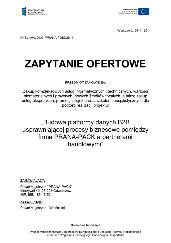 Warszawa, 01.11.2014 Nr Sprawy: 01/01/PRANA/POIG/2014 ZAPYTANIE OFERTOWE PRZEDMIOT ZAMÓWIENIA: Zakup kompleksowych usług informatycznych i technicznych, wartości niematerialnych i prawnych, nowych środków trwałych, a także zakup usług eksperckich, promocji projektu oraz szkoleń specjalistycznych dla potrzeb realizacji projektu: „Budowa platformy danych B2B usprawniającej procesy biznesowe pomiędzy firma PRANA-PACK a partnerami handlowymi” ZAMAWIAJĄCY: Paweł Majchrzak "PRANA-PACK" Morzywół 40, 26-225 Gowarczów NIP: 658-185-15-52 ZATWIERDZIŁ: Paweł Majchrzak - Właściciel Dotacje na Innowacje Projekt współfinansowany ze środków Europejskiego Funduszu Rozwoju Regionalnego w ramach Programu Operacyjnego Innowacyjna Gospodarka 1. OPIS SPOSPOBU PRZYGOTOWANIA OFERTY: Oferta powinna być sporządzona w języku polskim oraz podpisana (lub parafowana) przez osobę (osoby) upoważnione do występowania w imieniu wykonawcy. Oferta musi być trwale zespolona. Każdy wykonawca może złożyć wyłącznie jedną ofertę, w której musi być zaoferowana tylko jedna ostateczna cena. Ofertę należy złożyć na formularzu stanowiącym załącznik do niniejszego zapytania. 2. DOKUMENTY WYMAGANE OD WYKONAWCÓW: Oświadczenie oferenta na formularzu stanowiącym załącznik do niniejszego zapytania. 3. PRZEDMIOT ZAMÓWIENIA: Przedmiotem zamówienia są następujące działania: 1) Nabycie wartości niematerialnych i prawnych: a. Zakup 2 systemów operacyjnych Linux w wariancie rocznego wsparcia technicznego b. Zakup licencji do obsługi Panelu 1 B2B (Moduł KLIENCI, Moduł PARTNERZY). PANEL 1 B2B - obszar pozwoli na zautomatyzowanie procesu biznesowego - zarządzanie relacjami z klientem. Jest to proces, który ma na celu zdobycie i utrzymanie najlepszej wiedzy o kliencie, jego oczekiwaniach i potencjale z punktu widzenia możliwości utrzymania i zwiększenia sprzedaży. Wymaga to nie tylko skutecznego pozyskania nowych klientów, ale też podtrzymania dobrych relacji z klientami istniejącymi, a także przywrócenia klientów utraconych. Jednocześnie przyjęte metody działania pozwalają obniżyć koszty marketingu i obsługi klienta. Działania te realizuje się przy użyciu technologii, które pozwalają na realizację zautomatyzowanych i zsynchronizowanych procesów sprzedażowych i marketingowych, planowania i rozliczania sprzedaży oraz działań personelu zespołów sprzedażowych. Drugim procesem, jaki zostanie objęty funkcjonalnościami modułów w obrębie Panelu 1 B2B jest proces związany z koordynacją działań partnerskich. Panel 1 B2B zawiera Moduł KLIENCI, Moduł PARTNERZY. Dotacje na Innowacje Projekt współfinansowany ze środków Europejskiego Funduszu Rozwoju Regionalnego w ramach Programu Operacyjnego Innowacyjna Gospodarka MODUŁ KLIENCI - zawiera funkcjonalność dającą możliwość przesyłania danych o klientach, dla których wspólnie z Partnerami są realizowane zamówienia. Moduł ten wyposażony jest w funkcję zarządzania informacjami o klientach. Zarówno Partner jak i Wnioskodawca będzie miał możliwość podglądu, wprowadzania i edycji danych o klientach oraz o przeprowadzonych transakcjach. Podobnie, Wnioskodawca i Partnerzy będą mieli bieżący podgląd statusu realizacji określonego zamówienia dla konkretnego klienta. Moduł dodatkowo zawiera funkcjonalność pozwalającą na pozyskanie i utrzymanie wiedzy o klientach (dane adresowe, kontakty, liczba i rodzaj złożonych zamówień, stopień realizacji, etc.), co stanowić będzie wsparcie w sprzedaży - pozwoli na generowanie dokumentów, sprawne zarządzanie cennikami, naliczanymi rabatami przy współpracy z funkcjonalnościami Modułu ZAMÓWIENIA. Ponadto będzie można dodawać różnego rodzaju notatki, określić poziom zadowolenia, a nawet informacje związane z limitami logistycznymi czy warunkami dostaw. Liczne słowniki wykorzystywane w danych klientów będą definiowane przez użytkowników systemu i dostosowane do specyfiki firmy. Moduł będzie zawierał liczne narzędzia umożliwiające zarządzanie bazą kontrahentów. Dostępne będą funkcje pozwalające na segmentację klientów wg różnych kryteriów opisujących ich specyfikę czy profil, co pomoże firmie PRANA PACK realizować w pełni wprowadzoną politykę CMR. Ponadto możliwe będzie tworzenie grup osób kontaktowych kontrahentów, które mogą być następnie wykorzystywane w różnego rodzaju akcjach reklamowych, korespondencji, mailingach - w funkcjonalnościach związanych z obsługą Panelu 3 B2B, zawierającego m. in. Moduł ZARZĄDZANIE INFORMACJĄ O PRODUKCIE I PROMOCJA. Moduł wspomoże funkcje drukowania etykiet adresowych. W ramach tego Modułu powstanie funkcjonalność importowania danych o klientach, pozwalającą pobierać dane z zewnętrznych źródeł danych, takich jak baza danych programu MS Outlook lub MS Outlook Express. Dane będą też importowane z plików o ustalonym formacie CSV. MODUŁ PARTNERZY - Moduł ten pozwala na zarządzanie bazą partnerów i na definiowanie uprawnień dla każdego z nich w systemie B2B CRM. Moduł pozwala także na definiowanie rabatów na całe gałęzie produktów dla dowolnych grup partnerów, co jest szczególnie istotne, zważywszy na planowane rozszerzenie systemu B2B o kolejnych kluczowych Partnerów w miarę rozwoju firmy PRANA PACK. Podstawowe wstępnie zidentyfikowane funkcjonalności modułu, skupiające się na opcjach dostępu bądź limitowania tego dostępu do wybranych funkcjonalności - części projektowanego systemu B2B: • limitowanie dostępu do systemy B2B - dostęp do wybranych części systemu, ustawienia dot. autoryzacji, • limitowanie dostępu do galerii produktów - dostęp do wybranych grup produktów, Dotacje na Innowacje Projekt współfinansowany ze środków Europejskiego Funduszu Rozwoju Regionalnego w ramach Programu Operacyjnego Innowacyjna Gospodarka • limitowanie dostępu do dokumentacji - dostęp do dokumen