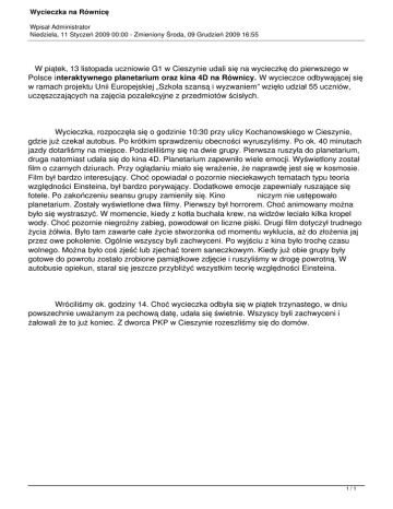 Wycieczka na Równicę Wpisał Administrator Niedziela, 11 Styczeń 2009 00:00 - Zmieniony Środa, 09 Grudzień 2009 16:55 W piątek, 13 listopada uczniowie G1 w Cieszynie udali się na wycieczkę do pierwszego w Polsce interaktywnego planetarium oraz kina 4D na Równicy. W wycieczce odbywającej się w ramach projektu Unii Europejskiej „Szkoła szansą i wyzwaniem” wzięło udział 55 uczniów, uczęszczających na zajęcia pozalekcyjne z przedmiotów ścisłych. Wycieczka, rozpoczęła się o godzinie 10:30 przy ulicy Kochanowskiego w Cieszynie, gdzie już czekał autobus. Po krótkim sprawdzeniu obecności wyruszyliśmy. Po ok. 40 minutach jazdy dotarliśmy na miejsce. Podzieliliśmy się na dwie grupy. Pierwsza ruszyła do planetarium, druga natomiast udała się do kina 4D. Planetarium zapewniło wiele emocji. Wyświetlony został film o czarnych dziurach. Przy oglądaniu miało się wrażenie, że naprawdę jest się w kosmosie. Film był bardzo interesujący. Choć opowiadał o pozornie nieciekawych tematach typu teoria względności Einsteina, był bardzo porywający. Dodatkowe emocje zapewniały ruszające się fotele. Po zakończeniu seansu grupy zamieniły się. Kino niczym nie ustępowało planetarium. Zostały wyświetlone dwa filmy. Pierwszy był horrorem. Choć animowany można było się wystraszyć. W momencie, kiedy z kotła buchała krew, na widzów leciało kilka kropel wody. Choć pozornie niegroźny zabieg, powodował on liczne piski. Drugi film dotyczył trudnego życia żółwia. Było tam zawarte całe życie stworzonka od momentu wyklucia, aż do złożenia jaj przez owe pokolenie. Ogólnie wszyscy byli zachwyceni. Po wyjściu z kina było trochę czasu wolnego. Można było coś zjeść lub zjechać torem saneczkowym. Kiedy już obie grupy były gotowe do powrotu zostało zrobione pamiątkowe zdjęcie i ruszyliśmy w drogę powrotną. W autobusie opiekun, starał się jeszcze przybliżyć wszystkim teorię względności Einsteina. Wróciliśmy ok. godziny 14. Choć wycieczka odbyła się w piątek trzynastego, w dniu powszechnie uważanym za pechową datę, udała się świetnie. Wszyscy byli zachwyceni i żałowali że to już koniec. Z dworca PKP w Cieszynie rozeszliśmy się do domów. 1/1