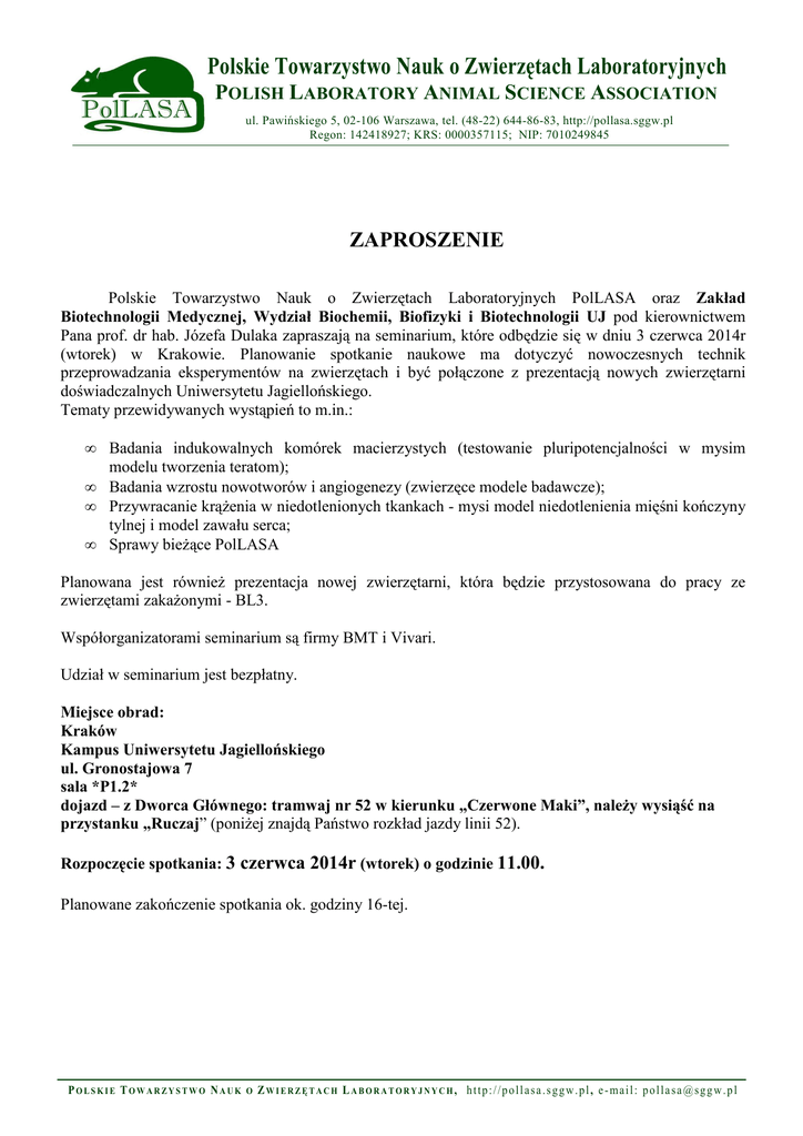 Polskie Towarzystwo Nauk o Zwierzętach Laboratoryjnych POLISH LABORATORY ANIMAL SCIENCE ASSOCIATION ul. Pawińskiego 5, 02-106 Warszawa, tel. (48-22) 644-86-83, http://pollasa.sggw.pl Regon: 142418927; KRS: 0000357115; NIP: 7010249845 ZAPROSZENIE Polskie Towarzystwo Nauk o Zwierzętach Laboratoryjnych PolLASA oraz Zakład Biotechnologii Medycznej, Wydział Biochemii, Biofizyki i Biotechnologii UJ pod kierownictwem Pana prof. dr hab. Józefa Dulaka zapraszają na seminarium, które odbędzie się w dniu 3 czerwca 2014r (wtorek) w Krakowie. Planowanie spotkanie naukowe ma dotyczyć nowoczesnych technik przeprowadzania eksperymentów na zwierzętach i być połączone z prezentacją nowych zwierzętarni doświadczalnych Uniwersytetu Jagiellońskiego. Tematy przewidywanych wystąpień to m.in.: • • • • Badania indukowalnych komórek macierzystych (testowanie pluripotencjalności w mysim modelu tworzenia teratom); Badania wzrostu nowotworów i angiogenezy (zwierzęce modele badawcze); Przywracanie krążenia w niedotlenionych tkankach - mysi model niedotlenienia mięśni kończyny tylnej i model zawału serca; Sprawy bieżące PolLASA Planowana jest również prezentacja nowej zwierzętarni, która będzie przystosowana do pracy ze zwierzętami zakażonymi - BL3. Współorganizatorami seminarium są firmy BMT i Vivari. Udział w seminarium jest bezpłatny. Miejsce obrad: Kraków Kampus Uniwersytetu Jagiellońskiego ul. Gronostajowa 7 sala *P1.2* dojazd – z Dworca Głównego: tramwaj nr 52 w kierunku „Czerwone Maki”, należy wysiąść na przystanku „Ruczaj” (poniżej znajdą Państwo rozkład jazdy linii 52). Rozpoczęcie spotkania: 3 czerwca 2014r (wtorek) o godzinie 11.00. Planowane zakończenie spotkania ok. godziny 16-tej. POLSKIE TOWARZYSTWO NAUK O ZWIERZĘTACH LABORATORYJNYCH, http://pollasa.sggw.pl, e-mail: [email protected]