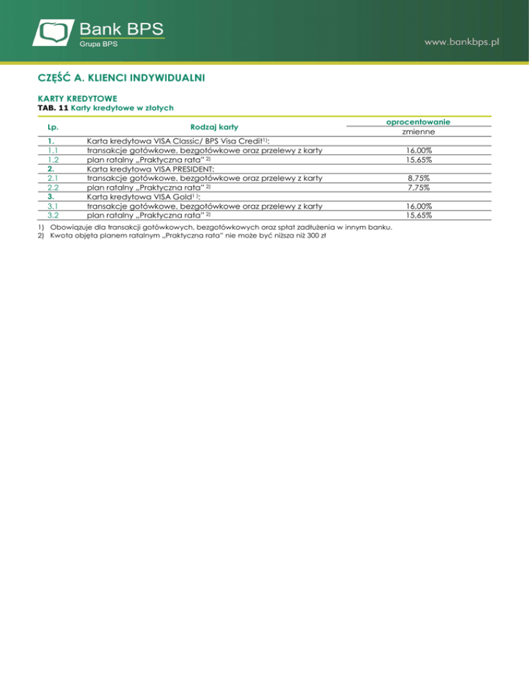 CZĘŚĆ A. KLIENCI INDYWIDUALNI KARTY KREDYTOWE TAB. 11 Karty kredytowe w złotych Lp. 1. 1.1 1.2 2. 2.1 2.2 3. 3.1 3.2 Rodzaj karty oprocentowanie zmienne Karta kredytowa VISA Classic/ BPS Visa Credit1): transakcje gotówkowe, bezgotówkowe oraz przelewy z karty plan ratalny „Praktyczna rata” 2) Karta kredytowa VISA PRESIDENT: transakcje gotówkowe, bezgotówkowe oraz przelewy z karty plan ratalny „Praktyczna rata” 2) Karta kredytowa VISA Gold1 ): transakcje gotówkowe, bezgotówkowe oraz przelewy z karty plan ratalny „Praktyczna rata” 2) 1) Obowiązuje dla transakcji gotówkowych, bezgotówkowych oraz spłat zadłużenia w innym banku. 2) Kwota objęta planem ratalnym „Praktyczna rata” nie może być niższa niż 300 zł 16,00% 15,65% 8,75% 7,75% 16,00% 15,65%