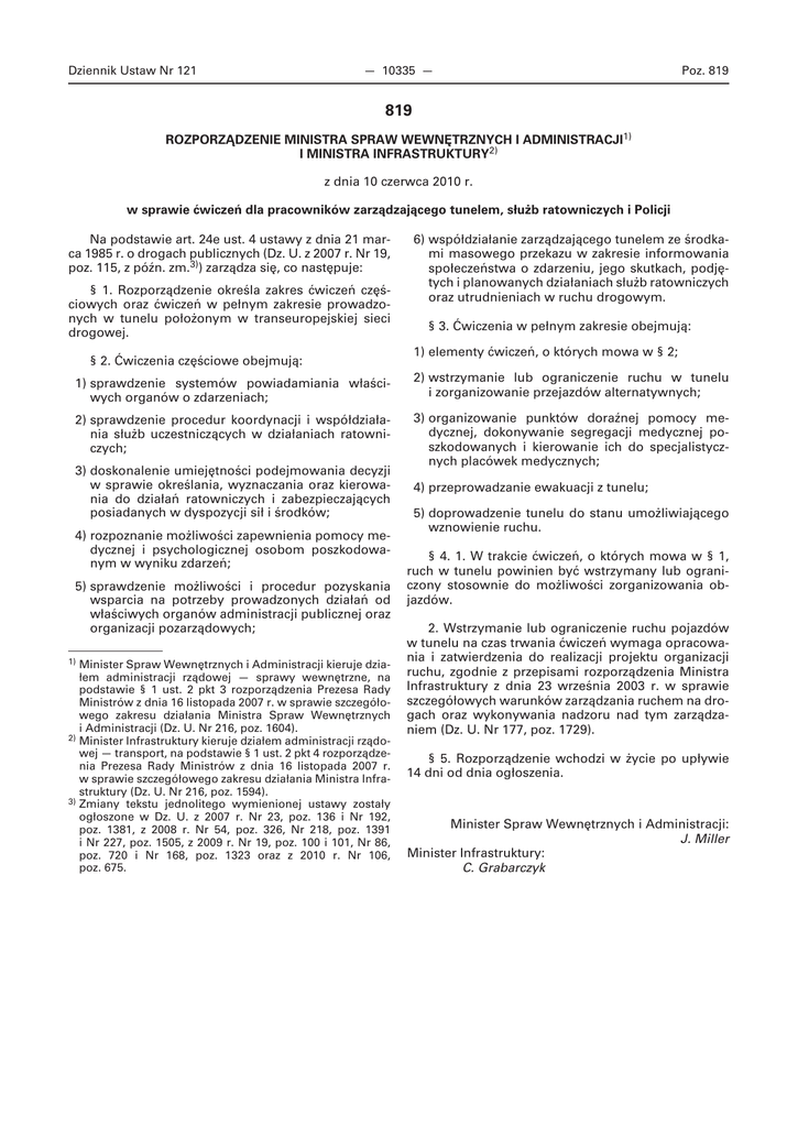 Dziennik Ustaw Nr 121 — 10335 — Poz. 819 819 ROZPORZĄDZENIE MINISTRA SPRAW WEWNĘTRZNYCH I ADMINISTRACJI1) I MINISTRA INFRASTRUKTURY2) z dnia 10 czerwca 2010 r. w sprawie ćwiczeń dla pracowników zarządzającego tunelem, służb ratowniczych i Policji Na podstawie art. 24e ust. 4 ustawy z dnia 21 marca 1985 r. o drogach publicznych (Dz. U. z 2007 r. Nr 19, poz. 115, z późn. zm.3)) zarządza się, co następuje: § 1. Rozporządzenie określa zakres ćwiczeń częściowych oraz ćwiczeń w pełnym zakresie prowadzonych w tunelu położonym w transeuropejskiej sieci drogowej. § 2. Ćwiczenia częściowe obejmują: 6) współdziałanie zarządzającego tunelem ze środkami masowego przekazu w zakresie informowania społeczeństwa o zdarzeniu, jego skutkach, podjętych i planowanych działaniach służb ratowniczych oraz utrudnieniach w ruchu drogowym. § 3. Ćwiczenia w pełnym zakresie obejmują: 1) elementy ćwiczeń, o których mowa w § 2; 1) sprawdzenie systemów powiadamiania właściwych organów o zdarzeniach; 2) wstrzymanie lub ograniczenie ruchu w tunelu i zorganizowanie przejazdów alternatywnych; 2) sprawdzenie procedur koordynacji i współdziałania służb uczestniczących w działaniach ratowniczych; 3) organizowanie punktów doraźnej pomocy medycznej, dokonywanie segregacji medycznej poszkodowanych i kierowanie ich do specjalistycznych placówek medycznych; 3) doskonalenie umiejętności podejmowania decyzji w sprawie określania, wyznaczania oraz kierowania do działań ratowniczych i zabezpieczających posiadanych w dyspozycji sił i środków; 4) rozpoznanie możliwości zapewnienia pomocy medycznej i psychologicznej osobom poszkodowanym w wyniku zdarzeń; 5) sprawdzenie możliwości i procedur pozyskania wsparcia na potrzeby prowadzonych działań od właściwych organów administracji publicznej oraz organizacji pozarządowych; 1) Minister Spraw Wewnętrznych i Administracji kieruje działem administracji rządowej — sprawy wewnętrzne, na podstawie § 1 ust. 2 pkt 3 rozporządzenia Prezesa Rady Ministrów z dnia 16 listopada 2007 r. w sprawie szczegółowego zakresu działania Ministra Spraw Wewnętrznych i Administracji (Dz. U. Nr 216, poz. 1604). 2) Minister Infrastruktury kieruje działem administracji rządowej — transport, na podstawie § 1 ust. 2 pkt 4 rozporządzenia Prezesa Rady Ministrów z dnia 16 listopada 2007 r. w sprawie szczegółowego zakresu działania Ministra Infrastruktury (Dz. U. Nr 216, poz. 1594). 3) Zmiany tekstu jednolitego wymienionej ustawy zostały ogłoszone w Dz. U. z 2007 r. Nr 23, poz. 136 i Nr 192, poz. 1381, z 2008 r. Nr 54, poz. 326, Nr 218, poz. 1391 i Nr 227, poz. 1505, z 2009 r. Nr 19, poz. 100 i 101, Nr 86, poz. 720 i Nr 168, poz. 1323 oraz z 2010 r. Nr 106, poz. 675. 4) przeprowadzanie ewakuacji z tunelu; 5) doprowadzenie tunelu do stanu umożliwiającego wznowienie ruchu. § 4. 1. W trakcie ćwiczeń, o których mowa w § 1, ruch w tunelu powinien być wstrzymany lub ograniczony stosownie do możliwości zorganizowania objazdów. 2. Wstrzymanie lub ograniczenie ruchu pojazdów w tunelu na czas trwania ćwiczeń wymaga opracowania i zatwierdzenia do realizacji projektu organizacji ruchu, zgodnie z przepisami rozporządzenia Ministra Infrastruktury z dnia 23 września 2003 r. w sprawie szczegółowych warunków zarządzania ruchem na drogach oraz wykonywania nadzoru nad tym zarządzaniem (Dz. U. Nr 177, poz. 1729). § 5. Rozporządzenie wchodzi w życie po upływie 14 dni od dnia ogłoszenia. Minister Spraw Wewnętrznych i Administracji: J. Miller Minister Infrastruktury: C. Grabarczyk