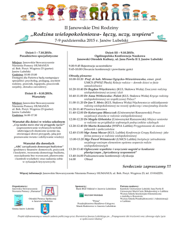 II Janowskie Dni Rodziny „Rodzina wielopokoleniowa- łączy, uczy, wspiera” 7-9 października 2015 r. Janów Lubelski Dzień I – 7.10.2015r. Poradnictwo specjalistyczne Miejsce: Janowskie Stowarzyszenie Niesienia Pomocy HUMANUS ul. Boh. Poryt. Wzgórza 23 (parter) Janów Lubelski Godzina: 10.00-15.00 Dostępni dla Państwa będą następujący specjaliści: psycholog, pedagog, asystent rodziny, prawnik, logopeda, pracownik socjalny, doradca zawodowy. Dzień II – 8.10.2015r. Warsztaty Miejsce: Janowskie Stowarzyszenie Niesienia Pomocy HUMANUS ul. Boh. Poryt. Wzgórza 23 (parter) Janów Lubelski Godzina: 16.00-17.30 Warsztat dla dzieci w wieku szkolnym „Czy nauka może stać się przygodą życia?” (zaprezentowanie wybranych technik ułatwiających skuteczne uczenie się, otwierające drzwi przygody, jaką jest poznawanie świata i zdobywanie wiedzy) Warsztat dla dorosłych „ABC zarządzania domowym budżetem” (podstawy finansów domowych, pożyczek i kredytów, tworzenia domowego budżetu, oszczędzania bez wyrzeczeń, planowania i kontroli wydatków oraz radzenia sobie w sytuacjach kryzysowych) Dzień III – 9.10.2015r. Ogólnopolska Konferencja Naukowa Janowski Ośrodek Kultury, ul. Jana Pawła II 3, Janów Lubelski 9.00-9.45 Rejestracja uczestników 9.45-10.00 Otwarcie konferencji i powitanie gości Obrady plenarne: 10.00-10.20 Prof. dr hab. Mirona Ogryzko-Wiewiórowska, emer. prof. UMCS (PWSZ Płock) Relacje rodzice – dorosłe dzieci w fazie samodzielności 10.20-10.40 Dr Bogdan Więckiewicz (KUL Stalowa Wola) Znaczenie rodziny wielopokoleniowej wczoraj i dziś 10.40-11.00 Dr Anna Witkowska- Paleń (KUL Stalowa Wola) Kryzys rodziny wielopokoleniowej we współczesnej Polsce? 11.00-11.20 Dr Jan T. Mróz (KUL Stalowa Wola) Wychowawcze oddziaływanie rodziny wielopokoleniowej na rozwój społeczny i emocjonalny dziecka 11.20-11.40 Przerwa kawowa 11.40-12.00 Dr Katarzyna Błaszczuk (Uniwersytet Rzeszowski) Proces socjalizacji dziecka w rodzinie wielopokoleniowej 12.00-12.20 Dr Magda Urbańska (Uniwersytet Rzeszowski) Miejsce seniorów w rodzinie na przykładzie wybranych podręczników szkolnych 12.20-12.40 Dr Marta Komorska (WSPiA Lublin) Przygotowanie do starości jednostek i społeczeństwa 12.40-13.00 Mgr Anna Mazur (KUL Lublin) Konferencja Grupy Rodzinnej- jako forma pomocy w rodzinie wielopokoleniowej 13.00-13.20 Mgr Paweł Wiśniewski (UMCS Lublin) Instytucje zatrudnienia socjalnego ważnym elementem systemu wsparcia rodzin wielopokoleniowych 13.20-13.40 Ogłoszenie wyników i wręczenie nagród w konkursie plastycznym „Sprzedawcy wspomnień” 13.40-14.00 Podsumowanie konferencji i dyskusja 14.00 Obiad Serdecznie zapraszamy !!! Więcej informacji: Janowskie Stowarzyszenie Niesienia Pomocy HUMANUS, ul. Boh. Poryt. Wzgórza 23, tel. 15 8142251. Organizatorzy: Janowskie Stowarzyszenie Niesienia Pomocy „Humanus” Ośrodek Pomocy Społecznej w Janowie Lubelskim Sponsorzy: Bank BGŻ Oddział w Janowie Lubelskim "Prima" Przedsiębiorstwo Handlowo-Usługowe Marek Rodziewicz w Janowie Lubelskim Patrona naukowy: Katolicki Uniwersytet Lubelski Jana Pawła II Uniwersytet Marii-Curie Skłodowskiej w Lublinie Wyższa Szkoła Inżynieryjno-Ekonomiczna z siedzibą w Rzeszowie Wyższa Szkoła Przedsiębiorczości i Administracji w Lublinie Gmina Janów Lubelski Projekt dofinansowany w ramach zadania publicznego przez Burmistrza Janowa Lubelskiego pn. „Propagowanie idei trzeźwości oraz zdrowego stylu życia w społeczności lokalnej”