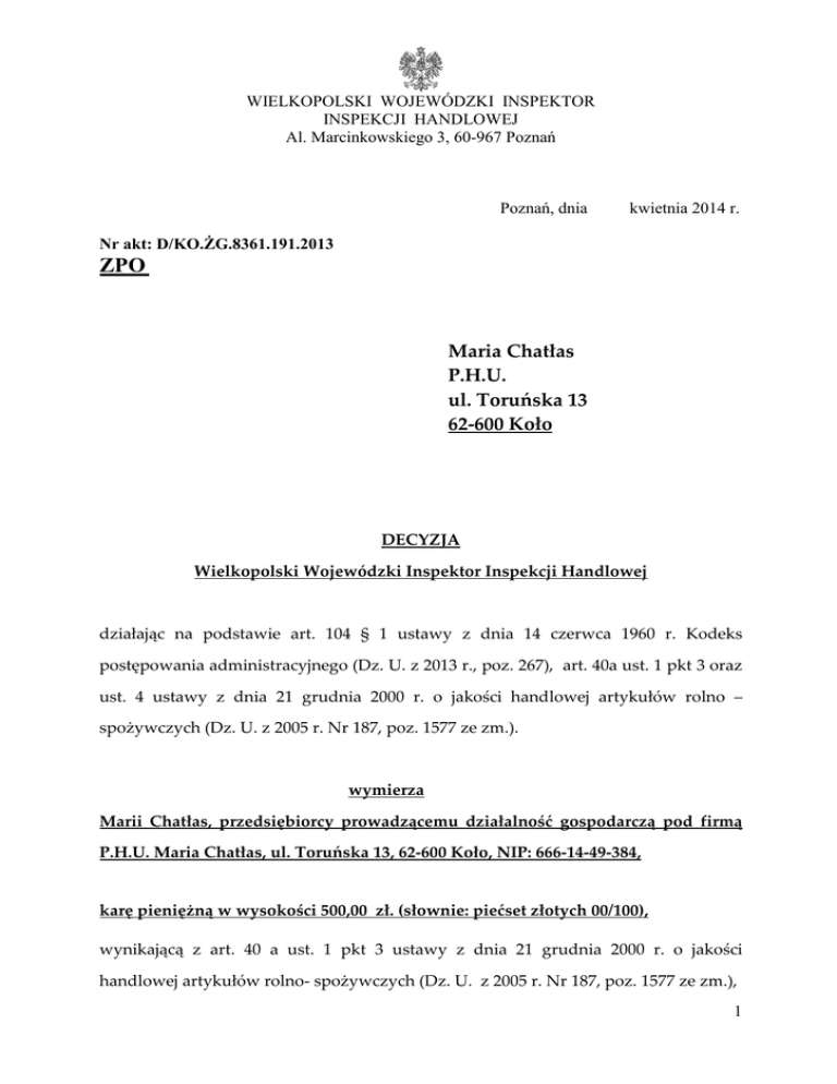 WIELKOPOLSKI WOJEWÓDZKI INSPEKTOR INSPEKCJI HANDLOWEJ Al. Marcinkowskiego 3, 60-967 Poznań Poznań, dnia kwietnia 2014 r. Nr akt: D/KO.ŻG.8361.191.2013 ZPO Maria Chatłas P.H.U. ul. Toruńska 13 62-600 Koło DECYZJA Wielkopolski Wojewódzki Inspektor Inspekcji Handlowej działając na podstawie art. 104 § 1 ustawy z dnia 14 czerwca 1960 r. Kodeks postępowania administracyjnego (Dz. U. z 2013 r., poz. 267), art. 40a ust. 1 pkt 3 oraz ust. 4 ustawy z dnia 21 grudnia 2000 r. o jakości handlowej artykułów rolno – spożywczych (Dz. U. z 2005 r. Nr 187, poz. 1577 ze zm.). wymierza Marii Chatłas, przedsiębiorcy prowadzącemu działalność gospodarczą pod firmą P.H.U. Maria Chatłas, ul. Toruńska 13, 62-600 Koło, NIP: 666-14-49-384, karę pieniężną w wysokości 500,00 zł. (słownie: piećset złotych 00/100), wynikającą z art. 40 a ust. 1 pkt 3 ustawy z dnia 21 grudnia 2000 r. o jakości handlowej artykułów rolno- spożywczych (Dz. U. z 2005 r. Nr 187, poz. 1577 ze zm.), 1 z tytułu wprowadzenia do obrotu handlowego w dniu kontroli tj. w dniu 3 grudnia 2013 roku, w sklepie mięsnym przy ul. Toruńskiej 13, 62-600 Koło, prowadzonym przez: Marię Chatłas, przedsiębiorcę prowadzącego działalność gospodarczą pod firmą P.H.U. Maria Chatłas, ul. Toruńska 13, 62-600 Koło, artykułów rolno - spożywczych nieodpowiadających jakości handlowej określonej w przepisach o jakości handlowej, ogólnej wartości 512,14 zł. W toku kontroli stwierdzono nieprawidłowości w odniesieniu do 10 partii ocenianych artykułów rolno – spożywczych, sprzedawanych luzem: a) boczek wędzony Kamieniarz – w ilości 3 kg, w cenie 21zł/kg, wartości 63 zł, dowód dostawy: faktura VAT nr 125381/13 z dnia 28.11.2013 r. od Ultrafood Jarosław Pawliński, 62-510 Konin, ul. Spółdzielców 9B, b) salceson ozorkowy Krawiec – w ilości 1 kg, w cenie 14 zł/kg, wartości 14 zł, dowód dostawy: faktura VAT nr F/2013/13832 z dnia 03.12.2013 r. od Zakład Masarski Tadeusz Krawiec, 63-505 Doruchów, Wrzosy 16, c) szynka wieprzowa gotowana Krawiec – w ilości 4,5kg, w cenie 20,50 zł/kg, wartości 92,25 zł, dowód dostawy: faktura VAT nr F/2013/13832 z dnia 03.12.2013 r. od Zakład Masarski Tadeusz Krawiec, 63-505 Doruchów, Wrzosy 16, d) polędwica sopocka Krawiec – w ilości 4 kg, w cenie 23,50 zł/kg, wartości 94 zł, dowód dostawy: faktura VAT nr F/2013/13832 z dnia 03.12.2013 r. od Zakład Masarski Tadeusz Krawiec, 63-505 Doruchów, Wrzosy 16, e) salami rogal Gzella – w ilości 2,5kg, w cenie 31 zł/kg, wartości 77,50 zł, dowód dostawy: faktura VAT nr FA/31391/2013 z dnia 02.12.2013 r. od Transhurt Arkadiusz Filmut FTUH, ul. Poznańska 72A, 62-510 Konin, f) kiełbasa krakowska parzona Gzella – w ilości 2,5kg, w cenie 21 zł/kg, wartości 52,50 zł, dowód dostawy: faktura VAT nr FA/31391/2013 z dnia 02.12.2013 r. od Transhurt Arkadiusz Filmut FTUH, ul. Poznańska 72A, 62-510 Konin, 2 g) salceson wiejski Wyszyna – w ilości 1,5kg, w cenie 21 zł/kg, wartości 22,80 zł, dowód dostawy: faktura VAT nr 9/12/2013 od Produkcja i Sprzedaż Wędlin Henryk Wiśniewski, 62-710 Władysławów, Wyszyna, ul. Kolska 9, 62-710 Władysławów, h) kiełbasa sucha Wyszyna – w ilości 3 kg, w cenie 17,50 zł/kg, wartości 52,50 zł, dowód dostawy: faktura VAT nr 9/12/2013 od Produkcja i Sprzedaż Wędlin Henryk Wiśniewski, 62-710 Władysławów, Wyszyna, ul. Kolska 9, 62-710 Władysławów, i) kiełbasa wiejska Wyszyna – w ilości 1,5kg, w cenie 17,50 zł/kg, wartości 26,25 zł, dowód dostawy: faktura VAT nr 9/12/2013 od Produkcja i Sprzedaż Wędlin Henryk Wiśniewski, 62-710 Władysławów, Wyszyna, ul. Kolska 9, 62-710 Władysławów, j) kurczak gotowany Tarczyński – w ilości 0,6kg, w cenie 28,90 zł/kg, wartości 17,34 zł, dowód dostawy: faktura VAT nr 124783/13 z dnia 27.11.2013 r. od Ultrafood Jarosław Pawliński, 62-510 Konin, ul. Spółdzielców 9B, ze względu na brak w oznakowaniu produktu wykazu składników, co jest naruszeniem § 17 ust. 1 pkt 1 i 2 rozporządzenia Ministra Rolnictwa i Rozwoju Wsi z dnia 10 lipca 2007 roku w sprawie znakowania środków spożywczych (Dz. U. nr 137, poz. 966 ze zm.) Kontrolowany wprowadził zatem do obrotu artykuły rolno-spożywcze nieodpowiadające jakości handlowej określonej w przepisach o jakości handlowej co skutkuje zastosowaniem art. 40 a ust. 1 pkt 3 ustawy o jakości handlowej artykułów rolno- spożywczych (Dz. U. z 2005, Nr 187 poz. 1577 ze zm.). „Kto wprowadza do obrotu artykuły rolno-spożywcze nieodpowiadające jakości handlowej określonej w przepisach o jakości handlowej lub deklarowanej przez producenta w oznakowaniu tych artykułów, podlega karze pieniężnej w wysokości do pięciokrotnej wartości korzyści majątkowej uzyskanej lub która mogłaby zostać uzyskana przez wprowadzenie tych artykułów rolno-spożywczych do obrotu, nie niższej jednak niż 500 zł.”. 3 Uzasadnienie Podczas kontroli przeprowadzonej przez Wielkopolskiego Wojewódzkiego Inspektora Inspekcji Handlowej, w dniach od 3 do 6 grudnia 2013 roku w sklepie mięsnym przy ul. Toruńskiej 13, 62-600 Koło, prowadzonym przez: Marię Chatłas, przedsiębiorcę prowadzącego działalność gospodarczą pod firmą P.H.U. Maria Chatłas, ul. Toruńska 13, 62-600 Koło, artykułów rolno - spożywczych nieodpowiadających jakości handlowej określonej w przepisach o jakości handlowej, ogólnej wartości 512,14 zł. W toku kontroli stwierdzono nieprawidłowości w odniesieniu do 10 partii ocenianych artykułów rolno – spożywczych, sprzedawanych luzem: a) boczek wędzony Kamieniarz – w ilości 3 kg, w cenie 21zł/kg, wartości 63 zł, dowód dostawy: faktura VAT nr 125381/13 z dnia 28.11.2013 r. od Ultrafood Jarosław Pawliński, 62-510 Konin, ul. Spółdzielców 9B, b) salceson ozorkowy Krawiec – w ilości 1 kg, w cenie 14 zł/kg, wartości 14 zł, dowód dostawy: faktura VAT nr F/2013/13832 z dnia 03.12.2013 r. od Zakład