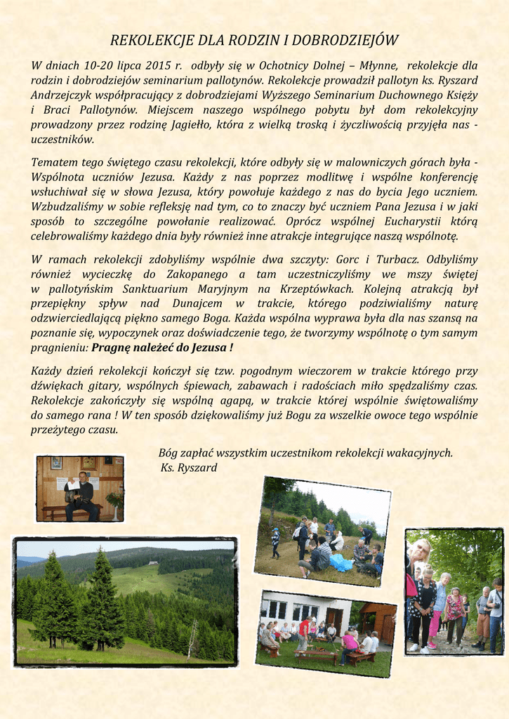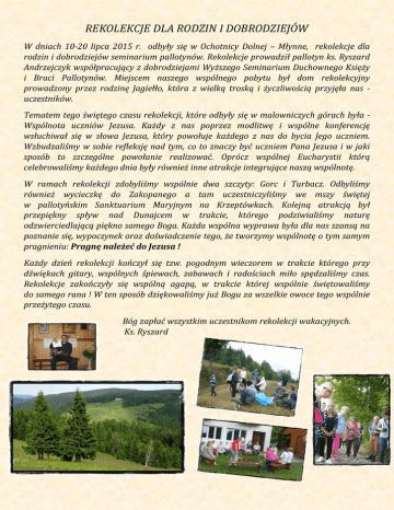 REKOLEKCJE DLA RODZIN I DOBRODZIEJÓW W dniach 10-20 lipca 2015 r. odbyły się w Ochotnicy Dolnej – Młynne, rekolekcje dla rodzin i dobrodziejów seminarium pallotynów. Rekolekcje prowadził pallotyn ks. Ryszard Andrzejczyk współpracujący z dobrodziejami Wyższego Seminarium Duchownego Księży i Braci Pallotynów. Miejscem naszego wspólnego pobytu był dom rekolekcyjny prowadzony przez rodzinę Jagiełło, która z wielką troską i życzliwością przyjęła nas uczestników. Tematem tego świętego czasu rekolekcji, które odbyły się w malowniczych górach była Wspólnota uczniów Jezusa. Każdy z nas poprzez modlitwę i wspólne konferencję wsłuchiwał się w słowa Jezusa, który powołuje każdego z nas do bycia Jego uczniem. Wzbudzaliśmy w sobie refleksję nad tym, co to znaczy być uczniem Pana Jezusa i w jaki sposób to szczególne powołanie realizować. Oprócz wspólnej Eucharystii którą celebrowaliśmy każdego dnia były również inne atrakcje integrujące naszą wspólnotę. W ramach rekolekcji zdobyliśmy wspólnie dwa szczyty: Gorc i Turbacz. Odbyliśmy również wycieczkę do Zakopanego a tam uczestniczyliśmy we mszy świętej w pallotyńskim Sanktuarium Maryjnym na Krzeptówkach. Kolejną atrakcją był przepiękny spływ nad Dunajcem w trakcie, którego podziwialiśmy naturę odzwierciedlającą piękno samego Boga. Każda wspólna wyprawa była dla nas szansą na poznanie się, wypoczynek oraz doświadczenie tego, że tworzymy wspólnotę o tym samym pragnieniu: Pragnę należeć do Jezusa ! Każdy dzień rekolekcji kończył się tzw. pogodnym wieczorem w trakcie którego przy dźwiękach gitary, wspólnych śpiewach, zabawach i radościach miło spędzaliśmy czas. Rekolekcje zakończyły się wspólną agapą, w trakcie której wspólnie świętowaliśmy do samego rana ! W ten sposób dziękowaliśmy już Bogu za wszelkie owoce tego wspólnie przeżytego czasu. Bóg zapłać wszystkim uczestnikom rekolekcji wakacyjnych. Ks. Ryszard
