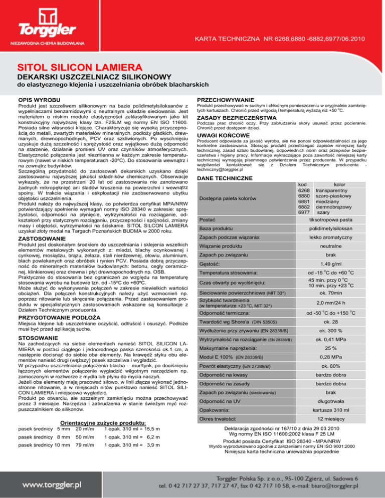 KARTA TECHNICZNA NR 6268,6880 -6882,6977/06.2010 SITOL SILICON LAMIERA DEKARSKI USZCZELNIACZ SILIKONOWY do elastycznego klejenia i uszczelniania obróbek blacharskich OPIS WYROBU PRZECHOWYWANIE Produkt jest szczeliwem silikonowym na bazie polidimetylsiloksanów z wypełniaczami benzamidowymi o neutralnym układzie sieciowania. Jest materiałem o niskim module elastyczności zaklasyfikowanym jako kit konstrukcyjny najwyższej klasy tzn. F25LM wg normy EN ISO 11600. Posiada silne własności klejące. Charakteryzuje się wysoką przyczepnością do metali, zwartych materiałów mineralnych, podłoży gładkich, drewnianych, drewnopochodnych, PCV oraz szkliwionych. Po wyschnięciu uzyskuje dużą szczelność i sprężystość oraz wyjątkowo dużą odporność na starzenie, działanie promieni UV oraz czynników atmosferycznych. Elastyczność połączenia jest niezmienna w każdym zakresie temperaturowym (nawet w niskich temperaturach -20ºC). Do stosowania wewnątrz i na zewnątrz budynków. Szczególną przydatność do zastosowań dekarskich uzyskano dzięki zastosowaniu najwyższej jakości składników chemicznych. Obserwacje wykazały, że na przestrzeni 20 lat od zastosowania nie zanotowano żadnych mikropęknięć ani śladów kruszenia na powierzchni i wewnątrz spoiny. W trakcie wiązania i eskploatacji nie zaobserwowano ubytku objętości uszczelnienia. Produkt należy do najwyższej klasy, co potwierdza certyfikat MPA/NRW potwierdzający spełnienie wymagań normy ISO 28340 w zakresie: sprężystości, odporności na płynięcie, wytrzymałości na rozciąganie, odkształceń przy statycznym rozciąganiu, przyczepności i spójności, zmiany masy i objętości, wytrzymałości na ściskanie. SITOL SILCON LAMIERA uzyskał złoty medal na Targach Poznańskich BUDMA w 2000 roku. Produkt przechowywać w suchym i chłodnym pomieszczeniu w oryginalnie zamkniętych kartuszach. Chronić przed wilgocią i temperaturą wyższą niż +50 oC. ZASADY BEZPIECZEŃSTWA Podczas prac chronić oczy. Przy zabrudzeniu skóry usuwać przez pocieranie. Chronić przed dostępem dzieci. UWAGI KOŃCOWE Producent odpowiada za jakość wyrobu, ale nie ponosi odpowiedzialności za jego konkretne zastosowania. Stosując produkt przestrzegać zapisów niniejszej karty technicznej, zasad sztuki budowlanej, odpowiednich norm oraz przepisów bezpieczeństwa i higieny pracy. Informacje wykraczające poza zawartość niniejszej karty technicznej wymagają pisemnego potwierdzenia przez producenta. W przypadku wątpliwości kontaktować się z Działem Technicznym producenta [email protected] DANE TECHNICZNE Dostępna paleta kolorów kod 6268 6880 6881 6882 6977 kolor transparentny szaro-piaskowy miedziany ciemnobrązowy szary Postać tiksotropowa pasta Baza produktu polidimetylsiloksan ZASTOSOWANIE Zapach podczas wiązania: lekko aromatyczny Produkt jest doskonałym środkiem do uszczelniania i sklejenia wszelkich elementów metalowych wykonanych z: miedzi, blachy ocynkowanej i cynkowej, mosiądzu, brązu, żelaza, stali nierdzewnej, ołowiu, aluminium, blach powlekanych oraz obróbek i rynien PCV. Posiada dobrą przyczepność do mineralnych materiałów budowlanych: betonu, cegły ceramicznej, klinkierowej oraz drewna i płyt drewnopochodnych np. OSB. Praktycznie do stosowania bez ograniczeń ze względu na temperaturę stosowania wyrobu na budowie tzn. od -15ºC do +60ºC. Może służyć do wykonywania połączeń w zakresie niewielkich wartości obciążeń. Dla połączeń konstrukcyjnych należy użyć wzmocnień np. poprzez nitowanie lub skręcanie połączenia. Przed zastosowaniem produktu w specjalistycznych zastosowaniach wskazane są konsultacje z Działem Technicznym producenta. Wiązanie produktu PRZYGOTOWANIE PODŁOŻA Zapach po związaniu Gęstość: Temperatura stosowania: Czas otwarty po wyciśnięciu: Sieciowanie powierzchniowe (MIT 33*) Szybkość twardnienia (w temperaturze +23 oC, MIT 32*) Odporność termiczna: STOSOWANIE Wytrzymałość na rozciąganie (EN 28339/B) pasek średnicy 5 mm 20 ml/m 1 opak. 310 ml = 15,5 m pasek średnicy 8 mm 50 ml/m 1 opak. 310 ml = 6,2 m pasek średnicy 10 mm 79 ml/m 1 opak. 310 ml = 3,9 m o o od -15 C do +60 C o Twardość wg Shore’a (DIN 53505) Orientacyjne zużycie produktu: brak 1,49 g/ml Miejsca klejone lub uszczelniane oczyścić, odtłuścić i osuszyć. Podłoże musi być przed aplikacją suche. Na zachodzących na siebie elementach nanieść SITOL SILICON LAMIERA w postaci ciągłego i jednorodnego paska szerokości ok.1 cm, a następnie docisnąć do siebie oba elementy. Na krawędź styku obu elementów nanieść drugi (węższy) pasek szczeliwa i wygładzić. W przypadku uszczelniania połączenia blacha - mur/tynk, po dociśnięciu łączonych elementów połączenie wygładzić wilgotnym narzędziem np. zamoczonym w roztworze z mydła lub płynu do mycia naczyń. Jeżeli oba elementy mają pracować siłowo, w linii złącza wykonać jednostronne nitowanie, a w miejscach nitów punktowo nanieść SITOL SILICON LAMIERA i miejscowo wygładzić. Produkt po otwarciu, ale szczelnym zamknięciu można przechowywać przez 3 miesiące. Narzędzia i zabrudzenia w stanie świeżym myć rozpuszczalnikiem do silikonów. neutralne Wydłużenie przy zrywaniu (EN 28339/B) Maksymalne naprężenia: Moduł E 100% (EN 28339/B) Powrót elastyczny (EN 27389/B) 45 min. przy 0 C o 10 min. przy +23 C ok. 79min 2,0 mm/24 h o o od -50 C do +150 C ok. 28 ok. 300 % ok. 0,41 MPa 25 % 0,28 MPa ok. 80% Odporność na kwasy bardzo dobra Odporność na zasady bardzo dobra Zapach po związaniu (sieciowaniu) Odporność na UV Opakowania: Okres trwałości: brak długotrwała kartusze 310 ml 12 miesięcy Deklaracja zgodności nr 167/10 z dnia 29 03 2010 Wg normy EN ISO 11600:2002 klasa F 25 LM Produkt posiada Certyfikat ISO 28340 –MPA/NRW Wyrób wyprodukowano zgodnie z założeniami normy EN ISO 9001:2000 Niniejsza karta techniczna unieważnia poprzednie