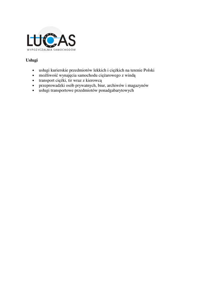 Usługi • • • • • usługi kurierskie przedmiotów lekkich i ciężkich na terenie Polski możliwość wynajęcia samochodu ciężarowego z windą transport ciężki, tir wraz z kierowcą przeprowadzki osób prywatnych, biur, archiwów i magazynów usługi transportowe przedmiotów ponadgabarytowych