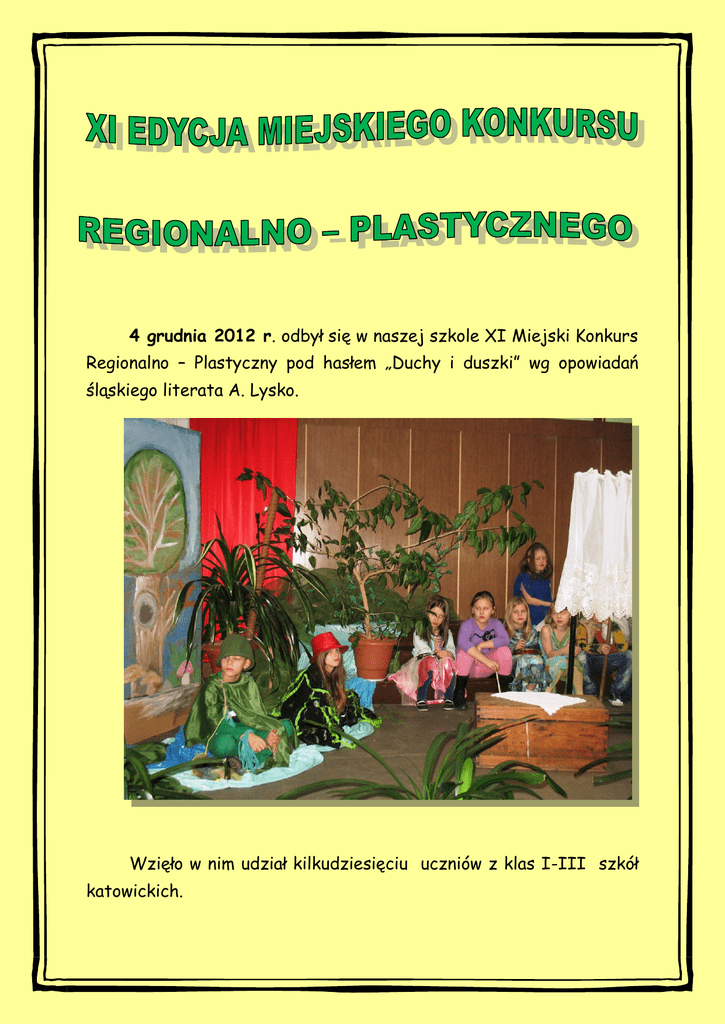 4 grudnia 2012 r. odbył się w naszej szkole XI Miejski Konkurs Regionalno – Plastyczny pod hasłem „Duchy i duszki” wg opowiadań śląskiego literata A. Lysko. Wzięło w nim udział kilkudziesięciu uczniów z klas I-III szkół katowickich. Uczestnicy wykonywali prace malarskie pastelami olejnymi, farbami akwarelowymi lub tuszami. Inspiracją do ich tworzenia były prezentacje śląskich duszków. Uczniowie naszej szkoły klasy IA i IIB prezentowali postacie z panteonu śląskich stworków opisanych przez Alojzego Lysko. Na scenie pojawiły się utopce, diabły, kuternogi, cordybony, beboki, szczygi, meluzyny i beboki. W oczekiwaniu na nagrody goście wysłuchali śląskich piosenek wykonywanych a capella przez Natalię Rakoczy i Paulinę Hucz z klasy IVB.