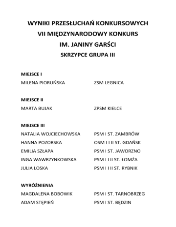 WYNIKI PRZESŁUCHAŃ KONKURSOWYCH VII MIĘDZYNARODOWY KONKURS IM. JANINY GARŚCI SKRZYPCE GRUPA III MIEJSCE I MILENA PIORUŃSKA ZSM LEGNICA MIEJSCE II MARTA BUJAK ZPSM KIELCE MIEJSCE III NATALIA WOJCIECHOWSKA PSM I ST. ZAMBRÓW HANNA POZORSKA OSM I I II ST. GDAŃSK EMILIA SZŁAPA PSM I ST. JAWORZNO INGA WAWRZYNKOWSKA PSM I I II ST. ŁOMŻA JULIA LOSKA PSM I I II ST. RYBNIK WYRÓŻNIENIA MAGDALENA BOBOWIK PSM I ST. TARNOBRZEG ADAM STĘPIEŃ PSM I ST. BĘDZIN WYNIKI PRZESŁUCHAŃ KONKURSOWYCH VII MIĘDZYNARODOWY KONKURS IM. JANINY GARŚCI SKRZYPCE GRUPA IV MIEJSCE I WIKTORIA BIAŁOSTOCKA POSM II ST. KRAKÓW MIEJSCE II DOMINIKA WIERCIOCH POSM II ST. KRAKÓW MIEJSCE III DENYS KOZLOV ZSM NR 1 RZESZÓW WYRÓŻNIENIA MARIA ELENA LASCAR MAJA FAMUŁA ZSM LEGNICA OSM I I II ST. BYTOM
