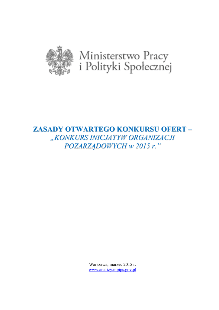 ZASADY OTWARTEGO KONKURSU OFERT – „KONKURS INICJATYW ORGANIZACJI POZARZĄDOWYCH w 2015 r.” Warszawa, marzec 2015 r. www.analizy.mpips.gov.pl SPIS TREŚCI: KTO MOŻE UBIEGAĆ SIĘ O PRZYZNANIE DOTACJI? ........................................... 3 I. 1. 2. PODMIOTY UPRAWNIONE ............................................................................................ 3 OFERTA WSPÓLNA ......................................................................................................... 4 II. ŚRODKI FINANSOWE NA REALIZACJĘ ZADAŃ PUBLICZNYCH ........................ 4 1. 2. 3. ŚRODKI WŁASNE ............................................................................................................ 5 KOSZTY KWALIFIKOWALNE ....................................................................................... 5 KOSZTY NIEKWALIFIKOWALNE ................................................................................ 7 III. CZAS REALIZACJI ZADAŃ ............................................................................................. 7 IV. KRYTERIA WYBORU OFERT ......................................................................................... 8 1. 2. 3. 4. 5. V. OCENA FORMALNA........................................................................................................ 8 OCENA MERYTORYCZNA ............................................................................................. 9 REKOMENDACJA WYBORU OFERTY ....................................................................... 10 OGŁOSZENIE WYNIKÓW ............................................................................................ 10 POSTĘPOWANIE ODWOŁAWCZE .............................................................................. 10 ZAWARCIE UMOWY I PRZEKAZANIE ŚRODKÓW ............................................... 10 VI. REALIZACJA ZADANIA PUBLICZNEGO .................................................................. 11 VII. ROZLICZANIE DOTACJI, SPRAWOZDANIE I KONTROLA Z REALIZACJI ZADANIA .................................................................................................................................... 11 1. Zasady otwartego konkursu ofert w ramach „Konkursu Inicjatyw Organizacji Pozarządowych w 2015 r.”, zwane dalej „Zasadami”, zawierają podstawowe informacje o otwartym konkursie ofert – Konkurs Inicjatyw Organizacji Pozarządowych w 2015 r. 2. Konkurs Inicjatyw Organizacji Pozarządowych w 2015 r. zwany jest dalej zamiennie „KIOP 2015” lub „konkurs”. 2 I. KTO MOŻE UBIEGAĆ SIĘ O PRZYZNANIE DOTACJI? Minister Pracy i Polityki Społecznej, zwany dalej „Ministrem”, ogłasza otwarty konkurs ofert – Konkurs Inicjatyw Organizacji Pozarządowych w 2015 r. (KIOP 2015). Jest on ogłaszany dla projektów z obszaru: wyrównywanie szans kobiet i mężczyzn na rynku pracy. W roku 2015 temat otwartego konkursu ofert brzmi: Więcej kobiet w zawodach zdominowanych przez mężczyzn. Zakres możliwych do zrealizowania w ramach konkursu działań obejmuje wszystkie obszary działalności pożytku publicznego wymienione w art. 4 ustawy z dnia 24 kwietnia 2003 r. o działalności pożytku publicznego i o wolontariacie (Dz. U. z 2014 r. poz. 1118, 1138 i 1146), zwanej dalej „UDPP”. Realizowane działania mają przyczynić się do przełamywania stereotypów dotyczących roli kobiety na rynku pracy. Grupa docelowa: kobiety. Przykładowe środowiska: obszary wiejskie lub miejskie, długotrwale bezrobotne kobiety, matki rodzin wielodzietnych, matki samotnie wychowujące dzieci, kobiety wychodzące z nałogów, byłe więźniarki itp. 1. PODMIOTY UPRAWNIONE Podmiotami uprawnionymi do składania ofert w konkursie są organizacje pozarządowe w rozumieniu art. 3 ust. 2 UDPP, posiadające siedzibę na terytorium Rzeczypospolitej Polskiej oraz podmioty, o których mowa w art. 3 ust. 3 UDPP, tj. osoby prawne i jednostki organizacyjne działające na podstawie przepisów o stosunku Państwa do Kościoła Katolickiego w Rzeczypospolitej Polskiej, o stosunku Państwa do innych kościołów i związków wyznaniowych oraz o gwarancjach wolności sumienia i wyznania, jeżeli ich cele statutowe obejmują prowadzenie działalności pożytku publicznego, jak również stowarzyszenia jednostek samorządu terytorialnego, spółdzielnie socjalne, a także spółki akcyjne i spółki z ograniczoną odpowiedzialnością oraz kluby sportowe będące spółkami działającymi na podstawie przepisów ustawy z dnia 25 czerwca 2010 r. o sporcie (Dz. U. z 2014 r. poz. 715), które nie działają w celu osiągnięcia zysku oraz przeznaczają całość dochodu na realizację celów statutowych oraz nie przeznaczają zysku do podziału między swoich członków, udziałowców, akcjonariuszy i pracowników. Uprawniony podmiot, składając ofertę w niniejszym konkursie, oświadcza, że w 2014 roku: - nie została wydana decyzja administracyjna w sprawie zwrotu dotacji wydatkowanej w nadmiernej wysokości, niezgodnie z przeznaczeniem, pobranej nienależnie; - nie zostało wydane orzeczenie sądu administracyjnego utrzymujące zaskarżoną decyzję administracyjną; - nie toczy się postępowanie egzekucyjne przeciwko Oferentowi, które mogłoby spowodować zajęcie dotacji na poczet zobowiązań Oferenta. Każdy uprawniony podmiot może złożyć wyłącznie jedną ofertę (w tym ofertę wspólną) w ramach niniejszego konkursu. Oznacza to, iż np. 2 organizacje, składając ofertę wspólnie, nie mogą składać także ofert samodzielnie. 3 2. OFERTA WSPÓLNA Ofertę wspólną może złożyć kilka (co najmniej 2) podmiotów uprawnionych do aplikowania o środki w ramach konkursu. Oferta wspólna (w stosunku do oferty składanej przez jeden podmiot uprawniony) powinna zawierać dodatkowe informacje: określenie działań w ramach realizacji zadania publicznego, które będą wykonywać poszczególne podmioty uprawnione do oferty wspólnej, a także sposób reprezentacji podmiotów uprawn