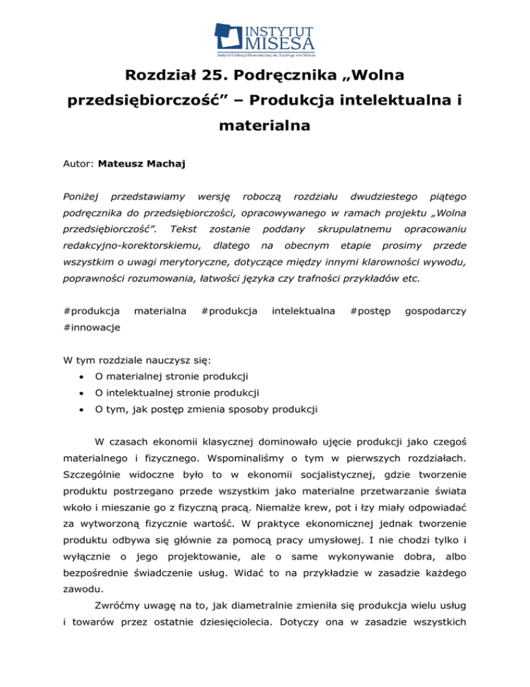 Rozdział 25. Podręcznika „Wolna przedsiębiorczość” – Produkcja intelektualna i materialna Autor: Mateusz Machaj Poniżej przedstawiamy wersję roboczą rozdziału dwudziestego piątego podręcznika do przedsiębiorczości, opracowywanego w ramach projektu „Wolna przedsiębiorczość”. Tekst zostanie redakcyjno-korektorskiemu, poddany dlatego na skrupulatnemu obecnym etapie opracowaniu prosimy przede wszystkim o uwagi merytoryczne, dotyczące między innymi klarowności wywodu, poprawności rozumowania, łatwości języka czy trafności przykładów etc. #produkcja materialna #produkcja intelektualna #postęp gospodarczy #innowacje W tym rozdziale nauczysz się: O materialnej stronie produkcji O intelektualnej stronie produkcji O tym, jak postęp zmienia sposoby produkcji W czasach ekonomii klasycznej dominowało ujęcie produkcji jako czegoś materialnego i fizycznego. Wspominaliśmy o tym w pierwszych rozdziałach. Szczególnie widoczne było to w ekonomii socjalistycznej, gdzie tworzenie produktu postrzegano przede wszystkim jako materialne przetwarzanie świata wkoło i mieszanie go z fizyczną pracą. Niemalże krew, pot i łzy miały odpowiadać za wytworzoną fizycznie wartość. W praktyce ekonomicznej jednak tworzenie produktu odbywa się głównie za pomocą pracy umysłowej. I nie chodzi tylko i wyłącznie o jego projektowanie, ale o same wykonywanie dobra, albo bezpośrednie świadczenie usług. Widać to na przykładzie w zasadzie każdego zawodu. Zwróćmy uwagę na to, jak diametralnie zmieniła się produkcja wielu usług i towarów przez ostatnie dziesięciolecia. Dotyczy ona w zasadzie wszystkich zawodów. Przyjrzyjmy się chociażby zawodom bankowca, mechanika samochodowego czy lekarza. Bankowiec sto la temu, działający w jakimś mieście, musiał orientować się mniej więcej, który kredytobiorca jest godny zaufania, to jest jaka jest jego zdolność kredytowa (czyli możliwość spłacania pożyczonych pieniędzy). Oprócz tego bankowiec starał się monitorować potencjalne inwestycje, które mogą przynieść satysfakcjonujące zwroty na kapitale. Dzisiejszy bankowiec operuje dużo większą liczbą danych. Posługuje się daleko bardzo skomplikowanymi metodami szacowania zdolności kredytowej, ma do dyspozycji dużo bardziej zaawansowane narzędzia statystyczne. Ma także dostęp do znacznie skuteczniejszego przetwarzania danych i wyciągania z nich potrzebnych informacji. Nie inaczej uległa zmianie ewolucja zawodu lekarza. Kluczowe było oczywiście pogłębienie wiedzy przez ostatnie kilkadziesiąt lat, które pozwoliło na dokładniejsze klasyfikowanie wirusów, bakterii i chorób, a następnie powiązywanie ich z konkretnymi metodami diagnostycznymi i terapiami. W efekcie rozwinęła się również farmacja. Oprócz niej nastąpił postęp w badaniach dodatkowych. Lekarz nie opiera się dzisiaj na badaniu klinicznym, ale zleca kolejne: rentgen, rezonans, USG. Wszystkie powyższe czynniki sprawiają, że współczesny lekarz musi lepiej się orientować w narzędziach ochrony zdrowia pacjenta. Oczywiście w branży medycznej powstawało dużo więcej specjalizacji. Jeden lekarz nie jest w stanie znać się na wszystkim. Nie zmienia to jednak faktu, że nawet wyspecjalizowany lekarz musi mieć dużo większy ogląd sytuacji i dostępnych metod niż lekarz sprzed dziesiątek lat. Równie dobrym przykładem jest zawód mechanika samochodowego. Kiedyś mechanikiem była osoba z wkrętakiem w ręce, która dobrze potrafiła sprawdzić wytrzymałość i funkcjonalność części mechanicznych samochodu. W tej chwili nasze pojazdy są znacznie bardziej skomplikowane. Mechanik ma do czynienia z zaawansowaną elektroniką samochodową i powiązanymi z nią elementami komputerowymi; skomplikowały się również części mechaniczne. I chociaż tutaj również wprowadzony został głęboki podział pracy i specjalizacja, to mechanik wie dużo więcej niż mechanik sprzed kilkudziesięciu lat. Musi być w stanie podłączyć komputer, przeanalizować diagnostykę komputerową i być w stanie zlokalizować problem, który niejednokrotnie dużo trudniej odnaleźć niż w znacznie prostszych samochodach. Te tendencje do wzrostu roli pracy intelektualnej nad materialną są zauważalne w krajach, które doświadczyły wysokiego wzrostu gospodarczego. Co więcej, ponieważ dobra kapitałowe, wyprodukowane narzędzia, stają się bardzo powszechne w tych gospodarkach, to stają się relatywnie tańsze. Zaś na znaczeniu ekonomicznym zyskuje coraz bardziej praca intelektualna i to za nią przede wszystkim płacimy duże kwoty. Nie oznacza to jednak, że taka praca nie przynosi istotnej ekonomicznej wartości. Przeciwnie, to dzięki niej osiągamy coraz to lepszą efektywność w tworzeniu produktów i dostarczaniu ich w dużej ilości konsumentom. Wyjdźmy od prostego przykładu trochę większego sklepu spożywczego. Właściciel tego sklepu nie tylko wystawia towar na półki, ale odpowiednio stara się je pogrupować tak, aby klientowi łatwiej było je odnaleźć. Sklep powinien być zorganizowany tak, aby sprawnie można było się po nim przemieścić z wózkiem bez konieczności zbytniego krążenia, czy wpadania na innych klientów. Kasy muszą sprawnie obsługiwać klientów, braki na półach powinny być szybko uzupełniane dostawami z magazynu, a w razie nagłego zwiększenia kolejki pojawia się system przesuwania pracowników np. od magazynu do drugiej kasy, która pozwoli szybciej obsłużyć klientów. Do tego dochodzą sprawy z zaopatrzeniem, dbaniem o media, dostawy wody, prądu, terminal do kart kredytowych… To jest oczywiście trywialny przykład, który każdy z nas może dziś obserwować w większości sklepów. Ale jeszcze na początku lat dziewięćdziesiątych w Polsce tak było w niewielu sklepach. Sprawność obsługi klientów była na dużo słabszym poziomie, podobnie jak organizacja w dostarczaniu produktów. Zakupy były bar