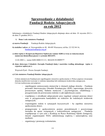 Sprawozdanie z działalności Fundacji Rodzin Adopcyjnych za rok 2012 Informacja z działalności Fundacji Rodzin Adopcyjnych obejmuje okres od dnia 01 stycznia 2012 r. do dnia 31 grudnia 2012 r. I. Dane i cele statutowe Fundacji a) nazwa Fundacji: Fundacja Rodzin Adopcyjnych. b) siedziba i adres: ul. Nowogrodzka nr 49, 00-695 Warszawa; tel/fax: 22 522 84 16, [email protected] c) data wpisu w Krajowym Rejestrze Sądowym i numer KRS-u wraz ze statystycznym numerem identyfikacyjnym w systemie REGON: 12.02.2003 r.; numer KRS 0000151113; REGON 012809577 d) dane dotyczące Członków Zarządu Fundacji (imię i nazwisko według aktualnego wpisu w rejestrze sądowym ): Wojciech Pytel - Prezes Zarządu Fundacji; e) Cele statutowe Fundacji Rodzin Adopcyjnych Celem statutowym Fundacji jest zapobieganie sieroctwu społecznemu w Polsce poprzez stwarzanie dziecku możliwości rozwoju w rodzinie naturalnej lub rodzinnym środowisku zastępczym. Cel ten realizowany jest poprzez: – zapobieganie umieszczaniu niemowląt w domach małego dziecka – Fundacja prowadzi Interwencyjny Ośrodek Preadopcyjny (IOP), zapewniając dzieciom porzuconym opiekę, badania medyczne i psychologiczne, rehabilitację i przygotowanie do powierzenia rodzinie w jak najkrótszym czasie; – współpracę z ośrodkami adopcyjnymi przy regulacji sytuacji prawnej dzieci oraz w przygotowaniu kandydatów na rodziców do rodzinnych środowisk zastępczych; – wspomaganie rodzin w sytuacjach kryzysowych – by zapobiec sieroctwu społecznemu dzieci; – propagowanie w społeczeństwie postaw prorodzinnych i pozytywnego stosunku do spraw związanych z rodzicielstwem zastępczym – Fundacja współpracuje w tym celu z Koalicją na Rzecz Rodzinnej Opieki Zastępczej, innymi organizacjami NGO, administracją rządową i samorządową oraz mediami; – organizację i promocję wolontariatu. 1/8 II. Zasady, formy i zakres działalności statutowej z podaniem realizacji celów statutowych, efektywność realizowanych zadań Zadania realizowane przez Fundację Rodzin Adopcyjnych w 2012 roku: 1. Prowadzenie Interwencyjnego Ośrodka Preadopcyjnego Zgodnie z umową nr 5/17/12 zawartą w dniu 6.03.2012 r. z Województwem Mazowieckim, Fundacja wykonywała zadanie publiczne „Prowadzenie Interwencyjnego Ośrodka Preadopcyjnego”. IOP jest unikalnym w skali kraju ośrodkiem, którego działalność polega na wszechstronnej pomocy noworodkom i niemowlętom znajdujących się w nagłych sytuacjach kryzysowych, pozbawionym czasowo lub trwale opieki rodziców. Dzieci znajdują tu całodobową opiekę, pomoc medyczną oraz, co najważniejsze, możliwość powrotu do rodziny. IOP w roku 2012 dysponowało 20 miejscami dla dzieci w wieku od urodzenia do ukończenia pierwszego roku życia. Celem działania IOP w Otwocku jest zapobieganie wykluczeniu społecznemu, poprzez jak najszybsze umieszczenie dziecka pozbawionego opieki rodzicielskiej w RODZINIE, z pełną jego historią i kompletną diagnozą. Aby skutecznie zapobiegać powstaniu i rozwojowi choroby sierocej oraz związanym z tym zaburzeniom więzi, pobyt dziecka w IOP nie powinien trwać dłużej niż 3 miesiące. W ramach programu podejmowane są wszelkie możliwe czynności, aby sytuacja prawna dziecka została uregulowana jak najszybciej. Celem jest, żeby ponad 90% dzieci znalazło się w środowisku rodzinnym. W 2012 roku udało się ten cel osiągnąć, ponad 92% dzieci, które opuściły IOP, znalazło się w środowisku rodzinnym. W okresie od 1.01.2012 r. - 31.12.2012 r. w IOP przebywało 101 niemowląt z terenu województwa mazowieckiego, z których:. Po uregulowaniu sytuacji prawnej, stymulacji rozwoju oraz kompleksowej diagnozie stanu zdrowia i rozwoju psychoruchowego - 65 niemowląt zostało powierzonych, na podstawie postanowienia sądu, do rodzin adopcyjnych. Ze wszystkimi rodzinami adopcyjnymi podjęto pracę nad budowaniem więzi z dzieckiem, identyfikacją potrzeb dziecka, doskonaleniem umiejętności pielęgnacyjnych i opiekuńczych. W efekcie pracy socjalnej, współpracy z sądem i środowiskiem lokalnym, 7 dzieci powróciło do rodzin biologicznych. Z powodu obciążenia FAS, opóźnienia rozwoju psychoruchowego, wielowadzia i innych problemów zdrowotnych, 6 dzieci zostało przeniesionych do innych from instytucjonalnej pieczy zastępczej: ZOL; RDDz lub Placówki Terapeutycznej na terenie Warszawy. Na terenie IOP prowadzono intensywną pracę socjalną z 28 rodzinami naturalnymi, których dzieci zostały umieszczone w Ośrodku. Dziesięć z tych rodzin podpisało kontrakty socjalne. Powodem umieszczenia dzieci były np. uzależnienie rodziców od narkotyków, alkoholu, upośledzenie umysłowe rodziców, ich niezaradność wychowawcza, bezdomność. Prowadzono współpracę z kuratorami sądowymi, terapeutami ds. uzależnień, szpitalami zakaźnymi, OPS-ami, Fundacją „Korale” w kierunku reintegracji tych dzieci do rodziny. 2/8 Dzięki ścisłej współpracy z ośrodkami adopcyjnymi oraz sądami rodzinnymi, średni czas pobytu dzieci wypisanych z IOP w okresie sprawozdawczym, wynosił 109 dni (3,5 miesiąca). Prowadzono stałą współpracę z trzema ośrodkami adopcyjnymi w celu regulacji sytuacji prawnej dzieci. Dnia 31 grudnia 2012 r. w IPO przebywało 23 dzieci, których sytuacja prawna była w trakcie regulacji, a proces diagnostyczny nie był jeszcze zakończony. Wszystkie dzieci (101) zostały ocenione przez fizjoterapeutę pod kątem rozwoju ruchowego według metody Prechtla, z których 30 wymagało rehabilitacji metodą NDT Bobath. W okresie sprawozdawczym odbyło się 86 konsultacji neurologicznych. Wszystkie dzieci, które zostały przyjęte do IOP w roku 2011, miały już przeprowadzoną taką diagnostykę. Na podstawie obserwacji, oceny rozwoju ruchowego, konsultacji neurologicznej oraz badania skalą DSR sporządzono 121 diagnoz rozwoju psychoruchowego z zaleceniami do dalszej stymulacji rozwoju. Z powodu złego stanu zdrowia i nieharmonijnego rozwoju dzi