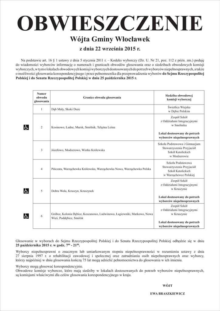 OBWIESZCZENIE Wójta Gminy Włocławek z dnia 22 września 2015 r. Na podstawie art. 16 § 1 ustawy z dnia 5 stycznia 2011 r. – Kodeks wyborczy (Dz. U. Nr 21, poz. 112 z późn. zm.) podaję do wiadomości wyborców informację o numerach i granicach obwodów głosowania oraz o siedzibach obwodowych komisji wyborczych, w tym o lokalach obwodowych komisji wyborczych dostosowanych do potrzeb wyborców niepełnosprawnych, a także o możliwości głosowania korespondencyjnego i przez pełnomocnika dla przeprowadzenia wyborów do Sejmu Rzeczypospolitej Polskiej i do Senatu Rzeczypospolitej Polskiej w dniu 25 października 2015 r. Numer obwodu głosowania 1 2 Siedziba obwodowej komisji wyborczej Granice obwodu głosowania Świetlica Wiejska w Dębie Polskim Dąb Mały, Skoki Duże Zespół Szkół z Oddziałami Integracyjnymi w Smólniku Kosinowo, Ładne, Mursk, Smólnik, Telążna Leśna Lokal dostosowany do potrzeb wyborców niepełnosprawnych 3 4 5 Szkoła Podstawowa i Gimnazjum Stowarzyszenia Przyjaciół Szkół Katolickich w Modzerowie Józefowo, Modzerowo, Wistka Królewska Pińczata, Warząchewka Królewska, Warząchewka Nowa, Warząchewka Polska Szkoła Podstawowa Stowarzyszenia Przyjaciół Szkół Katolickich w Warząchewce Polskiej Zespół Szkół z Oddziałami Integracyjnymi w Kruszynie Dobra Wola, Kruszyn, Kruszynek Lokal dostosowany do potrzeb wyborców niepełnosprawnych 6 Gróbce, Kolonia Dębice, Koszanowo, Ludwinowo, Łagiewniki, Markowo, Nowa Wieś, Poddębice, Smólsk Zespół Szkół z Oddziałami Integracyjnymi w Kruszynie Lokal dostosowany do potrzeb wyborców niepełnosprawnych Głosowanie w wyborach do Sejmu Rzeczypospolitej Polskiej i do Senatu Rzeczypospolitej Polskiej odbędzie się w dniu 25 października 2015 r. w godz. 700 - 2100. Wyborcy niepełnosprawni o znacznym lub umiarkowanym stopniu niepełnosprawności w rozumieniu ustawy z dnia 27 sierpnia 1997 r. o rehabilitacji zawodowej i społecznej oraz zatrudnianiu osób niepełnosprawnych oraz wyborcy, którzy najpóźniej w dniu głosowania kończą 75 lat mogą udzielić pełnomocnictwa do głosowania w ich imieniu. Wyborcy mogą głosować korespondencyjnie. Obwodowe komisje wyborcze, które mają siedziby w lokalach dostosowanych do potrzeb wyborców niepełnosprawnych, są komisjami właściwymi dla celów głosowania korespondencyjnego w kraju. WÓJT EWA BRASZKIEWICZ