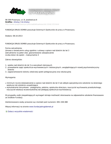 06-300 Przasnysz, ul. B. Joselewicza 6 Grafika : drukuj / nie drukuj http://www.pupprzasnysz.pl/urzad/aktualnosci/st:12/id:115.html FUNDACJA DRUGI DOMEK poszukuje Dziennych Opiekunów do pracy w Przasnyszu. Dodano: 08.10.2013 FUNDACJA DRUGI DOMEK poszukuje Dziennych Opiekunów do pracy w Przasnyszu. Forma zatrudnienia: Umowa o świadczenie usług zgodnie z ustawą o opiece nad dziećmi do lat 3 Zatrudnienie na pełen etat, gwarantowane ubezpieczenie Liczba dzieci do opieki – maksymalnie 4 Zakres obowiązków: 1. opieka nad dziećmi do lat 3 w warunkach domowych 2. prowadzenie zajęć opiekuńczo-wychowawczych i edukacyjnych, uwzględniających rozwój psychomotoryczny dziecka 3. zagwarantowanie dziecku właściwej opieki pielęgnacyjnej oraz edukacyjnej Wymagania: ● ● minimum roczne doświadczenie w opiece nad dziećmi do lat 3 lub odbyte specjalistyczne szkolenie na dziennego opiekuna lub szkolenie uzupełniające wykształcenie kierunkowe - pielęgniarka, położna, opiekunka dziecięca, nauczyciel wychowania przedszkolnego, nauczyciel edukacji wczesnoszkolnej lub pedagog opiekuńczo-wychowawczy. W przypadku osób niespełniających wymagań istnieje możliwość skierowania na odpowiednie szkolenie finansowane ze środków Fundacji. Zainteresowane osoby proszone są o kontakt pod numerem: 691-338-388 Więcej informacji na stronie www.fundacjadrugidomek.pl Zobacz wszystkie wiadomości