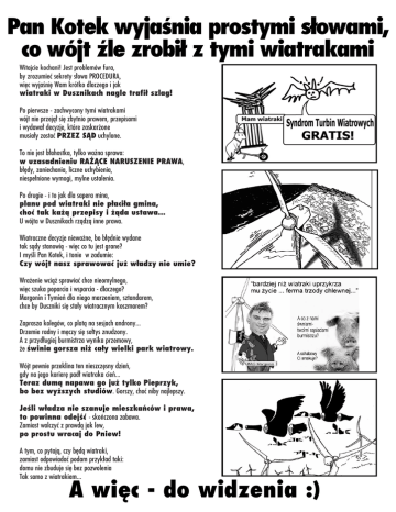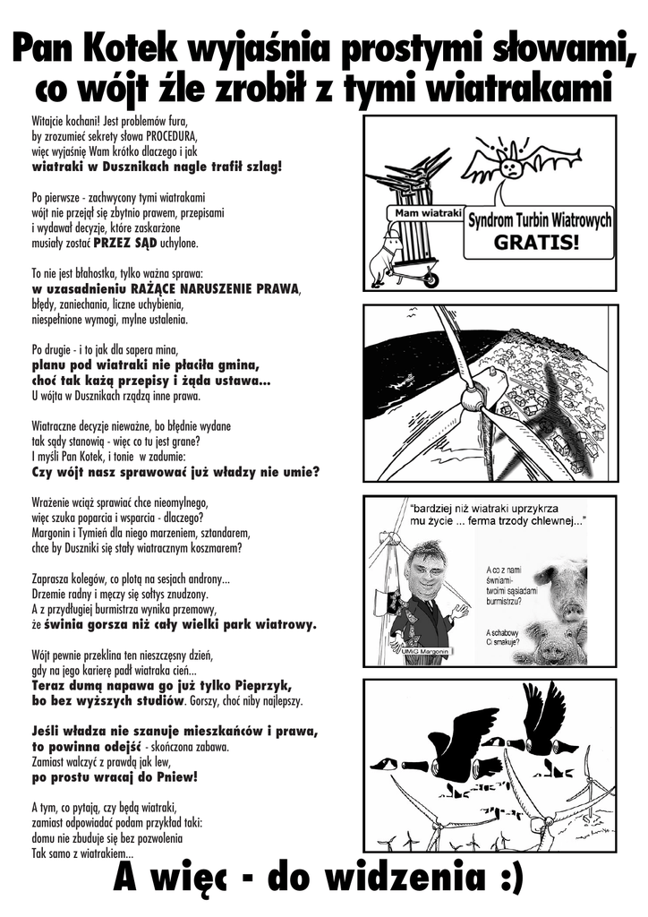 Pan Kotek wyjaÊnia prostymi s∏owami, co wójt êle zrobi∏ z tymi wiatrakami Witajcie kochani! Jest problemów fura, by zrozumieç sekrety s∏owa PROCEDURA, wi´c wyjaÊni´ Wam krótko dlaczego i jak wiatraki w Dusznikach nagle trafi∏ szlag! Po pierwsze - zachwycony tymi wiatrakami wójt nie przejà∏ si´ zbytnio prawem, przepisami i wydawa∏ decyzje, które zaskar˝one musia∏y zostaç PRZEZ SÑD uchylone. To nie jest b∏ahostka, tylko wa˝na sprawa: w uzasadnieniu RA˚ÑCE NARUSZENIE PRAWA, b∏´dy, zaniechania, liczne uchybienia, niespe∏nione wymogi, mylne ustalenia. Po drugie - i to jak dla sapera mina, planu pod wiatraki nie p∏aci∏a gmina, choç tak ka˝à przepisy i ˝àda ustawa... U wójta w Dusznikach rzàdzà inne prawa. Wiatraczne decyzje niewa˝ne, bo b∏´dnie wydane tak sàdy stanowià - wi´c co tu jest grane? I myÊli Pan Kotek, i tonie w zadumie: Czy wójt nasz sprawowaç ju˝ w∏adzy nie umie? Wra˝enie wcià˝ sprawiaç chce nieomylnego, wi´c szuka poparcia i wsparcia - dlaczego? Margonin i Tymieƒ dla niego marzeniem, sztandarem, chce by Duszniki si´ sta∏y wiatracznym koszmarem? Zaprasza kolegów, co plotà na sesjach androny... Drzemie radny i m´czy si´ so∏tys znudzony. A z przyd∏ugiej burmistrza wynika przemowy, ˝e Êwinia gorsza ni˝ ca∏y wielki park wiatrowy. Wójt pewnie przeklina ten nieszcz´sny dzieƒ, gdy na jego karier´ pad∏ wiatraka cieƒ... Teraz dumà napawa go ju˝ tylko Pieprzyk, bo bez wy˝szych studiów. Gorszy, choç niby najlepszy. JeÊli w∏adza nie szanuje mieszkaƒców i prawa, to powinna odejÊç - skoƒczona zabawa. Zamiast walczyç z prawdà jak lew, po prostu wracaj do Pniew! A tym, co pytajà, czy b´dà wiatraki, zamiast odpowiadaç podam przyk∏ad taki: domu nie zbuduje si´ bez pozwolenia Tak samo z wiatrakiem... A wi´c - do widzenia :) Ogloszenie spo∏eczne JesteÊ jego pracodawcà! Mo˝esz go odwo∏aç Tematy Czy wi´dnàcà farm´ wiatrowà da si´ o˝ywiç na przyk∏ad pieni´dzmi zza granicy? Zobaczymy... Cudowny spacer po przepi´knym parku .... wiatrowym raczej w Margoninie ni˝ Dusznikach! Pan Kotek powraca, Wardach odchodzi... Kolejny sukces przeciwników wiatraków. DomyÊlacie si´, kto nast´pny?!