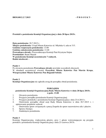 BRM.0012.2.7.2015 -PROJEKT- Protokół z posiedzenia Komisji Organizacyjnej z dnia 28 lipca 2015r. Data posiedzenia: 28.7.2015 r. Miejsce posiedzenia: Urząd Miasta Katowice ul. Młyńska 4, sala nr 315. Godzina rozpoczęcia posiedzenia: 13:00 Godzina zakończenia posiedzenia: 13:40 Prowadząca obrady: Przewodnicząca Komisji Pani Krystyna Siejna Protokolant: Beata Musiał W posiedzeniu Komisji uczestniczyło 7 radnych. Radni nieobecni: - Punkt 1 Po otwarciu posiedzenia Prowadząca obrady powitała wszystkich obecnych. W obradach uczestniczył również Prezydent Miasta Katowice Pan Marcin Krupa, Wiceprezydent Miasta Katowice Pan Bogumił Sobula. Punkt 2 Komisja Organizacyjna nie zgłosiła uwag do porządku obrad posiedzenia. 1. 2. 3. 4. 5. 6. 7. PORZĄDEK posiedzenia Komisji Organizacyjnej Rady Miasta Katowice w dniu 28 lipca 2015r. o godz. 13.00 Otwarcie posiedzenia. Przyjęcie porządku posiedzenia Komisji Organizacyjnej. Przyjęcie protokołu z posiedzenia Komisji Organizacyjnej z dnia 23.6.2015 r. Omówienie porządku obrad sesji Rady Miasta Katowice w dniu 30.7.2015 r. i opiniowanie projektów uchwał. Omówienie spraw związanych z pracą Zespołu do spraw nazewnictwa ulic i placów. Sprawy bieżące. Zamknięcie posiedzenia. Punkt 3 Komisja Organizacyjna, większością głosów, przy 1 głosie wstrzymującym się przyjęła protokół z posiedzenia Komisji Organizacyjnej z dnia 23 czerwca 2015r. 1 W tym miejscu Pan Radny Jerzy Forajter poruszył sprawę ujednolicenia wersji elektronicznej protokołów, tak aby wszystkie materiały, które obecnie znajdują się w wersji elektronicznej na „BIP”, tzn. projekty uchwał oraz pisma dołączone do porządku obrad komisji znajdujące się na portalu „Katowice.eu” zostały odzwierciedlone w postaci linkowania ich w protokołach stałych komisji Rady. Punkt 4 Prowadząca obrady przedstawiła porządek obrad XIII sesji Rady Miasta Katowice w dniu 30 lipca 2015r.: 1. Otwarcie sesji. 2. Powołanie sekretarzy sesji. 3. Powołanie Komisji Uchwał i Wniosków. 4. Przyjęcie protokołów z XI i XII sesji Rady Miasta Katowice. 5. Zmiany w porządku obrad. 6. Informacja Prezydenta Miasta Katowice z działalności między sesjami. 7. Zapytania radnych. 8. Informacja Przewodniczącej Rady Miasta Katowice o pracach Rady w okresie międzysesyjnym. 9. Informacja Prezydenta Miasta Katowice nt. realizacji uchwały nr XLVI/1070/14 Rady Miasta Katowice z dnia 26 lutego 2014r. w sprawie przystąpienia do opracowania wieloletniego planu rozwoju zintegrowanego systemu transportowego miasta Katowice (DS251/15). 10. Rozpatrzenie projektu uchwały w sprawie nadania Statutu Jednostce Pomocniczej nr 9 Osiedle Tysiąclecia ( DS-249/15). 11. Rozpatrzenie projektu uchwały w sprawie desygnowania radnych Rady Miasta Katowice do Komisji konkursowej do rozpatrywania wniosków o przyznanie Nagrody im. Józefa Kocurka w dziedzinie działalności społecznej i wyłonienia kandydata do Nagrody (DS-250/15). 12. Rozpatrzenie projektu uchwały w sprawie uchwalenia projektu Statutu Jednostki Pomocniczej nr 5 Brynów – Część Wschodnia – Osiedle Zgrzebnioka (DS-253/15). 13. Rozpatrzenie projektu uchwały w sprawie uchwalenia zmiany miejscowego planu zagospodarowania przestrzennego obszaru położonego w rejonie ulic: Asnyka, Śląskiej i Kościuszki w Katowicach (DS-254/15). 14. Rozpatrzenie projektu uchwały w sprawie przystąpienia do sporządzenia miejscowego planu zagospodarowania przestrzennego obszaru położonego w rejonie ulic: Murckowskiej i Bagiennej w Katowicach (DS-255/15). 15. Rozpatrzenie projektu uchwały w sprawie desygnowania radnych Rady Miasta Katowice do Jury Nagrody Prezydenta Miasta Katowice dla nauczycieli wychowujących młode pokolenie do aktywnego uczestnictwa w kulturze (DS-259/15). 16. Rozpatrzenie projektu uchwały w sprawie wyrażenia zgody na odstąpienie od żądania zwrotu zwaloryzowanej bonifikaty udzielonej przy sprzedaży lokalu mieszkalnego nr 1 położonego przy ul. Misjonarzy Oblatów 26 w Katowicach (DS-260/15). 17. Rozpatrzenie projektu uchwały w sprawie zmian budżetu oraz w budżecie miasta Katowice na 2015r. (DS-261/15). 18. Rozpatrzenie projektu uchwały w sprawie zmian w Wieloletniej Prognozie Finansowej miasta Katowice na lata 2015-2035 (DS-262/15). 19. Rozpatrzenie projektu uchwały zmieniającej uchwałę w sprawie przyjęcia „Zasad wynajmowania lokali wchodzących w skład mieszkaniowego zasobu miasta Katowice” ( DS263/15). 2 20. Rozpatrzenie projektu uchwały w sprawie wyrażenia zgody na odstąpienie od obowiązku przetargowego trybu oddania w dzierżawę na okres 10 lat części nieruchomości zabudowanej budynkami mieszkalnymi, położonej w Katowicach przy Placu Alfreda 3, 4 i 9 na rzecz Fundacji Pomocy Dzieciom i Seniorom „Wioska Serc im. Jana Pawła II” z siedzibą w Mysłowicach (DS-264/15). 21. Rozpatrzenie projektu uchwały w sprawie wyrażenia zgody na rozłożenie na raty wierzytelności Komunalnego Zakładu Gospodarki Mieszkaniowej w Katowicach przysługującej od pani K G z tytułu używania lokalu mieszkalnego położonego przy ul. Józefowskiej w Katowicach (DS-265/15). 22. Rozpatrzenie projektu uchwały w sprawie wyrażenia zgody na rozłożenie na raty wierzytelności Komunalnego Zakładu Gospodarki Mieszkaniowej w Katowicach wobec pani B W z tytułu używania lokalu mieszkalnego położonego w Katowicach przy ul. Wiosny Ludów (DS-266/15). 23. Rozpatrzenie projektu uchwały w sprawie wyrażenia zgody na rozłożenie na raty wierzytelności Komunalnego Zakładu Gospodarki Mieszkaniowej w Katowicach wobec pana J M i pani M M z tytułu używania lokalu mieszkalnego położonego w Katowicach przy ul. Gliwickiej (DS-267/15). 24. Rozpatrzenie projektu uchwały w sprawie przekazania do Wojewódzkiego Sądu Administracyjnego w Gliwicach skargi Wojewody Śląskiego z dnia 30.06.2015r. numer NPII.4131.2.16.2015 (DS-268/15). 25. Rozpatrzenie skarg: - Pani I M-H i Pana P H na działania p.o. Dyrekt