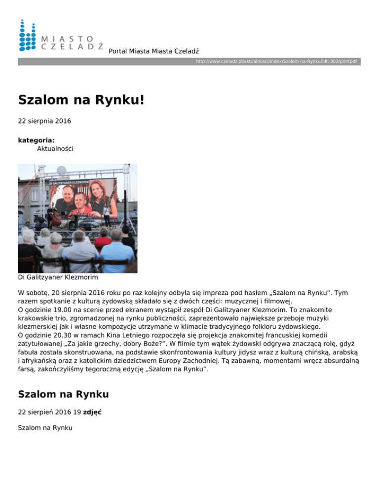 Portal Miasta Miasta Czeladź http://www.czeladz.pl/aktualnosci/index/Szalom-na-Rynku/idn:303/printpdf Szalom na Rynku! 22 sierpnia 2016 kategoria: Aktualności Di Galitzyaner Klezmorim W sobotę, 20 sierpnia 2016 roku po raz kolejny odbyła się impreza pod hasłem „Szalom na Rynku”. Tym razem spotkanie z kulturą żydowską składało się z dwóch części: muzycznej i filmowej. O godzinie 19.00 na scenie przed ekranem wystąpił zespół Di Galitzyaner Klezmorim. To znakomite krakowskie trio, zgromadzonej na rynku publiczności, zaprezentowało największe przeboje muzyki klezmerskiej jak i własne kompozycje utrzymane w klimacie tradycyjnego folkloru żydowskiego. O godzinie 20.30 w ramach Kina Letniego rozpoczęła się projekcja znakomitej francuskiej komedii zatytułowanej „Za jakie grzechy, dobry Boże?”. W filmie tym wątek żydowski odgrywa znaczącą rolę, gdyż fabuła została skonstruowana, na podstawie skonfrontowania kultury jidysz wraz z kulturą chińską, arabską i afrykańską oraz z katolickim dziedzictwem Europy Zachodniej. Tą zabawną, momentami wręcz absurdalną farsą, zakończyliśmy tegoroczną edycję „Szalom na Rynku”. Szalom na Rynku 22 sierpień 2016 19 zdjęć Szalom na Rynku Szalom na Rynku Szalom na Rynku Szalom na Rynku Szalom na Rynku Szalom na Rynku Szalom na Rynku Szalom na Rynku Szalom na Rynku Szalom na Rynku Szalom na Rynku Szalom na Rynku Szalom na Rynku Szalom na Rynku Szalom na Rynku Szalom na Rynku Szalom na Rynku Szalom na Rynku Szalom na Rynku Szalom na Rynku