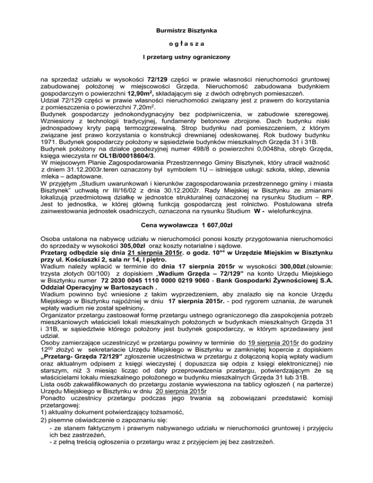 Burmistrz Bisztynka ogłasza I przetarg ustny ograniczony na sprzedaż udziału w wysokości 72/129 części w prawie własności nieruchomości gruntowej zabudowanej położonej w miejscowości Grzęda. Nieruchomość zabudowana budynkiem gospodarczym o powierzchni 12,90m2, składającym się z dwóch odrębnych pomieszczeń. Udział 72/129 części w prawie własności nieruchomości związany jest z prawem do korzystania z pomieszczenia o powierzchni 7,20m2. Budynek gospodarczy jednokondygnacyjny bez podpiwniczenia, w zabudowie szeregowej. Wzniesiony z technologii tradycyjnej, fundamenty betonowe zbrojone. Dach budynku niski jednospadowy kryty papą termozgrzewalną. Strop budynku nad pomieszczeniem, z którym związane jest prawo korzystania o konstrukcji drewnianej odeskowanej. Rok budowy budynku 1971. Budynek gospodarczy położony w sąsiedztwie budynków mieszkalnych Grzęda 31 i 31B. Budynek położony na działce geodezyjnej numer 498/8 o powierzchni 0,0048ha, obręb Grzęda, księga wieczysta nr OL1B/00018604/3. W miejscowym Planie Zagospodarowania Przestrzennego Gminy Bisztynek, który utracił ważność z dniem 31.12.2003r.teren oznaczony był symbolem 1U – istniejące usługi: szkoła, sklep, zlewnia mleka – adaptowane. W przyjętym „Studium uwarunkowań i kierunków zagospodarowania przestrzennego gminy i miasta Bisztynek” uchwałą nr III/16/02 z dnia 30.12.2002r. Rady Miejskiej w Bisztynku ze zmianami lokalizują przedmiotową działkę w jednostce strukturalnej oznaczonej na rysunku Studium – RP. Jest to jednostka, w której główną funkcją gospodarczą jest rolnictwo. Postulowana strefa zainwestowania jednostek osadniczych, oznaczona na rysunku Studium W - wielofunkcyjna. Cena wywoławcza 1 607,00zł Osoba ustalona na nabywcę udziału w nieruchomości ponosi koszty przygotowania nieruchomości do sprzedaży w wysokości 305,00zł oraz koszty notarialne i sądowe. Przetarg odbędzie się dnia 21 sierpnia 2015r. o godz. 10°° w Urzędzie Miejskim w Bisztynku przy ul. Kościuszki 2, sala nr 14, l piętro. Wadium należy wpłacić w terminie do dnia 17 sierpnia 2015r w wysokości 300,00zł.(słownie: trzysta złotych 00/100) z dopiskiem „Wadium Grzęda – 72/129” na konto Urzędu Miejskiego w Bisztynku numer 72 2030 0045 1110 0000 0219 9060 - Bank Gospodarki Żywnościowej S.A. Oddział Operacyjny w Bartoszycach . Wadium powinno być wniesione z takim wyprzedzeniem, aby znalazło się na koncie Urzędu Miejskiego w Bisztynku najpóźniej w dniu 17 sierpnia 2015r. - pod rygorem uznania, że warunek wpłaty wadium nie został spełniony. Organizator przetargu zastosował formę przetargu ustnego ograniczonego dla zaspokojenia potrzeb mieszkaniowych właścicieli lokali mieszkalnych położonych w budynkach mieszkalnych Grzęda 31 i 31B, w sąsiedztwie którego położony jest budynek gospodarczy, w którym sprzedawany jest udział. Osoby zamierzające uczestniczyć w przetargu powinny w terminie do 19 sierpnia 2015r do godziny 1200 złożyć w sekretariacie Urzędu Miejskiego w Bisztynku w zamkniętej kopercie z dopiskiem „Przetarg- Grzęda 72/129” zgłoszenie uczestnictwa w przetargu z dołączoną kopią wpłaty wadium oraz aktualnym odpisem z księgi wieczystej ( dopuszcza się odpis z księgi elektronicznej) nie starszym, niż 3 miesiąc licząc od daty przeprowadzenia przetargu, potwierdzającym że są właścicielami lokalu mieszkalnego położonego w budynku mieszkalnych Grzęda 31 lub 31B. Lista osób zakwalifikowanych do przetargu zostanie wywieszona na tablicy ogłoszeń ( na parterze) Urzędu Miejskiego w Bisztynku w dniu 20 sierpnia 2015r Ponadto uczestnicy przetargu podczas jego trwania są zobowiązani przedstawić komisji przetargowej: 1) aktualny dokument potwierdzający tożsamość, 2) pisemne oświadczenie o zapoznaniu się: - ze stanem faktycznym i prawnym nabywanego udziału w nieruchomości gruntowej i przyjęciu ich bez zastrzeżeń, - z pełną treścią ogłoszenia o przetargu wraz z przyjęciem jej bez zastrzeżeń. 3) pisemne oświadczenie, w jakich udziałach nastąpi nabycie udziału w nieruchomości, jeżeli jako jeden uczestnik przetargu wystąpi więcej niż jedna osoba fizyczna lub prawna. W przypadku nabycia udziału w nieruchomości z majątku objętego wspólnością ustawową (małżeństwo) konieczna jest obecność na przetargu obojga małżonków. W przypadku uczestnictwa w przetargu tylko jednego ze współmałżonków wymagane jest przedłożenie pisemnego oświadczenia drugiego współmałżonka o wyrażeniu zgody na nabycie udziału w nieruchomości ze środków pochodzących z majątku wspólnego, lub złożenie przez osobę przystępującą do przetargu oświadczenia woli nabycia nieruchomości z majątku osobistego. Uczestnikowi przetargu, który przetarg wygra, wpłacone wadium zostanie zaliczone na poczet ceny nabycia udziału w nieruchomości. Uczestnikom przetargu, którzy go nie wygrają, wadium zostanie zwrócone niezwłocznie po zamknięciu przetargu, nie później niż przed upływem 3 dni. W razie uchylenia się uczestnika, który wygra przetarg, od zawarcia umowy, wpłacone wadium nie podlega zwrotowi. Nabywca udziału w nieruchomości zostanie zawiadomiony o terminie i miejscu zawarcia umowy sprzedaży w ciągu 21 dni od dnia rozstrzygnięcia przetargu. Jeżeli żaden z uczestników przetargu nie zaoferuje ceny wyższej od ceny wywoławczej o co najmniej minimalne postąpienie, wówczas przetarg zakończy się wynikiem negatywnym. Zastrzega się prawo odwołania przetargu z uzasadnionej przyczyny. W przypadku odwołania przetargu, wadium zostanie zwrócone nie później niż przed upływem 3 dni od dnia jego odwołania. Termin do złożenia wniosku o nabycie nieruchomości przez osoby wymienione w art.34 ust.1 pkt 1 i pkt 2 ustawy z dnia 21 sierpnia 1997r. o gospodarce nieruchomościami (Dz.U. z 2014r. poz.518 z późn.zm.) upłynął 11 czerwca 2015r. Przetarg przeprowadzony zostanie w oparc