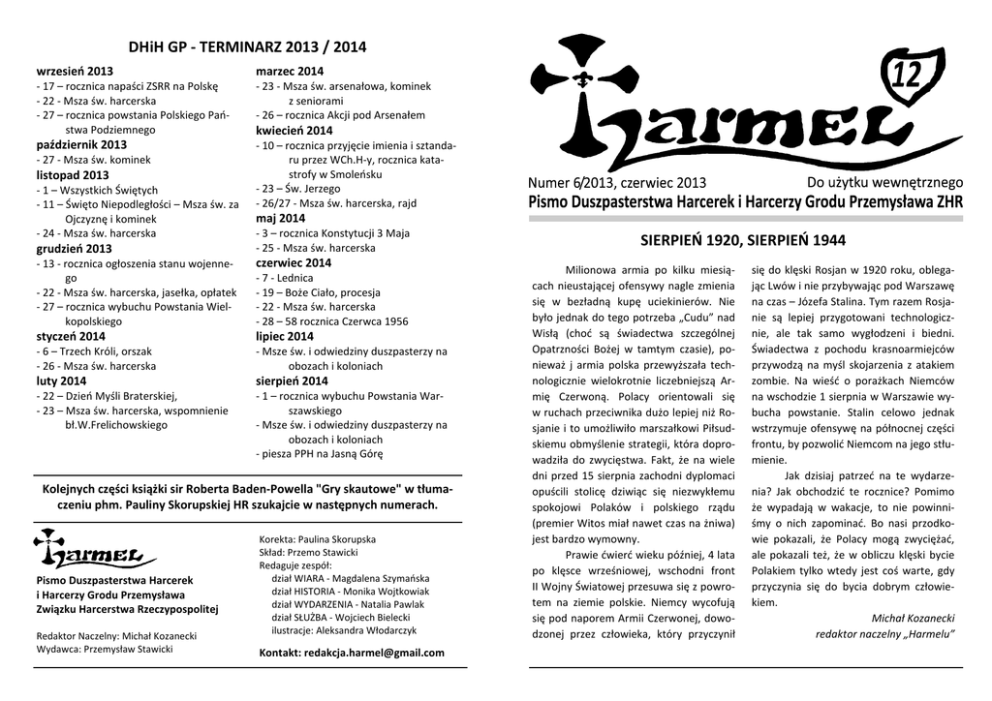 DHiH GP - TERMINARZ 2013 / 2014 wrzesień 2013 marzec 2014 - 17 – rocznica napaści ZSRR na Polskę - 22 - Msza św. harcerska - 27 – rocznica powstania Polskiego Państwa Podziemnego - 23 - Msza św. arsenałowa, kominek z seniorami - 26 – rocznica Akcji pod Arsenałem październik 2013 - 10 – rocznica przyjęcie imienia i sztandaru przez WCh.H-y, rocznica katastrofy w Smoleńsku - 23 – Św. Jerzego - 26/27 - Msza św. harcerska, rajd - 27 - Msza św. kominek listopad 2013 - 1 – Wszystkich Świętych - 11 – Święto Niepodległości – Msza św. za Ojczyznę i kominek - 24 - Msza św. harcerska grudzień 2013 kwiecień 2014 maj 2014 - 3 – rocznica Konstytucji 3 Maja - 25 - Msza św. harcerska - 13 - rocznica ogłoszenia stanu wojennego - 22 - Msza św. harcerska, jasełka, opłatek - 27 – rocznica wybuchu Powstania Wielkopolskiego czerwiec 2014 styczeń 2014 lipiec 2014 - 6 – Trzech Króli, orszak - 26 - Msza św. harcerska - Msze św. i odwiedziny duszpasterzy na obozach i koloniach luty 2014 sierpień 2014 - 22 – Dzień Myśli Braterskiej, - 23 – Msza św. harcerska, wspomnienie bł.W.Frelichowskiego - 1 – rocznica wybuchu Powstania Warszawskiego - Msze św. i odwiedziny duszpasterzy na obozach i koloniach - piesza PPH na Jasną Górę - 7 - Lednica - 19 – Boże Ciało, procesja - 22 - Msza św. harcerska - 28 – 58 rocznica Czerwca 1956 Kolejnych części książki sir Roberta Baden-Powella "Gry skautowe" w tłumaczeniu phm. Pauliny Skorupskiej HR szukajcie w następnych numerach. Pismo Duszpasterstwa Harcerek i Harcerzy Grodu Przemysława Związku Harcerstwa Rzeczypospolitej Redaktor Naczelny: Michał Kozanecki Wydawca: Przemysław Stawicki Korekta: Paulina Skorupska Skład: Przemo Stawicki Redaguje zespół: dział WIARA - Magdalena Szymańska dział HISTORIA - Monika Wojtkowiak dział WYDARZENIA - Natalia Pawlak dział SŁUŻBA - Wojciech Bielecki ilustracje: Aleksandra Włodarczyk Kontakt: [email protected] SIERPIEŃ 1920, SIERPIEŃ 1944 Milionowa armia po kilku miesiącach nieustającej ofensywy nagle zmienia się w bezładną kupę uciekinierów. Nie było jednak do tego potrzeba „Cudu” nad Wisłą (choć są świadectwa szczególnej Opatrzności Bożej w tamtym czasie), ponieważ j armia polska przewyższała technologicznie wielokrotnie liczebniejszą Armię Czerwoną. Polacy orientowali się w ruchach przeciwnika dużo lepiej niż Rosjanie i to umożliwiło marszałkowi Piłsudskiemu obmyślenie strategii, która doprowadziła do zwycięstwa. Fakt, że na wiele dni przed 15 sierpnia zachodni dyplomaci opuścili stolicę dziwiąc się niezwykłemu spokojowi Polaków i polskiego rządu (premier Witos miał nawet czas na żniwa) jest bardzo wymowny. Prawie ćwierć wieku później, 4 lata po klęsce wrześniowej, wschodni front II Wojny Światowej przesuwa się z powrotem na ziemie polskie. Niemcy wycofują się pod naporem Armii Czerwonej, dowodzonej przez człowieka, który przyczynił się do klęski Rosjan w 1920 roku, oblegając Lwów i nie przybywając pod Warszawę na czas – Józefa Stalina. Tym razem Rosjanie są lepiej przygotowani technologicznie, ale tak samo wygłodzeni i biedni. Świadectwa z pochodu krasnoarmiejców przywodzą na myśl skojarzenia z atakiem zombie. Na wieść o porażkach Niemców na wschodzie 1 sierpnia w Warszawie wybucha powstanie. Stalin celowo jednak wstrzymuje ofensywę na północnej części frontu, by pozwolić Niemcom na jego stłumienie. Jak dzisiaj patrzeć na te wydarzenia? Jak obchodzić te rocznice? Pomimo że wypadają w wakacje, to nie powinniśmy o nich zapominać. Bo nasi przodkowie pokazali, że Polacy mogą zwyciężać, ale pokazali też, że w obliczu klęski bycie Polakiem tylko wtedy jest coś warte, gdy przyczynia się do bycia dobrym człowiekiem. Michał Kozanecki redaktor naczelny „Harmelu” SŁOWO DUSZPASTERZA Druhny i Druhowie ! Zbliżamy się do wakacji. Jest to czas wyjazdów na obozy i kolonie. Jest to czas nie tylko spędzania dobrze czasu na łonie przyrody w doborowym towarzystwie, ale też czas rozwinięcia swojej duchowości (w czym mają nam dopomóc przygotowane rozważania na każdy dzień przez Duszpasterstwo Harcerek i Harcerzy Grodu Przemysława). Kilka lat temu w jednym z numerów prestiżowych czasopism harcerskich pojawił się artykuł o duchowości harcerskiej. Czy taka istnieje, czy można mówić o wychowaniu duchowym w harcerstwie, a jeżeli tak, to o jakim wychowaniu należy mówić albo jak je rozumieć? Błędnym jest założenie, iż „wychowanie duchowe jest drogą w nieznane”. Najwięcej do powiedzenia o wychowaniu duchowym mają Ci, którzy nie wierzą, bądź podają się za wierzących niepraktykujących, w harcerstwie zaś określają się oni jako ci, którzy poszukują. Nie ulega wątpliwości, iż wychowanie duchowe należy wiązać z określonym rozwojem wewnątrzosobowościowym. Nie znaczy to, że każdy wybiera sobie to, co najbardziej mu odpowiada – chodzi tu o osobisty kontakt z Bogiem, który dokonuje się w sumieniu człowieka. „Sumienie jest najtajniejszym ośrodkiem i sanktuarium człowieka, gdzie przebywa on sam z Bogiem, którego głos w jego wnętrzu rozbrzmiewa.” Wychowanie duchowe według wielu harcerzy rozumiane jest jako nieustanne dążenie do poszukiwania głębszego zrozumienia i pełniejszego kierowania się w życiu określonym systemem wartości. Miłość, nadzieja, dobro, prawda, wolność, sprawiedliwość, tolerancja i przyjaźń stanowią harcerski system wartości opar- ty na zasadach chrześcijańskich. Powstaje, zatem pytanie, w jaki sposób rozumieć powyższe pojęcia, czy nie są to przypadkiem puste słowa, nic nie znaczące frazesy. Jak realizować w harcerstwie np. miłość czy sprawiedliwość. Według jakiego kryterium postępować. Bardzo często o wychowaniu duchowym w harcerstwie usłyszymy, że jest to życie według cnót. Podsumowując, trzeba powiedzieć, że rozwój duchowy osiąga się wy