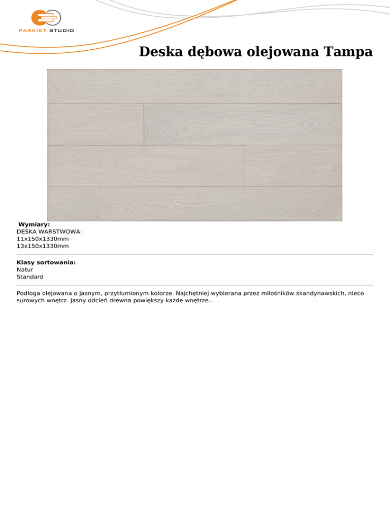 Deska dębowa olejowana Tampa Wymiary: DESKA WARSTWOWA: 11x150x1330mm 13x150x1330mm Klasy sortowania: Natur Standard Podłoga olejowana o jasnym, przytłumionym kolorze. Najchętniej wybierana przez miłośników skandynawskich, nieco surowych wnętrz. Jasny odcień drewna powiększy każde wnętrze..