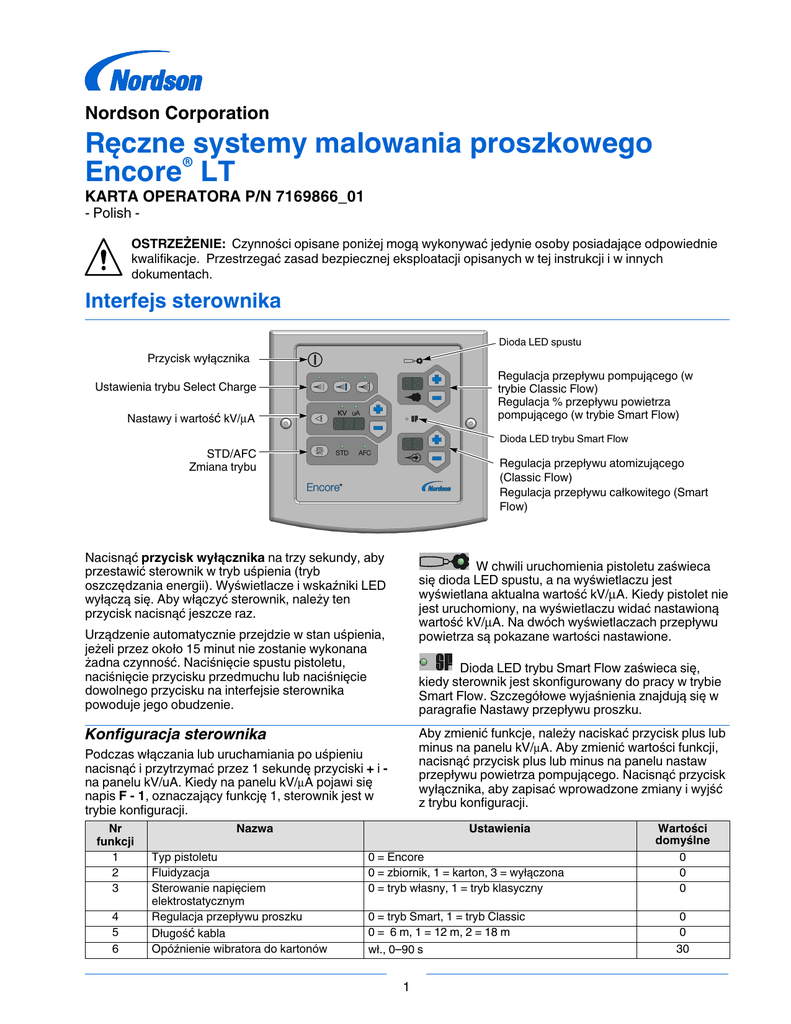 Nordson Corporation Ręczne systemy malowania proszkowego Encorer LT KARTA OPERATORA P/N 7169866_01 - Polish OSTRZEŻENIE: Czynności opisane poniżej mogą wykonywać jedynie osoby posiadające odpowiednie kwalifikacje. Przestrzegać zasad bezpiecznej eksploatacji opisanych w tej instrukcji i w innych dokumentach. Interfejs sterownika Dioda LED spustu Przycisk wyłącznika Regulacja przepływu pompującego (w trybie Classic Flow) Regulacja % przepływu powietrza pompującego (w trybie Smart Flow) Ustawienia trybu Select Charge Nastawy i wartość kV/µA Dioda LED trybu Smart Flow STD/AFC Zmiana trybu Regulacja przepływu atomizującego (Classic Flow) Regulacja przepływu całkowitego (Smart Flow) Nacisnąć przycisk wyłącznika na trzy sekundy, aby przestawić sterownik w tryb uśpienia (tryb oszczędzania energii). Wyświetlacze i wskaźniki LED wyłączą się. Aby włączyć sterownik, należy ten przycisk nacisnąć jeszcze raz. W chwili uruchomienia pistoletu zaświeca się dioda LED spustu, a na wyświetlaczu jest wyświetlana aktualna wartość kV/µA. Kiedy pistolet nie jest uruchomiony, na wyświetlaczu widać nastawioną wartość kV/µA. Na dwóch wyświetlaczach przepływu powietrza są pokazane wartości nastawione. Urządzenie automatycznie przejdzie w stan uśpienia, jeżeli przez około 15 minut nie zostanie wykonana żadna czynność. Naciśnięcie spustu pistoletu, naciśnięcie przycisku przedmuchu lub naciśnięcie dowolnego przycisku na interfejsie sterownika powoduje jego obudzenie. Dioda LED trybu Smart Flow zaświeca się, kiedy sterownik jest skonfigurowany do pracy w trybie Smart Flow. Szczegółowe wyjaśnienia znajdują się w paragrafie Nastawy przepływu proszku. Konfiguracja sterownika Aby zmienić funkcje, należy naciskać przycisk plus lub minus na panelu kV/µA. Aby zmienić wartości funkcji, nacisnąć przycisk plus lub minus na panelu nastaw przepływu powietrza pompującego. Nacisnąć przycisk wyłącznika, aby zapisać wprowadzone zmiany i wyjść z trybu konfiguracji. Podczas włączania lub uruchamiania po uśpieniu nacisnąć i przytrzymać przez 1 sekundę przyciski + i na panelu kV/uA. Kiedy na panelu kV/µA pojawi się napis F - 1, oznaczający funkcję 1, sterownik jest w trybie konfiguracji. Nr funkcji 1 2 3 4 5 6 Nazwa Typ pistoletu Fluidyzacja Sterowanie napięciem elektrostatycznym Regulacja przepływu proszku Długość kabla Opóźnienie wibratora do kartonów Ustawienia 0 = Encore 0 = zbiornik, 1 = karton, 3 = wyłączona 0 = tryb własny, 1 = tryb klasyczny 0 = tryb Smart, 1 = tryb Classic 0 = 6 m, 1 = 12 m, 2 = 18 m wł., 0–90 s 1 Wartości domyślne 0 0 0 0 0 30 Parametry elektryzacji Tryb Select Charger W trybach Select Charge ustawienia elektryzacji nie podlegają regulacji. Diody LED nad przyciskami trybu Select Charge zaświecają się, wskazując wybrany tryb. Re‐Coat Wartości fabryczne parametrów elektryzacji w trybach wyboru ładunku Select Charge są następujące: Re‐Coat (malowanie ponowne): 100 kV, 15 µA Metallics (powierzchnia metalowa): 50 kV, 50 µA Deep Recesses (głębokie wnęki): 100 kV, 60 µA Metallics Recesses UWAGA: Jeżeli zostanie naciśnięty przycisk STD/AFC, kiedy sterownik jest w trybie Select Charge, nastąpi jego przełączenie w tryb STD lub tryb AFC. W trybie Select Charge naciskanie przycisków + i - nie powoduje żadnego skutku. Tryb własny (Custom) elektryzacji Przyciskiem + lub - można wybrać żądaną wartość ustawienia. Im dłużej przycisk jest naciśnięty, tym szybciej zmieniają się wartości. Tryb własny (Custom) jest trybem domyślnym. W tym trybie można niezależnie od siebie zmieniać wartości kV oraz µA. Kiedy jest wybrany ten tryb, świecą się diody STD i AFC. S Prawidłowy przedział wartości STD (kV) wynosi 0 lub 25–100 kV. S Prawidłowy przedział wartości AFC (µA) wynosi można zmieniać informacje na Przyciskiem wyświetlaczu między wartościami kV i uA. 5–100 µA. Tryb klasyczny elektryzacji Nacisnąć przycisk STD/AFC STD lub AFC. Tryb klasyczny (Classic) jest opcjonalnym trybem elektryzacji. Sterownik musi być skonfigurowany do pracy w tym trybie. Zapoznać się z instrukcją obsługi urządzenia. , aby wybrać tryb , aby zmieniać informacje na Nacisnąć przycisk wyświetlaczu między wartościami kV i µA. W trybie klasycznym można dostosować wartość kV (STD) lub µA na wyjściu, ale nie obie te wartości jednocześnie. W trybie AFC można ustawić górną wartość graniczną natężenia prądu. Kiedy natężenie zacznie rosnąć, napięcie kV zmniejszy się. Przyciskiem + lub - można wybrać żądaną wartość ustawienia. Im dłużej przycisk jest naciśnięty, tym szybciej zmieniają się wartości. Poprawne wartości kV i µA są takie same, jak w trybie własnym. Nastawy przepływu proszku Tryb Smart Flow Tryb Smart Flow — domyślny tryb ustawiony fabrycznie. W tym trybie nastawia się wartość przepływu całkowitego i % przepływu powietrza pompującego. Jeśli nastąpi zmniejszenie wartości procentowej przepływu powietrza pompującego, ciśnienie powietrza pompującego zmniejszy się, ale wzrośnie ciśnienie powietrza atomizującego, dzięki czemu prędkość transportowania proszku nie ulegnie zmianie. Dioda LED trybu Smart Flow zaświeca się, kiedy sterownik jest skonfigurowany do pracy w trybie Smart Flow. Dioda LED trybu Smart Flow zaświeca się, kiedy sterownik jest skonfigurowany do pracy w trybie Smart Flow. ustawienia przepływu proszku (% przepływu powietrza pompującego). Tryb Classic Flow — jest to standardowa metoda nastawiania wartości przepływu i prędkości proszku poprzez oddzielne ustawienie przepływu powietrza pompującego i atomizującego oraz ręczne zbilansowanie tych wartości w celu uzyskania optymalnych wyników. Gdy sterownik jest skonfigurowany do pracy w trybie klasycznym Classic Flow, dioda LED trybu Smart Flow jest zgaszona. ustawienia prędkości proszku (Przepływ całkowity). Zakres