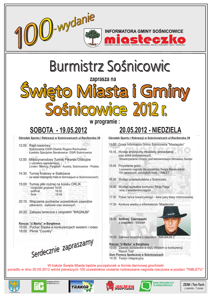 0 10 e i n a d y -w INFORMATORA GMINY SOŒNICOWICE miasteczko BARG£ÓWKA - KOZ£ÓW - £ANY WIELKIE - RACHOWICE - SIERAKOWICE - SMOLNICA - SOŒNICOWICE - TRACHY - TWORÓG MA£Y Burmistrz Soœnicowic zaprasza na Œwiêto Miasta i Gminy Soœnicowice 2012 r. w programie : SOBOTA - 19.05.2012 20.05.2012 - NIEDZIELA Oœrodek Sportu i Rekreacji w Soœnicowicach ul.Raciborska 39 Oœrodek Sportu i Rekreacji w Soœnicowicach ul.Raciborska 39 12:00 Rajd rowerowy: 15:00 Dzieje Informatora Gminy Soœnicowice “Miasteczko” Soœnicowice OSiR-Obelisk Rogera Rachowice£owisko Specjalne Sierakowice- OSiR Soœnicowice 12:00 Miêdzynarodowy Turniej Pi³karski Oldbojów z udzia³em reprezentacji: Linden- Niemcy, Purgstall - Austria, Soœnicowice - Polska 14:30 Turniej fina³owy w Siatkówce (w razie niepogody hala w Gimnazjum w Soœnicowicach) 15:00 Turniej pi³ki no¿nej na boisku ORLIK -rozgrywki grupowe 15:00 -pó³fina³ 19:30 -fina³ 19:45 20:15 Wrêczenie pucharów uczestnikom zawodów pi³karskich, siatkówki oraz skatowych 15:15 Wystêp artystyczny m³odzie¿y gimnazjalnej oraz szkó³ podstawowych. Stowarzyszenie Chopin- pod kierownictwem Miros³awy Sander 15:45 Przywitanie goœci Losowanie nagrody dla uczestnika Œwiêta Miasta wœród 100 pierwszych przyby³ych osób - TABLET 16:00 Wystêp przedszkolaków z Soœnicowic 16:30 Wystêp laureatów konkursu “Moja Pasja” wraz z wrêczeniem nagród 17:00 Pokaz tañca towarzyskiego - dwie pary klasy mistrzowskiej 17:30 Konkurs wiedzy o informatorze “Miasteczko” 20:20 Zabawa taneczna z zespo³em “MAGNUM” Ranczo “U Marka” w Barg³ówce 18:00 Andrzej Cierniewski z zespo³em - koncert 10:00 Puchar Œl¹ska w konkurencjach western i rodeo 18:00 Piknik “Country” y m a z s a r p a z e i n z c e Serd 19:30 Zabawa taneczna z zespo³em “MAGNUM 2” Ranczo “U Marka” w Barg³ówce 10:00 Zawody jeŸdzieckie w stylu Western w konkurencji “Ranch Trail” Dom Pomocy Spo³ecznej w Soœnicowicach 14:30 Festyn integracyjny W trakcie Œwiêta Miasta bêdzie poczêstunek w formie darmowej grochówki ponadto w dniu 20.05.2012 wœród pierwszych 100 uczestników zostanie rozlosowana nagroda rzeczowa w postaci “TABLETU” FABRYKA DRUTU GLIWICE Sp.z o.o. BANK SPÓ£DZIELCZY W SOŒNICOWICACH ZEIM i Ton-Tech J.Jaskolla - T.Joniec Powiat Gliwicki