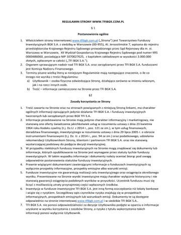 REGULAMIN STRONY WWW.TFIBGK.COM.PL §1 Postanowienia ogólne 1. Właścicielem strony internetowej www.tfibgk.com.pl („Strona”) jest Towarzystwo Funduszy Inwestycyjnych BGK S.A. z siedzibą w Warszawie (00-955), Al. Jerozolimskie 7, wpisana do rejestru przedsiębiorców Krajowego Rejestru Sądowego prowadzonego przez Sąd Rejonowy dla m. st. Warszawy w Warszawie, XII Wydział Gospodarczy Krajowego Rejestru Sądowego pod numer KRS 0000486060, posiadająca NIP 1070027625, z kapitałem zakładowym w wysokości 3.000.000 złotych, opłaconym w całości („TFI BGK S.A.”). 2. Organem sprawującym nadzór nad TFI BGK S.A. oraz zarządzanymi przez TFI BGK S.A. funduszami jest Komisja Nadzoru Finansowego. 3. Terminy pisane wielką literą w niniejszym Regulaminie mają następujące znaczenie, o ile co innego nie wynika z treści Regulaminu: a) Użytkownik – osoba fizyczna odwiedzająca Stronę, działająca zarówno w imieniu własnym, jak i na rzecz innych osób. b) Treść – informacje zamieszczone na Stronie przez TFI BGK S.A. §2 Zasady korzystania ze Strony 1. Treść zawarta na Stronie oraz na stronach powiązanych z niniejszą Stroną linkami, ma charakter ogólnych informacji opisujących jedynie działanie TFI BGK S.A. i funduszy inwestycyjnych tworzonych lub zarządzanych przez BGK TFI S.A. 2. Informacje przedstawione na Stronie mają jedynie charakter informacyjny i marketingowy, nie stanowią one oferty świadczenia jakichkolwiek usług w rozumieniu ustawy z dnia 23 kwietnia 1964 roku Kodeks cywilny (t.j. Dz.U. z 2014 r., poz. 121 ze zm.), w tym usług finansowych, doradztwa finansowego, inwestycyjnego w rozumieniu ustawy z dnia 29 lipca 2005 r. o obrocie instrumentami finansowymi (t.j. Dz. U. z 2014 r., poz. 94 ze zm.) oraz podatkowego, udzielania rekomendacji Użytkownikom Strony, klientom i partnerom TFI BGK S.A. oraz nie stanowią wystarczającej podstawy do podjęcia decyzji inwestycyjnej. 3. W przypadku niektórych funduszy inwestycyjnych na Stronie mogą znajdować się dokumenty lub informacje, których opublikowanie na Stronie jest wymagane przez statuty tychże funduszy inwestycyjnych. W takim wypadku informacje i dokumenty należy oceniać biorąc pod uwagę odpowiednie postanowienia statutów funduszy inwestycyjnych. 4. Prawnie wiążącymi dokumentami zawierającymi informacje o funduszach inwestycyjnych są wyłącznie prospekty informacyjne, prospekty emisyjne albo warunki emisji. 5. Fundusze inwestycyjne nie gwarantują realizacji celu inwestycyjnego oraz osiągnięcia określonego wyniku. Prezentowane na Stronie wyniki inwestycyjne mają charakter wyłącznie historyczny i nie stanowią gwarancji osiągnięcia podobnych wyników w przyszłości. Uczestnik funduszu musi się liczyć z możliwością utraty przynajmniej części wpłaconych środków. 6. Inwestycja w fundusze inwestycyjne TFI BGK S.A. jest inną formą oszczędzania niż lokaty bankowe i wiąże się z ryzykiem. Szczegółowy opis czynników ryzyka znajdują się w prospektach informacyjnych, prospektach emisyjnych lub warunkach emisji. Dokumenty te są dostępne odpowiednio na stronie internetowej www.tfibgk.com.pl i w siedzibie TFI BGK S.A.. 7. TFI BGK S.A. nie ponosi odpowiedzialności za decyzje Użytkownika podjęte w oparciu o informacje uzyskane w wyniku korzystania z zasobów Strony, a ryzyko z tytułu wykorzystania takich informacji ponosi wyłącznie Użytkownik. 8. Użytkownik jest zobowiązany do korzystania ze Strony w sposób zgodny z niniejszym Regulaminem, obowiązującym prawem, przeznaczeniem Strony oraz ogólnymi zasadami korzystania z sieci Internet, w sposób nie naruszający praw innych Użytkowników, osób trzecich oraz TFI BGK S.A.. 9. W przypadku naruszenia §2 ust. 8 przez Użytkownika, TFI BGK S.A. podejmie wszelkie działania zmierzające do naprawienia szkody poniesionej przez TFI BGK S.A. w związku z tym naruszeniem. §3 Odpowiedzialność za Treść 1. TFI BGK S.A. odpowiada jedynie za treści własne zamieszczone na Stronie. 2. Treść zawarta na Stronie została zamieszczona w dobrej wierze, jest na bieżąco aktualizowana oraz sporządzana w sposób staranny. 3. TFI BGK S.A. zastrzega sobie prawo zmiany Treści, jej uzupełniania, skracania lub całkowitej rezygnacji z jej publikacji w części lub w całości. Nie dotyczy to jednakże przedstawionych prospektów informacyjnych, prospektów emisyjnych, warunków emisji oraz statutów funduszy inwestycyjnych. Zmiana treści tych dokumentów może zostać dokonana wyłącznie w sposób określony właściwymi przepisami prawa. Dotyczy to także ogłoszeń przewidzianych postanowieniami statutów funduszy inwestycyjnych. 4. TFI BGK S.A. udziela wiążących informacji, zaleceń lub wyjaśnień wyłącznie w ramach komunikacji indywidualnej z Użytkownikiem telefonicznie lub za pomocą poczty elektronicznej. 5. Strona posiada linki do stron osób trzecich. TFI BGK S.A. nie ponosi żadnej odpowiedzialności za treści umieszczone na tych stronach. Użytkownik decydując się na skorzystanie z linków zamieszczonych na Stronie, aby uzyskać dostęp do stron osób trzecich, czyni to na własną odpowiedzialność. §4 Prawa autorskie 1. Zawartość Strony, w tym jej treść, kształt i konstrukcja chroniona jest prawem autorskim. Prawa do wszystkich materiałów zamieszczonych na stronie zastrzeżone są na rzecz TFI BGK S.A. lub osób uprawnionych. 2. Użytkownik ma prawo do drukowania części lub całości informacji zawartych na Stronie, o ile nie będzie to naruszać praw autorskich lub innych praw TFI BGK S.A.. 3. Naruszenie praw autorskich przez Użytkownika skutkuje odpowiedzialnością określoną w powszechnie obowiązujących przepisach prawa. §5 Zastrzeżenia techniczne 1. TFI BGK S.A. dokłada wszelkich starań w celu zapewnienia prawidłowego funkcjonowania Strony, jednakże nie gwarantuje, że Strona działać będzie bez awarii i przerw. 2. Przy cyfrowym przetwarzaniu danych mogą wystąpić bł