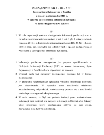 ZARZĄDZENIE NR A – 022 - 7 / 11 Prezesa Sądu Rejonowego w Sokółce z dnia 31 października 2011 r. w sprawie udostępniania informacji publicznej w Sądzie Rejonowym w Sokółce §1 1. W celu organizacji systemu udostępniania informacji publicznej oraz w związku z unormowaniem zawartym w art. 4 ust. 1 pkt 1 ustawy z dnia 6 września 2011 r. o dostępie do informacji publicznej [Dz. U. Nr 112, poz. 1198 z późn. zm.] zarządza się jednolity tryb i sposób postępowania z wnioskami o udostępnienie informacji publicznej. §2 1. Informacja publiczna udostępniana jest poprzez opublikowanie w Biuletynie Informacji Publicznej [BIP] na stronie internetowej Sądu Rejonowego w Sokółce albo w odpowiedzi na wniosek. 2. Wniosek może być zgłoszony telefonicznie, pisemnie lub w formie elektronicznej. 3. W przypadku telefonicznego zgłoszenia wniosku, informacja udzielana jest niezwłocznie. W wypadku braku możliwości udzielenia natychmiastowej odpowiedzi, wnioskodawcę poucza się o możliwości złożenia przez niego wniosku pisemnego. 4. W razie uznania, że Sąd nie posiada żądanej przez wnioskodawcę informacji bądź wniosek nie dotyczy informacji publicznej albo dotyczy takiej informacji, której udostępnienie odbywa się inną drogą, zawiadamia się o tym wnioskodawcę. 1 §3 1. Organem właściwym do udzielania odpowiedzi na wniosek o udostępnienie informacji publicznej oraz do wydawania decyzji o odmowie udzielenia informacji jest Prezes Sądu. 2. Prezes Sądu reprezentuje jednostkę w postępowaniu skargowym prowadzonym w sprawie o udostępnienie informacji publicznej. §4 1. Wpływające do Sądu Rejonowego w Sokółce wnioski o udostępnienie informacji publicznej ewidencjonowane są przez Kierownika Oddziału Administracyjnego lub jego Zastępcę. 2. Wnioski wpływające do Sądu ewidencjonuje się według wzoru, który stanowi załącznik nr 1 do zarządzenia. 3. Udostępnienie informacji publicznej na wniosek następuje bez zbędnej zwłoki, nie później jednak niż w terminie 14 dni od dnia złożenia wniosku. 4. Jeżeli informacja publiczna nie może być udostępniona w terminie określonym w § 4 pkt 4 powiadamia się w tym terminie wnioskodawcę o powodach opóźnienia oraz o terminie, w jakim informacja zostanie udostępniona, nie dłuższym jednak niż 2 miesiące od złożenia wniosku. 5. W przypadku, gdy wniosek dotyczy udostępnienia informacji w zakresie zadań poszczególnych komórek organizacyjnych Sądu lub więcej niż jednej komórki organizacyjnej, Kierownicy tych komórek – na zarządzenie Prezesa Sądu - są zobowiązani do przygotowania odpowiedzi na wniosek o udostępnienie informacji publicznej w zakresie swoich zadań i przekazać ją Prezesowi Sądu – nie później niż w ciągu 7 dni od dnia otrzymania zapytania. 6. Jeżeli kierownik komórki organizacyjnej, do którego zwrócił się Prezes Sądu, nie może udzielić odpowiedzi w terminie 7 dni od otrzymania 2 zapytania, niezwłocznie powiadamia o tym Prezesa Sądu, podając przyczynę opóźnienia i określając termin, w jakim udostępni informację. §5 1. Ustala się wzór wniosku o udostępnienie informacji publicznej, który stanowi załącznik nr 2 do zarządzenia. 2. Wzór wniosku zamieszcza się na stronie internetowej Sądu Rejonowego w Sokółce. 3. Wniosek powinien zawierać dane wnioskodawcy w zakresie wystarczającym do udzielenia odpowiedzi w sposób i w formie wskazanych we wniosku. 4. Jeżeli we wniosku nie zostały wskazane wprost sposób i forma udostępnienia informacji, odpowiedzi udziela się w sposób i w formie, na których wybór pozwala zakres danych wnioskodawcy dostępnych we wniosku, przy czym w pierwszej kolejności należy wybrać sposób i formę powodujące jak najmniejsze koszty i jak najkrótszy czas dotarcia odpowiedzi do wnioskodawcy. §6 1. Decyzje o odmowie udostępnienia informacji publicznej lub o umorzeniu postępowania o udostępnienie informacji publicznej w trybie art. 14 pkt 2 ustawy o dostępie do informacji publicznej wydaje Prezes Sądu. 2. Jeżeli udostępnienie informacji publicznej stwarza konieczność przekształcenia informacji w formę wskazaną we wniosku, w szczególności zapisania żądanych informacji na nośniku elektronicznym, wykonania kserokopii lub wydruku, co wiąże się z poniesieniem dodatkowych kosztów, Kierownik Oddziału Administracyjnego oblicza koszt przygotowania informacji i powiadamia o nim Prezesa Sądu. Jeżeli całkowity koszt realizacji wniosku przekracza 10 zł, Prezes Sądu wydaje 3 postanowienie o koszcie udostępnienia informacji, które podlega doręczeniu wnioskodawcy. 3. Jeżeli istnieje możliwość udostępnienia informacji bezpłatnie lub za pobraniem opłaty w niższej wysokości, lecz w innej formie, niż wskazano we wniosku, w uzasadnieniu postanowienia informuje się wnioskodawcę o tej możliwości. 4. Jeżeli w terminie 14 dni od dnia otrzymania postanowienia o koszcie udostępnienia informacji wnioskodawca zrezygnuje ze wskazanego we wniosku sposobu i formy udostępnienia informacji oraz wybierze inny sposób i formę udostępnienia, nie powodujące kosztów, informacja jest udostępniana w ten sposób i w tej formie. 5. Kwotę ustaloną w treści postanowienia, o którym mowa w pkt. 2, wnioskodawca niezwłocznie wpłaca w kasie sądu albo przekazuje na rachunek bankowy sądu. 6. Opłata, o której mowa wyżej dotyczy informacji zapisanych w formie elektronicznej na dysku CD, sporządzanych kopii dokumentów lub wydruków komputerowych, których objętość przekracza 15 stron. 7. Ustala się wysokość opłat w następującej kwocie: a) Za sporządzenie kopii dokumentu lub wydruku komputerowego – 1.00 zł za stronę, b) Za zapis informacji na dysku CD – 3.00 zł za sztukę. §7 Zarządzenie wchodzi w życie z dniem 02 listopada 2011 r. Prezes Sądu Rejonowego w Sokółce Dariusz Gąsowski 4
