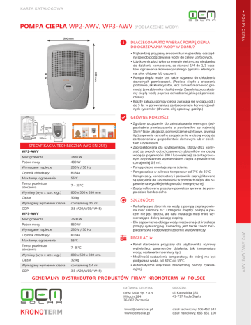 KARTA KATALOGOWA 500 mm (PODŁĄCZENIE WODY) DLACZEGO WARTO WYBRAĆ POMPĘ CIEPŁA DO OGRZEWANIA WODY W DOMU? POMPY CIEPŁA POMPA CIEPŁA WP2-AWV, WP3-AWV 800 mm •Najbardziej przyjazny środowisku i najbardziej oszczędny sposób podgrzewania wody do celów użytkowych. •Użytkownik płaci tylko za energię elektryczną niezbędną do działania kompresora, co stanowi 1/4 do 1/3 kosztów ogrzewania konwencjonalnego (grzałka elektryczna, piec olejowy lub gazowy). •Pompa ciepła może być także używana do chłodzenia dowolnych pomieszczeń. (Pobiera ciepło z otoczenia podobnie jak klimatyzator, lecz zamiast marnować gromadzi je w zbiorniku ciepłej wody. Zasadniczo uzyskujemy ciepłą wodę poprzez ochładzanie jakiegoś pomieszczenia). •Koszty zakupu pompy ciepła zwracają się w ciągu od 3 do 5 lat w porównaniu z zastosowaniem konwencjonalnych systemów (drewno, olej opałowy, gaz itp.) GŁÓWNE KORZYŚCI: SPECYFIKACJA TECHNICZNA (WG EN 255) WP2-AWV Moc grzewcza 1830 W Pobór mocy 480 W Wymagane napięcie 230 V / 50 Hz Czynnik chłodzący R134a Max temp. ogrzewania 55°C Temp. powietrza otoczenia 7 – 35°C Wymiary (wys. x szer. x gł.) 800 x 500 x 330 mm Ciężar 30 kg Wymagany wymiennik ciepła co najmniej 0,9 m² COP 3,8 (A20/W15/-W45) WP3-AWV 2600 W Pobór mocy 860 W Wymagane napięcie 230 V / 50 Hz Czynnik chłodzący R134a Max temp. ogrzewania 55°C Temp. powietrza otoczenia 7–35°C Wymiary (wys. x szer. x gł.) 880 x 500 x 330 mm Ciężar 32 kg Wymagany wymiennik ciepła co najmniej 1,4 m² COP 3,5 (A20/W15/-W45) SZCZEGÓŁY: •Rurka łącząca zbiornik na wodę z pompą ciepła powinna mieć średnicę ¾”. Odległość między pompą a piecem nie jest istotna, ale cała instalacja musi mieć wystarczająco dobrą izolację cieplną. •Dla zapewnienia obiegu wody niezbędna jest instalacja pompy cyrkulacyjnej. Konieczny jest także zawór bezpieczeństwa i odpowiedni zbiornik wyrównawczy. REGULACJA: •Panel sterowania przyjazny dla użytkownika (cyfrowy wyświetlacz parametrów działania, jak temperatura wody, nastawa temperatury itp.) •Możliwość nastawienia temperatury, do której ma być podgrzana woda, od 30°C do 55°C. •Automatyczne włączanie zewnętrznej pompy cyrkulacyjnej. GENERALNY DYSTRYBUTOR PRODUKTÓW FIRMY KRONOTERM W POLSCE GŁÓWNA SIEDZIBA ODDZIAŁ OEM Solar Sp. z o.o. Miłocin 284 36-062 Zaczernie ul. Katowicka 151 41-717 Ruda Śląska [email protected] www.oemsolar.pl dział techniczny: 506 452 543 dział handlowy: 665 651 100 WP2-AWV, WP3-AWV Moc grzewcza •Zgrabne urządzenie do zainstalowania wewnątrz (odpowiednie pomieszczenie o powierzchni co najmniej 15 m² takie jak garaż, pomieszczenie użytkowe, piwnica itp.) zapewnia centralne zaopatrzenie w ciepłą wodę do zastosowania w gospodarstwie domowym lub w obiektach użytkowych. •Zaprojektowana dla użytkowników, którzy chcą korzystać ze swoich dotychczasowych zbiorników na ciepłą wodę (o pojemności 200 l lub większej) ze zintegrowanym odpowiednim wymiennikiem ciepła o powierzchni co najmniej 0,9 m². •Pompę ciepła montuje się na ścianie. •Pompa działa w zakresie temperatur od 7°C do 35°C. •Kompresory, kondensatory i parowniki zaprojektowane są specjalnie do zastosowania w pompach ciepła dla zapewnienia wysokiej efektywności energetycznej. •Zoptymalizowany przepływ powietrza sprawia, że pompa działa bardzo cicho.