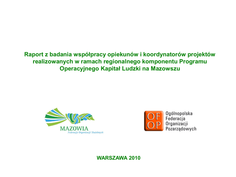 Raport z badania współpracy opiekunów i koordynatorów projektów realizowanych w ramach regionalnego komponentu Programu Operacyjnego Kapitał Ludzki na Mazowszu WARSZAWA 2010 Szanowni Państwo! Prezentujemy Państwu raport z badania przeprowadzonego przez Federację Organizacji Służebnych MAZOWIA we współpracy z Ogólnopolską Federacją Organizacji Pozarządowych (OFOP). Raport stanowi element działań ww. Federacji na rzecz dialogu między sektorem publicznym a partnerami społecznymi w obszarze wydatkowania funduszy unijnych. Impulsem do przeprowadzenia badania były napływające ze środowiska trzeciego sektora informacje o problemach we współpracy z Mazowiecką Jednostką Wdrażania Programów Unijnych (MJWPU) w zakresie przyznawania i rozliczania dotacji – opóźnieniach w przekazywaniu środków, przedłużających się terminach podpisywania umów, niejednoznaczne formułowanych wytycznych dotyczących rozliczeń. MJWPU powstała w lipcu 2007 roku i przejęła działania dotychczas realizowane przez Urząd Marszałkowski Województwa Mazowieckiego oraz Wojewódzki Urząd Pracy w Warszawie. MJWPU realizuje zadania wynikające z zapisów Regionalnego Programu Operacyjnego Województwa Mazowieckiego oraz komponentu regionalnego Programu Operacyjnego Kapitał Ludzki w latach 2007-2013. Federacja MAZOWIA od 2007 toku z uwagą obserwuje przygotowania samorządowych władz Mazowsza do przyjęcia i dystrybucji środków europejskich. Od samego początku otrzymywaliśmy sygnały, że istnieją trudności we współpracy z MJWPU. Jako regionalna organizacja rzecznicza i członek OFOP, korzystając z doświadczeń Dolnośląskiej Federacji Organizacji Pozarządowych postanowiliśmy wzmocnić głos organizacji pozarządowych borykających się z problemami w relacji z MJWPU. Chcieliśmy pokazać naszym członkom, że w trudnych sytuacjach mają wsparcie organizacji federacyjnych - organizacje zgłaszały się do nas bowiem, gdy wszystko inne zawodziło. Rozpoczęliśmy cykl spotkań i dyskusji ze wszystkimi zainteresowanymi pozyskiwaniem środków unijnych za pośrednictwem MJWPU na Mazowszu. Jak się wkrótce okazało trudności i problemy dotyczyły wszystkich sektorów, nie tylko organizacji pozarządowych. Doszliśmy zatem do wniosku, że należy podjąć działania skierowane zarówno do przedsiębiorców z Mazowsza, samorządów i organizacji pozarządowych pozyskujących unijne dotacje, stworzyć forum do dyskusji i zaprosić do rozmowy władze województwa. 2 W efekcie w 2009 roku przeprowadziliśmy pierwsze badanie ankietowe wśród instytucji, które realizowały bądź planowały realizować projekty finansowane z funduszy europejskich dostępnych na Mazowszu w okresie 20072013. Powstał raport, którego treść była dyskutowana na spotkaniach mazowieckich projektodawców jesienią 2009 i zimą 2010 roku. Obecnie prezentujemy drugi raport, który, mamy nadzieję, będzie przedmiotem dyskusji na kolejnym spotkaniu projektodawców z udziałem przedstawicieli samorządu Mazowsza. Naszym celem jest poprawa systemu przyznawania i rozliczania dotacji unijnych na Mazowszu. Chcemy by naszym partnerem w poszukiwaniu jak najlepszych rozwiązań był samorząd województwa mazowieckiego. Niniejszy raport ma służyć dialogowi i konstruktywnej debacie. Chcielibyśmy uspołecznić proces dystrybucji środków unijnych, tak by projektodawcy czuli się traktowani podmiotowo, nie zaś jak petenci, co niestety wskazywali w naszych badaniach wielokrotnie jako problem w relacji z MJWPU. Życzymy ciekawej lektury mając nadzieję, że nasze działanie przyczyni się do wdrażania przez samorząd województwa mazowieckiego jak najkorzystniejszych dla projektodawców rozwiązań. Zapraszamy do dyskusji na kolejnym spotkaniu mazowieckich projektodawców! Zespół Federacji MAZOWIA i OFOP. 3 Spis treści WSTĘP GŁÓWNE ZAŁOŻENIA BADAWCZE I METODOLOGIA BADANIA WYNIKI BADANIA ROLE UCZESTNIKÓW PROCESU WDRAŻANIA WDRAŻANIE PROJEKTÓW WIZERUNKI IDEALNE KOMUNIKACJA Z MJWPU WZAJEMNE OCZEKIWANIA REKOMENDACJE ANEKS A – ZESPÓŁ BADAWCZY ANEKS B – DYSPOZYCJE DO WYWIADÓW 1 5 11 11 16 30 34 37 41 47 48 4 GŁÓWNE ZAŁOŻENIA BADAWCZE I METODOLOGIA BADANIA 5 Główne założenia badania Koncepcja badania, którego wyniki prezentujemy w raporcie, powstawała na przełomie lutego i marca 2010 r. Dysponując poprzednim raportem (Sieczkowski, P. i inni Raport z badania ......., Warszawa 2009 – dalej: Sieczkowski 2009) i wnioskami z dyskusji nad nim prowadzonych na I i II Spotkaniu Mazowieckich Projektodawców (dalej: SMP), chcieliśmy rozszerzyć formułę debaty. Dotychczas koncentrowaliśmy się na diagnozowaniu obszarów problemowych oraz próbie doraźnego wyjaśniania trudnych zagadnień. W badaniu ankietowym pytaliśmy o zdanie jedynie projektodawców – najczęściej koordynatorów projektów lub osoby odpowiedzialne za zarządzanie firmą bądź organizacją pozarządową. Wnioski z tamtego badania komentowali zaś przedstawiciele Mazowieckiej Jednostki Wdrażania Projektów Europejskich (dalej: MJWPU) i Urzędu Marszałkowskiego Województwa Mazowieckiego (dalej: UM WM). W każdym z trzech bloków zagadnień badanych uprzednio (były to: współpraca na poziomie merytorycznym, komunikacji oraz dostęp informacji, finanse i rozliczenie projektów) pojawiały się zagadnienia związane z bezpośrednią współpracą pomiędzy koordynatorami i opiekunami projektów. Uznaliśmy, że jest to sfera, na którą możemy mieć realny wpływ i jednocześnie jest szansa by rzucić na nią nowe światło. To właśnie współpraca osób bezpośrednio zaangażowanych w codzienny trud rozliczania wniosków i podejmowania mnóstwa, z pozoru drobnych decyzji, naszym zdaniem ma kluczowe znaczenie dla powodzenia wielkiego projektu z jakim wiąże się wykorzystywanie funduszy unijnych. Ponadto to, to co dzieję się pomiędzy opiekunami oraz koordynatorami projektów były traktowane przez nas, jako 