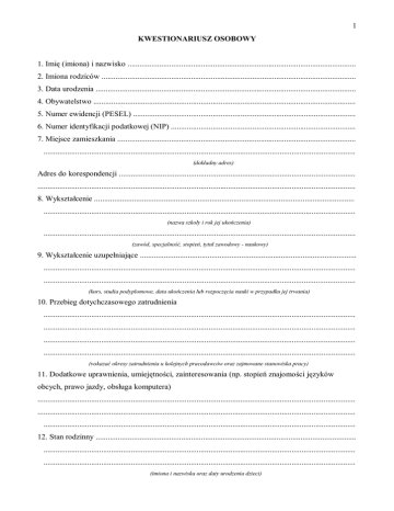 1 KWESTIONARIUSZ OSOBOWY 1. Imię (imiona) i nazwisko ................................................................................................................... 2. Imiona rodziców ................................................................................................................................ 3. Data urodzenia ................................................................................................................................... 4. Obywatelstwo .................................................................................................................................... 5. Numer ewidencji (PESEL) ................................................................................................................ 6. Numer identyfikacji podatkowej (NIP) ............................................................................................. 7. Miejsce zamieszkania ........................................................................................................................ ............................................................................................................................................................. (dokładny adres) Adres do korespondencji ....................................................................................................................... ................................................................................................................................................................ 8. Wykształcenie ................................................................................................................................... ............................................................................................................................................................. (nazwa szkoły i rok jej ukończenia) ............................................................................................................................................................. (zawód, specjalność, stopień, tytuł zawodowy - naukowy) 9. Wykształcenie uzupełniające ............................................................................................................. ............................................................................................................................................................. ............................................................................................................................................................. (kurs, studia podyplomowe, data ukończenia lub rozpoczęcia nauki w przypadku jej trwania) 10. Przebieg dotychczasowego zatrudnienia ............................................................................................................................................................. ............................................................................................................................................................. ............................................................................................................................................................. ............................................................................................................................................................. (wskazać okresy zatrudnienia u kolejnych pracodawców oraz zajmowane stanowiska pracy) 11. Dodatkowe uprawnienia, umiejętności, zainteresowania (np. stopień znajomości języków obcych, prawo jazdy, obsługa komputera) ................................................................................................................................................................ ................................................................................................................................................................ ............................................................................................................................................................. 12. Stan rodzinny ................................................................................................................................... ............................................................................................................................................................. ............................................................................................................................................................. (imiona i nazwiska oraz daty urodzenia dzieci) 2 13. Powszechny obowiązek obrony: a) stosunek do powszechnego obowiązku obrony ............................................................................ ........................................................................................................................................................ b) stopień wojskowy ......................................................................................................................... numer specjalności wojskowej ...................................................................................................... c) przynależność ewidencyjna do WKU ........................................................................................... ........................................................................................................................................................ d) numer książeczki wojskowej ........................................................................................................ e) przydział mobilizacyjny do sił zbrojnych RP ............................................................................... ........................................................................................................................................................ 14. Osoba, którą należy zawiadomić w razie wypadku: ...................................................................... ........................................................
