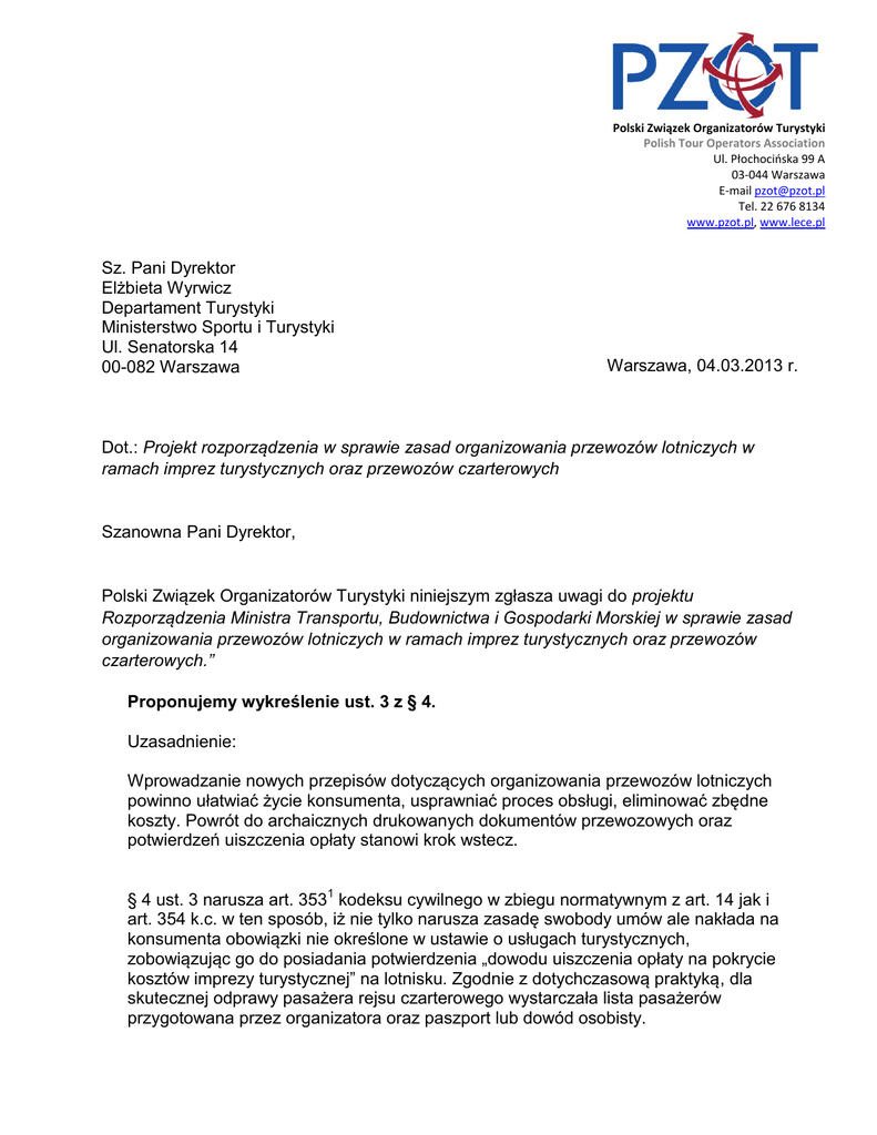 Polski Związek Organizatorów Turystyki Polish Tour Operators Association Ul. Płochocińska 99 A 03-044 Warszawa E-mail [email protected] Tel. 22 676 8134 www.pzot.pl, www.lece.pl Sz. Pani Dyrektor Elżbieta Wyrwicz Departament Turystyki Ministerstwo Sportu i Turystyki Ul. Senatorska 14 00-082 Warszawa Warszawa, 04.03.2013 r. Dot.: Projekt rozporządzenia w sprawie zasad organizowania przewozów lotniczych w ramach imprez turystycznych oraz przewozów czarterowych Szanowna Pani Dyrektor, Polski Związek Organizatorów Turystyki niniejszym zgłasza uwagi do projektu Rozporządzenia Ministra Transportu, Budownictwa i Gospodarki Morskiej w sprawie zasad organizowania przewozów lotniczych w ramach imprez turystycznych oraz przewozów czarterowych.” Proponujemy wykreślenie ust. 3 z § 4. Uzasadnienie: Wprowadzanie nowych przepisów dotyczących organizowania przewozów lotniczych powinno ułatwiać życie konsumenta, usprawniać proces obsługi, eliminować zbędne koszty. Powrót do archaicznych drukowanych dokumentów przewozowych oraz potwierdzeń uiszczenia opłaty stanowi krok wstecz. § 4 ust. 3 narusza art. 3531 kodeksu cywilnego w zbiegu normatywnym z art. 14 jak i art. 354 k.c. w ten sposób, iż nie tylko narusza zasadę swobody umów ale nakłada na konsumenta obowiązki nie określone w ustawie o usługach turystycznych, zobowiązując go do posiadania potwierdzenia „dowodu uiszczenia opłaty na pokrycie kosztów imprezy turystycznej” na lotnisku. Zgodnie z dotychczasową praktyką, dla skutecznej odprawy pasażera rejsu czarterowego wystarczała lista pasażerów przygotowana przez organizatora oraz paszport lub dowód osobisty. Wprowadzenie dodatkowego warunku w postaci posiadania dokumentów przewozowych oraz potwierdzenia zapłaty może być uznane za dyskryminację pasażerów połączeń czarterowych w porównaniu do pasażerów połączeń regularnych, przy odprawie których nie są wymagane ani bilety lotnicze ani dowody zapłaty. W/w zapisy spowodują wydłużenie czasu odprawy biletowej, uniemożliwiając w praktyce stosowanie uproszczonej odprawy elektronicznej - tak jak w liniach regularnych. Ze względu na powyższe proponowane rozporządzenie jest niezgodne z Decyzją Rady i Parlamentu Europejskiego z dnia 7 lipca 2010 roku Unijne wytyczne dotyczące rozwoju transeuropejskiej sieci transportowej Dz.UrzUEL.2010.204.1, skoro wprowadza dodatkowe obowiązki dla konsumenta. Zamiast zapewniać rozwój połączeń lotniczych, może skutecznie ograniczyć tę formę transportu. . Z poważaniem, 2