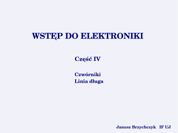 WSTĘP DO ELEKTRONIKI Część IV Czwórniki Linia długa Janusz Brzychczyk IF UJ Czwórniki Czwórnik (dwuwrotnik) posiada cztery zaciski elektryczne. Dwa z tych zacisków uważamy za wejście czwórnika, a pozostałe dwa za wyjście. sygnał wejściowy (wymuszenie) u (t) 1 u2(t) czwórnik wejście sygnał wyjściowy (odpowiedź) wyjście Sprzężenie wyjścia z wejściem opisywane jest przez funkcję (operator) przejścia, zwany też transmisją układu lub transmitancją: u2 odpowiedź T= = wymuszenie u1 Rodzaje czwórników liniowe – nieliniowe bierne (pasywne) – aktywne Przykłady czwórników: u1(t) wzmacniacz u2(t) = K u1(t) K – wzmocnienie układu u1(t) prostownik u1(t) u2(t) = |u1(t)| u2(t) filtr Czwórniki liniowe u2(t) u1(t) j t 1 Dla fali sinusoidalnej funkcja przejścia ma postać u 1 t = U 1 e Odpowiedź: T =∣T∣ e j j t1 j t1 j t 2 j u 2 t = T u 1 t =∣T∣ e U 1 e =∣T∣ U 1 e =U 2 e Amplituda sygnału wyjściowego: U 2 =∣T∣ U 1 Przesunięcie fazy: 2−1 = W ogólnym przypadku funkcja przejścia zależy od częstości sygnału . T = T Funkcję określającą zależność od częstości nazywamy charakterystyką ∣T∣ amplitudową. Funkcję określającą zależność od częstości nazywamy charakterystyką fazową. Czwórnik liniowy – filtr sygnałów elektronicznych Jeżeli sygnał wejściowy jest superpozycją fal sinusoidalnych o amplitudach ak a a1 i częstościach k u 1 t = ∑ a k e a2 a3 j k tk k to dla ∣T ∣ T = ∣T ∣ e j napięcie wyjściowe wynosi: u 2 t = ∑ T k a ke j k t k ∣T∣ a k = ∑ ∣T k ∣ a k e k j k t k k Rodzaje filtrów ∣T∣ Filtr dolnoprzepustowy Filtr środkowoprzepustowy Filtr górnoprzepustowy Filtr środkowozaporowy Czwórniki liniowe bierne Czwórniki te zbudowane są z elementów R, L, C. Rozważamy czwórniki zawierające impedancje Z1 oraz Z2 , połączone według nastepującego schematu: Dla sygnałów sinusoidalnych: i(t) u 1 t = U 1 e Z1 u1 (t) Z2 u2 (t) j t 1 u 2 t = Z 2 i t = Z 2 u 2 t = T u 1 t Czwórnik ten nazywany jest filtrem typu lub też uogólnionym dzielnikiem napięcia. T = Z2 Z1 Z 2 u 1 t Z 1 Z2 Czwórnik R R (dzielnik napięcia) Dla sygnałów o dowolnych przebiegach czasowych: i(t) R1 u1 (t) R2 u2 (t) u2 t = R2 i t = R2 Z 1 = R1 = const Z 2 = R2 = const T= R2 R1R2 u1 t R1R2 = R2 R1R2 u1 t Czwórnik C R – filtr górnoprzepustowy – układ różniczkujący i(t) u1 (t) C u2 (t) R 1 jC Z2 = R Z1 = Z2 0 R j RC T = = = = Z 1Z 2 1 1 j RC 1 j R 0 jC j gdzie: 0 = 1 1 = RC = RC (stała czasowa) Czwórnik C R – charakterystyka amplitudowa 0 T = 1 j 0 j C u1 (t) R u2 (t) ∣T ∣ = ∣T ∣ 1 0.71 1 0 0 2 1 2 0 Czwórnik C R – charakterystyka fazowa C u1 (t) R u2 (t) 2 j j 0 0 0 T = = 2 1 j 1 0 0 0 Im T = arctg = arctg Re T 2 4 1 0 Czwórnik CR : Przechodzenie sygnałów o dowolnym kształcie i(t) u1 (t) Q – ładunek na okładce kondensatora C u1 t = u2 (t) R Q t u2 t C różniczkując względem czasu oraz uwzględniając, że du1 t dt i t du2 t = C dt du1 t dt = u2 t RC u2 t , ponieważ otrzymujemy: i t = R du2 t dt dQ t = i t dt Rozwiązując to równanie różniczkowe znajdujemy odpowiedź u2(t) na zadany sygnał wejściowy u1(t). Dla małych stałych czasowych RC, przy powolnych zmianach napięcia w czasie: du1 t dt ≃ u2 t RC czyli u2 t ≃ du1 t dt Napięcie wyjściowe śledzi zróżniczkowany sygnał wejściowy. Dlatego nazwa: układ różniczkujący Układ różniczkujący : Przechodzenie impulsów prostokątnych u1 t = 0 dla u1 t = U du1 t dt U t t0 i tt p dla tp 0tt p u2 t du2 t = , dt sygnał wejściowy u1 (t) U = RC u2 (t) sygnał wyjściowy gdy = 0.1t p Poza punktami t = 0 oraz t = tp : du1 t dt u2 t du2 t 0= dt =0 u2 t = − = tp du2 t dt Rozwiązując to równanie z uwzględnieniem warunków początkowych otrzymujemy: −t/ u2 t = U e dla t / −t/ u2 t = U 1− e e p 0 t tp dla ttp = 10t p Czwórnik R C – filtr dolnoprzepustowy – układ całkujący i(t) Z1 = R R C u1 (t) u2 (t) Z2 = 1 j C 1 Z2 j C 1 1 T = = = = Z1Z 2 1 1 j RC 1 j R 0 j C gdzie: 0 = 1 1 = RC = RC (stała czasowa) Czwórnik R C – charakterystyka amplitudowa u1 (t) skala liniowa ∣T∣ R C u2 (t) 1 0.71 T = 1 0 1 j 0 0 1 ∣T∣ ∣T ∣ = 1 0 2 0.1 0 ∣T∣ ≃ 0.01 0.01 0 skala log – log 1 1 2 0.1 1 10 100 0 Czwórnik R C – charakterystyka fazowa u1 (t) R C u2 (t) 0 T = 1 1 j 0 1− j = 0 1 0 4 − 2 2 = arctg − Im T = −arctg 0 Re T 1 2 0 Czwórnik R C : Przechodzenie sygnałów o dowolnym kształcie i(t) Q – ładunek na okładce kondensatora R C u1 (t) u2 (t) u1 t = Ri t u2 t du2 t dQ t uwzględniając, że otrzymujemy: i t = =C dt dt u1 t = RC ∣ du2 t dt u2 t = du2 t dt u2 t du2 t ∣ Gdy (duża częstotliwość, duża stała czasowa) wówczas: ≫∣u2 t ∣ u1 t ≃ dt du2 t dt t czyli 1 u2 t ≃ ∫ u1 t' dt' t 0 Napięcie wyjściowe śledzi scałkowany sygnał wejściowy. Dlatego nazwa: układ całkujący u1 (t) sygnał wejściowy U Układ całkujący : Przechodzenie impulsów prostokątnych u1 t = 0 t0 i tt p dla u1 t = U dla 0tt p u1 t = dt u2 t , −t/ u2 t = U e t p / −t/ −1 e = 0.1t p = RC Rozwiązując to równanie z uwzględnieniem warunków początkowych otrzymujemy: u2 t = U 1−e t sygnał wyjściowy gdy: U du2 t u2 (t) tp dla 0t tp dla ttp t tp U U = tp = 10t p Czwórnik Wiena – filtr środkowoprzepustowy – układ różniczkującocałkujący R1 i(t) C1 u1 (t) Z1 = R1 Z2 = R2 C2 1 j C 1 1 1 jC 2 R2 T = u2 (t) Z2 Z 1Z 2 = Czwórnik Wiena – filtr środkowoprzepustowy – układ różniczkującocałkujący Symetryczny czwórnik Wiena R i(t) Z 1 = R C u1 (t) R T = Z2 Z 1 Z 2 = 1 Z1 ∣T ∣ = T T = = 1 1 0 9 − 0 2 1 1 = j C Z2 R C Z2 u2 (t) 1 0 3 j − 0 1 j C = 0 3− j − 0 0 9 − 0 2 [ Im T 1 0 = arctg = arctg − 0 Re T 3 ] Symetryczny czwórnik Wiena – charakterystyka częstotliwościowa Charakterystyka amplitudowa 1 ∣T∣ ⅓ ∣T ∣ = 0.1 1 0 9 − 0 2 0.01 0.001 Charakterystyka fazowa [ 1 0 = arctg − 0 3 2 ] 0 − 2 0.01 0.1 1 10 100 1000 0 0.01 0