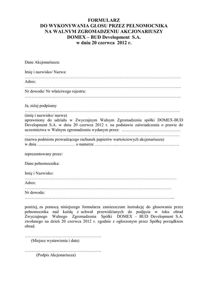 FORMULARZ DO WYKONYWANIA GŁOSU PRZEZ PEŁNOMOCNIKA NA WALNYM ZGROMADZENIU AKCJONARIUSZY DOMEX – BUD Development S.A. w dniu 20 czerwca 2012 r. Dane Akcjonariusza: Imię i nazwisko/ Nazwa: ………………………………………………………………………………………….……… Adres: …………………………………………………………………………………………………. Nr dowodu/ Nr właściwego rejestru: …………………………………………………………………………………………….…… Ja, niżej podpisany ………………………………………………………………………………………………… (imię i nazwisko/ nazwa) uprawniony do udziału w Zwyczajnym Walnym Zgromadzeniu spółki DOMEX-BUD Development S.A. w dniu 20 czerwca 2012 r. na podstawie zaświadczenia o prawie do uczestnictwa w Walnym zgromadzeniu wydanym przez: …………………………………… ………………………………………………………………………………………………… (nazwa podmiotu prowadzącego rachunek papierów wartościowych akcjonariusza) w dniu ……………………… o numerze ……….…………………………………………… reprezentowany przez: Dane pełnomocnika: Imię i Nazwisko: ………………………………………………….…………………………………………… Adres: …………………………………………………………………………………………… Nr dowodu: ……………………………………………………………………………………………... poniżej, za pomocą niniejszego formularza zamieszczam instrukcję do głosowania przez pełnomocnika nad każdą z uchwał przewidzianych do podjęcia w toku obrad Zwyczajnego Walnego Zgromadzenia Spółki DOMEX – BUD Development S.A. zwołanego na dzień 20 czerwca 2012 r. zgodnie z ogłoszonym przez Spółkę porządkiem obrad. ………………………………………………. (Miejsce wystawienia i data) ………………………………………………. (Podpis Akcjonariusza) ZASTRZEŻENIA: 1) Niniejszy formularz nie służy do weryfikacji sposobu głosowania dokonywanego przez pełnomocnika w imieniu akcjonariusza. 2) Niniejszy formularz nie zastępuje pełnomocnictwa udzielonego pełnomocnikowi przez akcjonariusza. 4) Korzystanie z formularza udostępnionego przez Spółkę nie jest dla akcjonariusza obligatoryjne i nie jest warunkiem oddania głosu przez pełnomocnika obecnego na Walnym Zgromadzeniu. 5) Możliwość skorzystania z formularza jest prawem, a nie obowiązkiem akcjonariusza. 6) Od decyzji akcjonariusza zależy w jaki sposób jego pełnomocnik będzie wykonywał prawo głosu. INSTRUKCJA GŁOSOWANIA PEŁNOMOCNIKA na Zwyczajnym Walnym Zgromadzeniu Spółki DOMEX – BUD Development S.A., które odbędzie się w dniu 20.06.2012 r. Punkt porządku obrad Uchwała 1 Wybór Przewodniczącego ZWZ: ………………… Przyjęcie porządku obrad Rozpatrzenie i zatwierdzenie sprawozdania Zarządu z działalności Spółki za 2011 rok. 3 4 5 Rozpatrzenie i zatwierdzenie sprawozdania finansowego Spółki za 2011 rok. 6 Podjęcie uchwały w sprawie udzielenia absolutorium Prezesowi Zarządu – Tomaszowi Kowalskiemu - z wykonania obowiązków w 2011 r. Podjęcie uchwały w sprawie udzielenia absolutorium Przewodniczącemu Rady Nadzorczej – Ryszardowi Leszkowi Wenglorzowi - z wykonania obowiązków w 2011 r. Podjęcie uchwały w sprawie udzielenia absolutorium Członkowi Rady Nadzorczej – Bogusławie Kasprzak z wykonania obowiązków w 2011 r. 7 7 Głosuję za Głosuję przeciw Wstrzymuję się od głosu Żądanie zaprotokołowania sprzeciwu do uchwały Inne Punkt porządku obrad Uchwała 7 Podjęcie uchwały w sprawie udzielenia absolutorium Członkowi Rady Nadzorczej – Tomaszowi Magieraz wykonania obowiązków w 2011 r. Podjęcie uchwały w sprawie udzielenia absolutorium Członkowi Rady Nadzorczej – Mirosławowi Durkacz – z wykonania obowiązków w 2011 r. Podjęcie uchwały w sprawie udzielenia absolutorium Członkowi Rady Nadzorczej – Bogumiłowi Łapicz – z wykonania obowiązków w 2011 r. Podjęcie uchwały w sprawie powołania członka Rady Nadzorczej. Podjęcie uchwały w sprawie pokrycia straty za rok obrotowy 2011. 7 7 8 9 10 11 Głosuję za Głosuję przeciw Wstrzymuję się od głosu Żądanie zaprotokołowania sprzeciwu do uchwały Inne Podjęcie uchwały w sprawie upoważnienia Zarządu Spółki do nabywania akcji własnych Spółki w celu ich umorzenia lub dalszej odsprzedaży. Podjęcie uchwały w sprawie określenia środków na sfinansowanie nabycia akcji własnych Spółki. Inne uwagi: …………………………………………………………………………………………………... …………………………………………………………………………………………………... …………………………………………………………………………………………………... …………………………………………………………………………………………………... Załącznik: oryginał imiennego zaświadczenia o prawie uczestnictwa w walnym zgromadzeniu. Imię i nazwisko Mocodawcy: .................................................... Stanowisko: ..................................................................................... Data: .................................................................................................. Podpis: ..............................................................................................